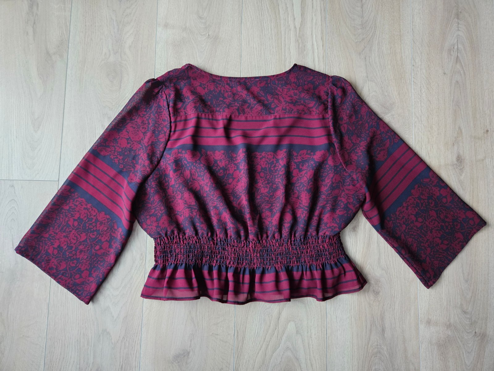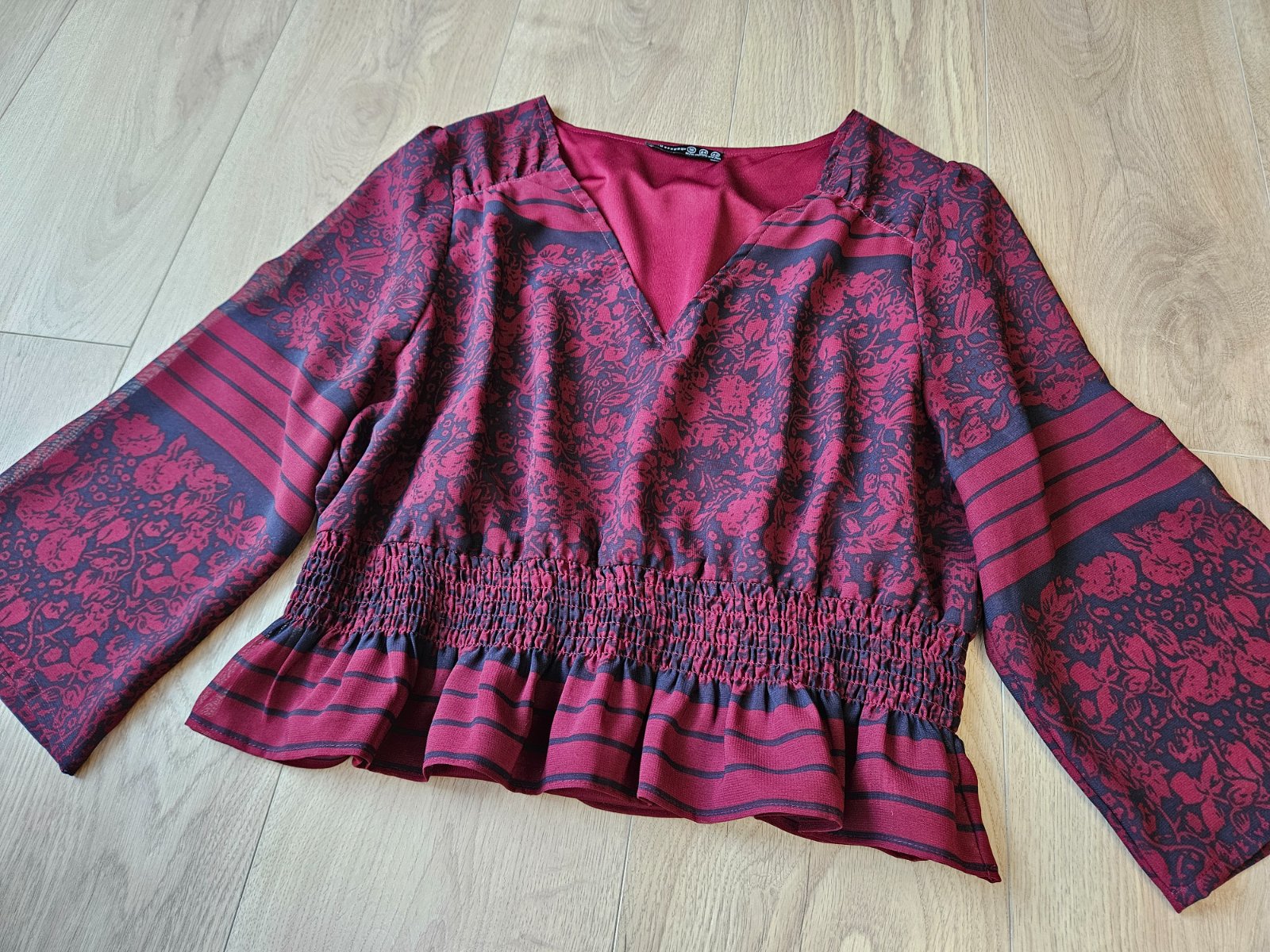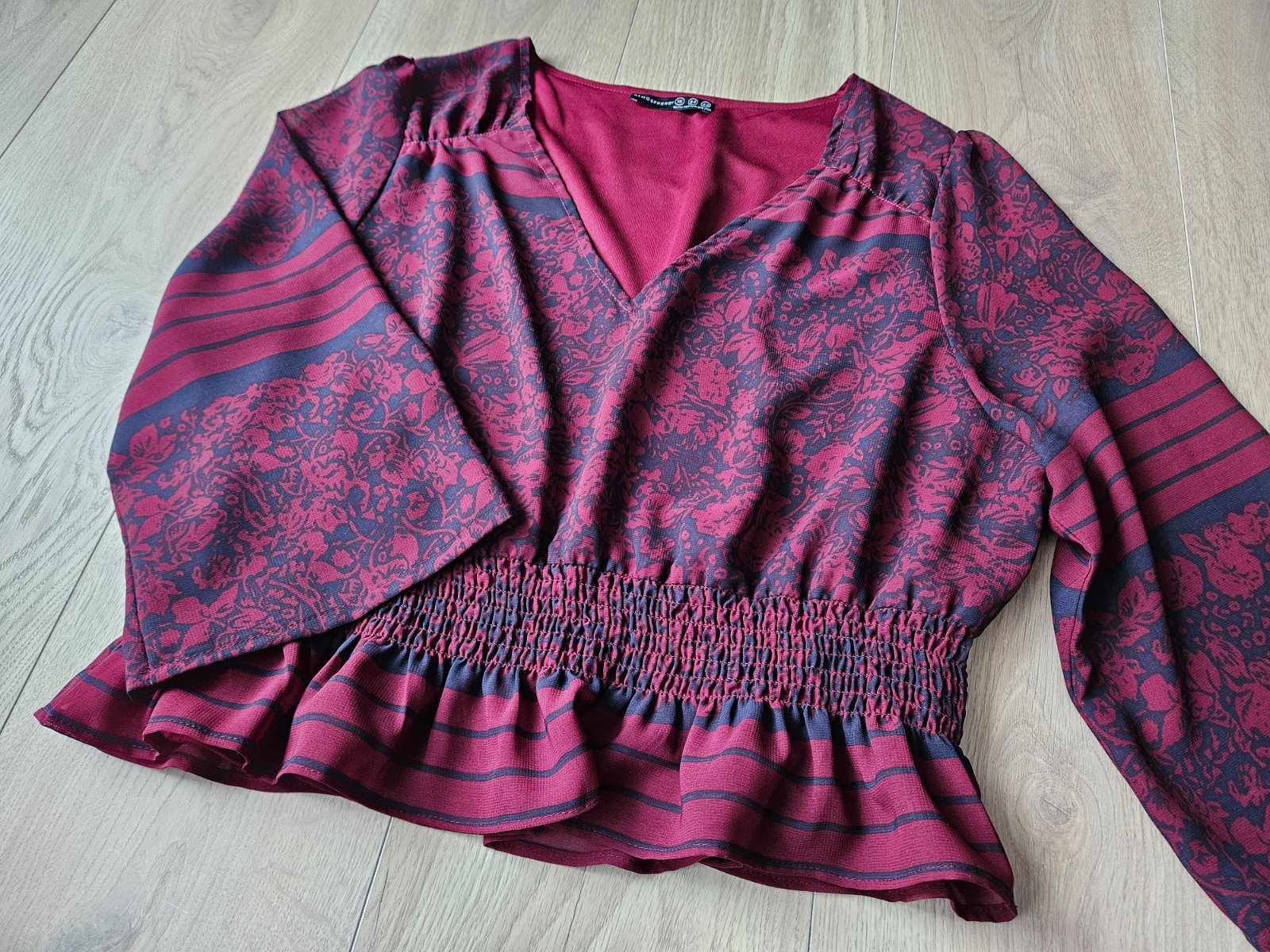Bordová blúzka s elastickým pásom a volánikom peplum.