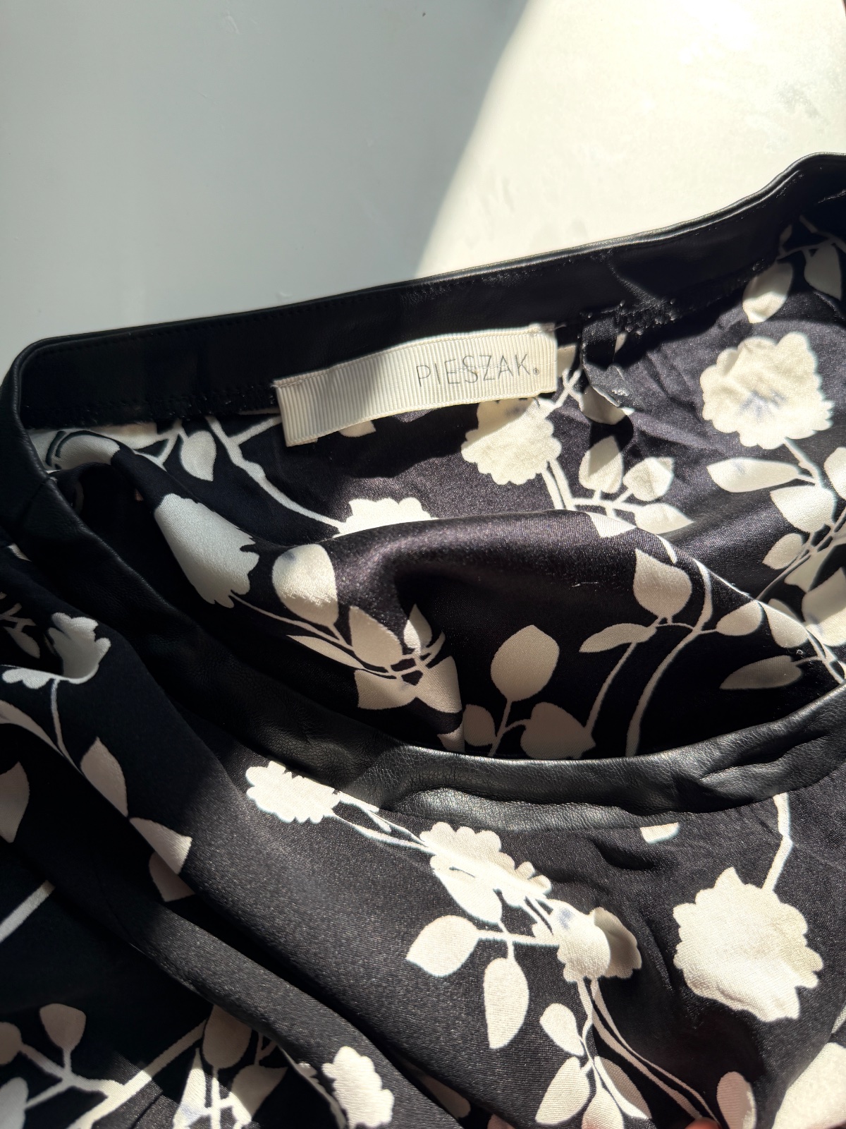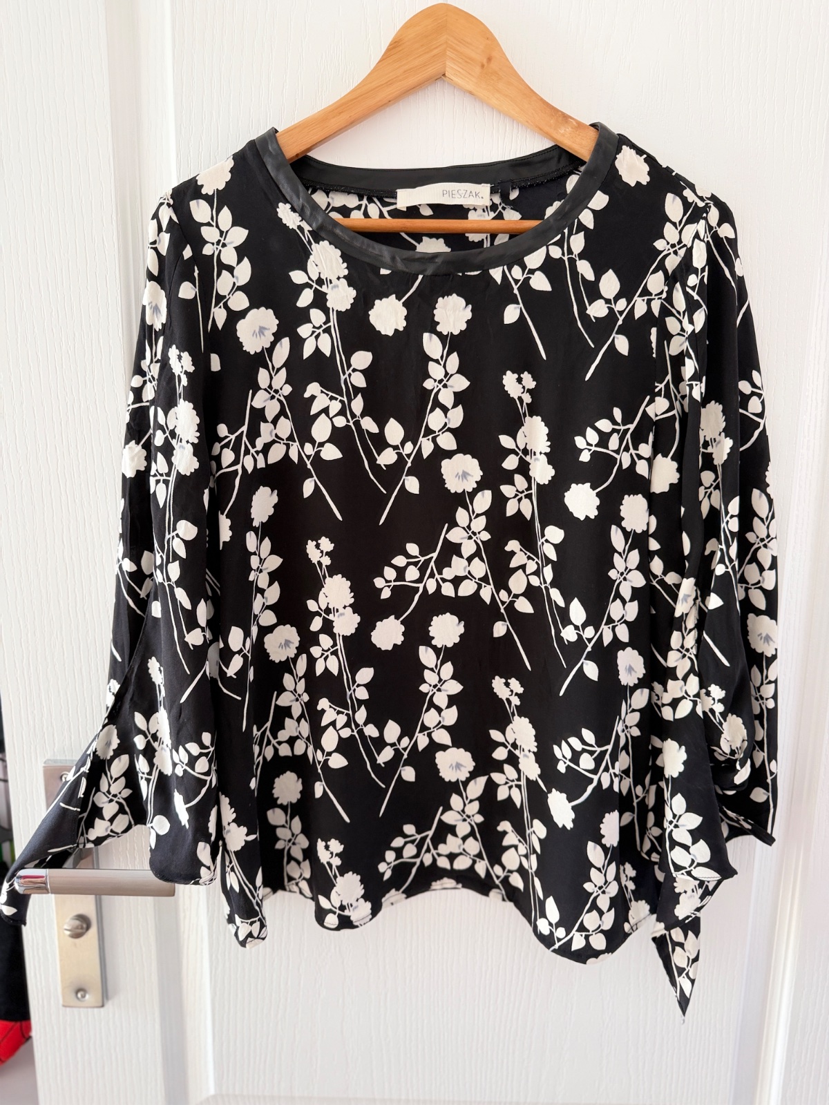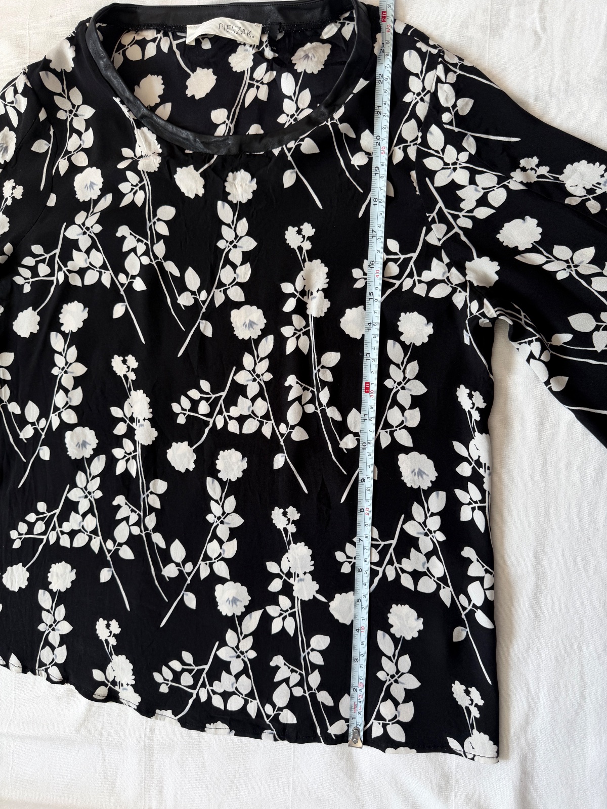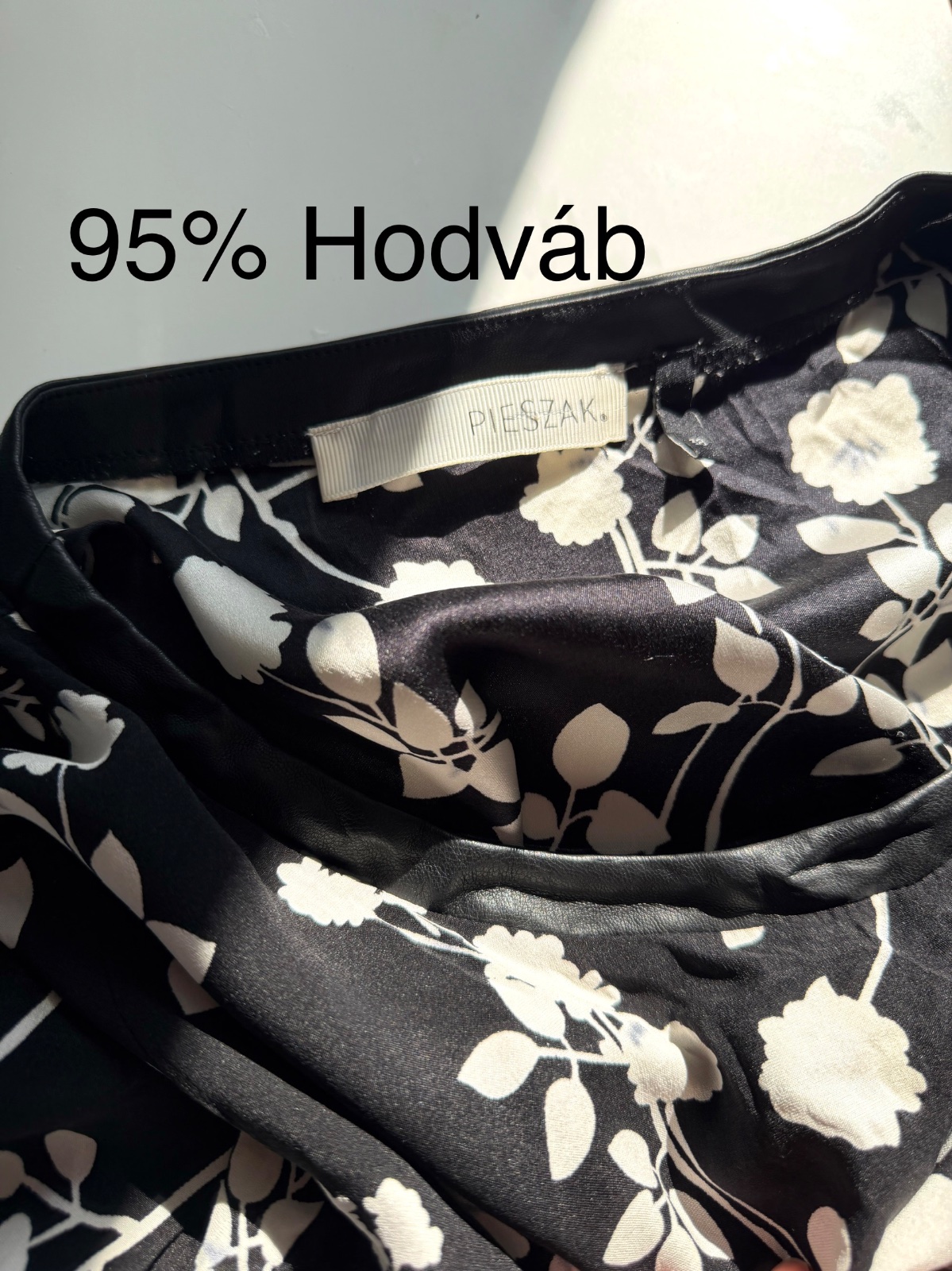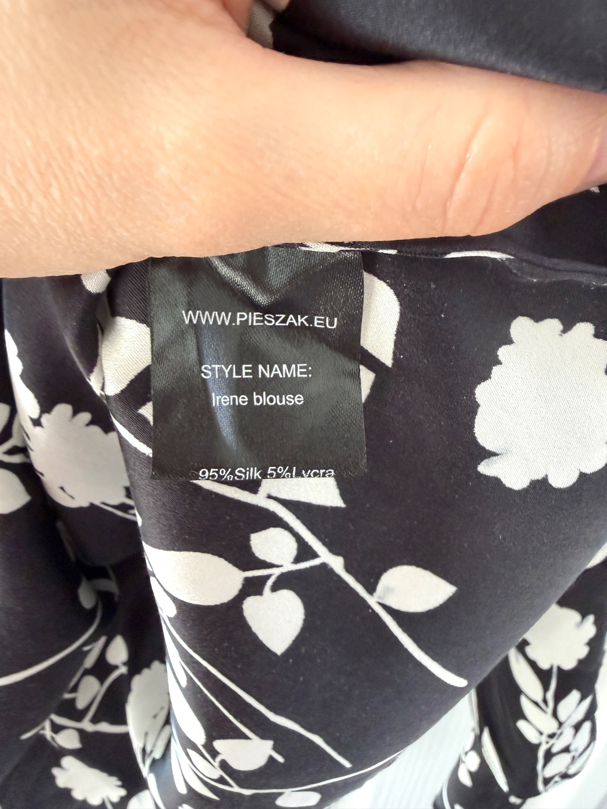 Skutočný klenot pre milovníkov jemných materiálov a jedinečných detailov. Táto blúzka od dánskej značky Pieszak, model Irene, kombinuje klasickú eleganciu s moderným nádychom. Nie je to len tak hocijaký polyester. Blúzka je vyrobená z 95 % prírodného hodvábu s 5 % Lycry. Vďaka tomu materiál krásne splýva, je neuveriteľne mäkký na pokožku a mierne elastický. Výstrih je zakončený štýlovým lemovaním s imitáciou kože. Rozparky na rukávoch sú zakončené výraznými striebornými prackami v štvorcovom tvare – ohromujúcim dojmom pri každom pohybe. Nadčasový biely kvetinový motív na tmavo čiernom pozadí. Veľkosť na etikete je 38; všetky miery sú na fotografiách. Blúzka vyzerá skvele s cigaretovými nohavicami aj s ihlovými nohavicami, ako aj s rovnými džínsami, ktorým pracky na rukávoch dodávajú šperkový vzhľad.