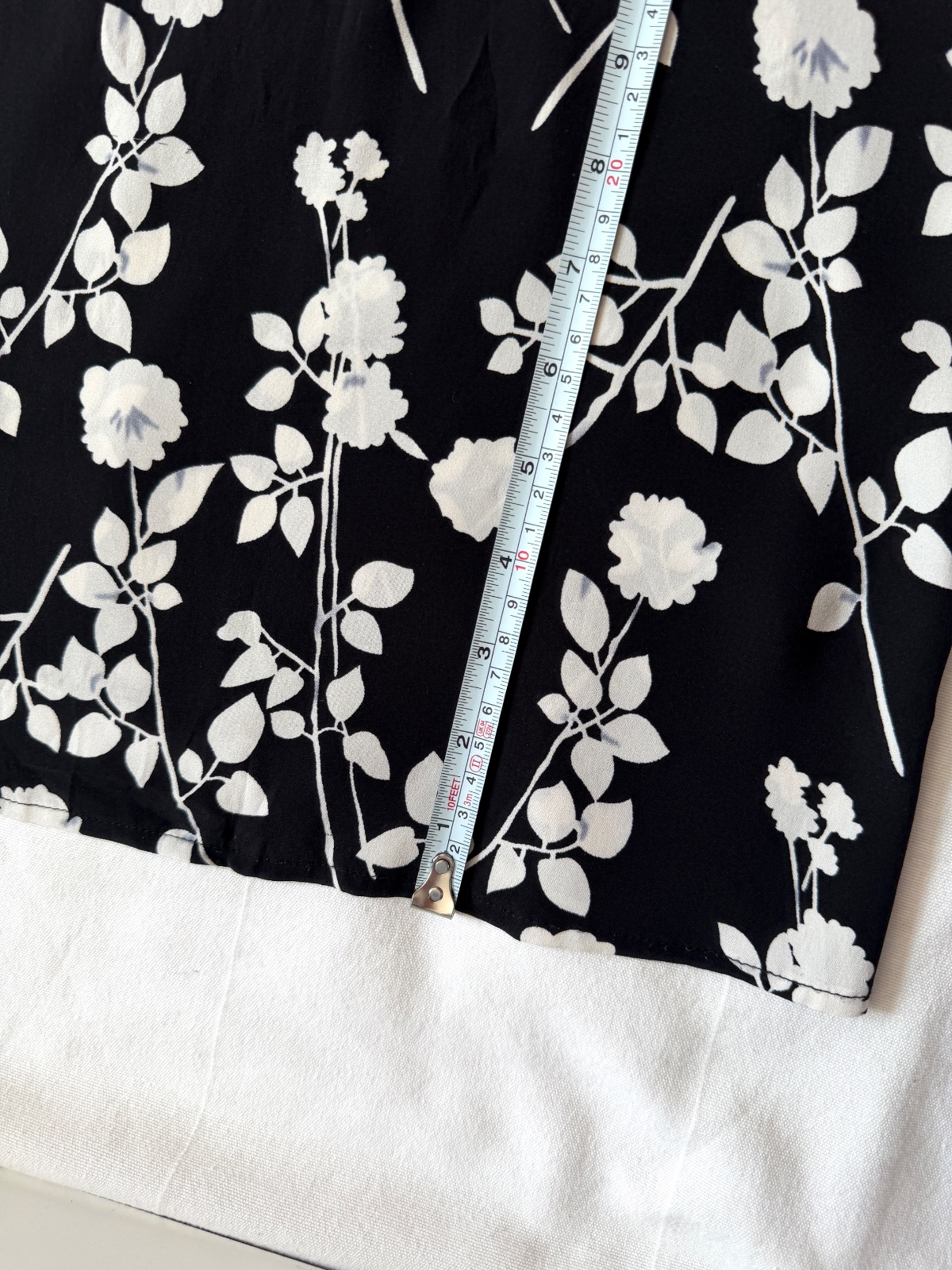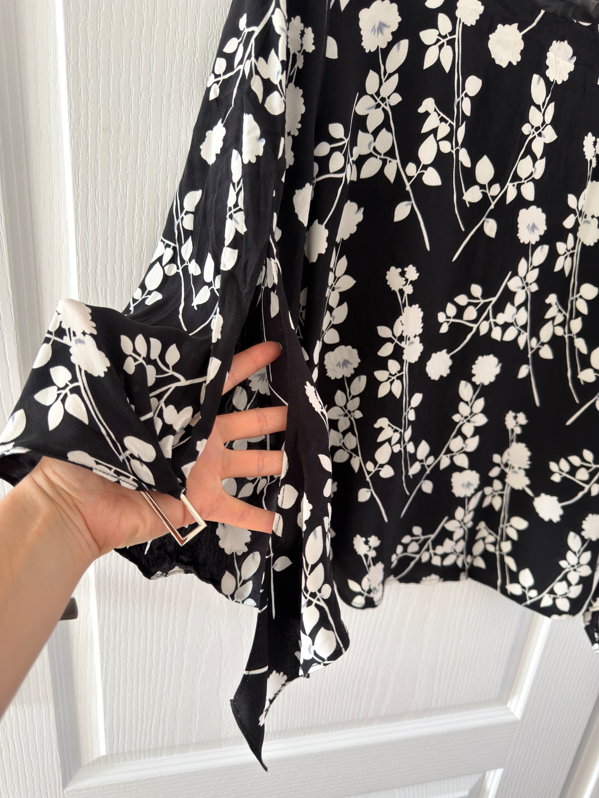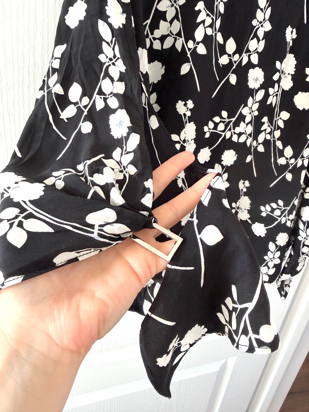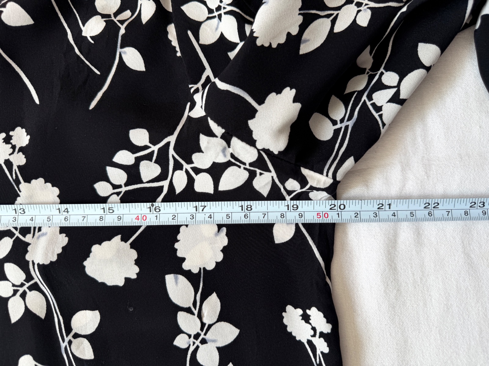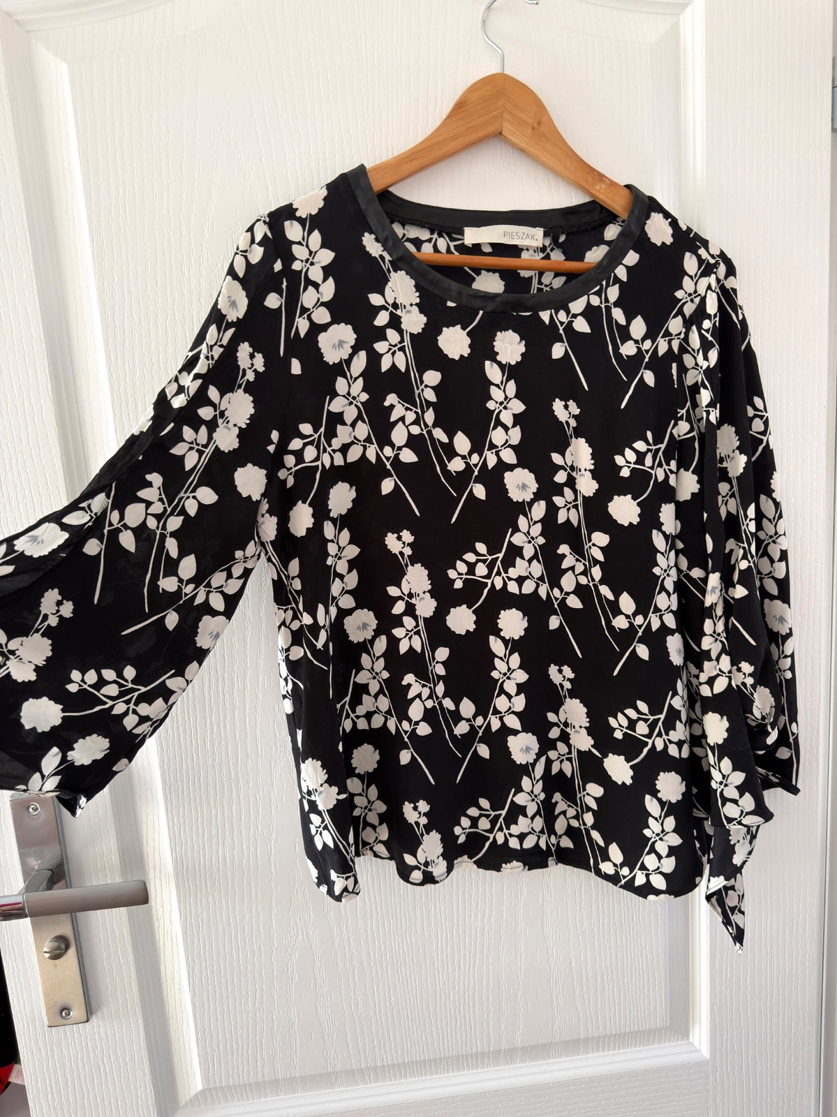 Skutočný klenot pre milovníkov jemných materiálov a jedinečných detailov. Táto blúzka od dánskej značky Pieszak, model Irene, kombinuje klasickú eleganciu s moderným nádychom. Nie je to len tak hocijaký polyester. Blúzka je vyrobená z 95 % prírodného hodvábu s 5 % Lycry. Vďaka tomu materiál krásne splýva, je neuveriteľne mäkký na pokožku a mierne elastický. Výstrih je zakončený štýlovým lemovaním s imitáciou kože. Rozparky na rukávoch sú zakončené výraznými striebornými prackami v štvorcovom tvare – ohromujúcim dojmom pri každom pohybe. Nadčasový biely kvetinový motív na tmavo čiernom pozadí. Veľkosť na etikete je 38; všetky miery sú na fotografiách. Blúzka vyzerá skvele s cigaretovými nohavicami aj s ihlovými nohavicami, ako aj s rovnými džínsami, ktorým pracky na rukávoch dodávajú šperkový vzhľad.