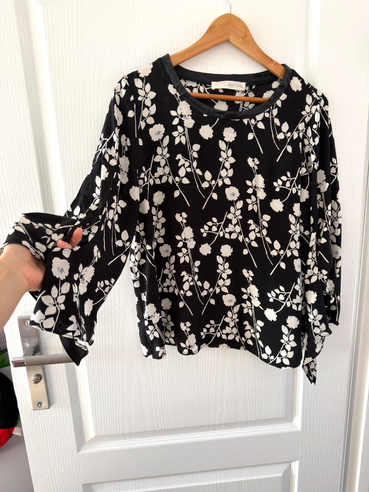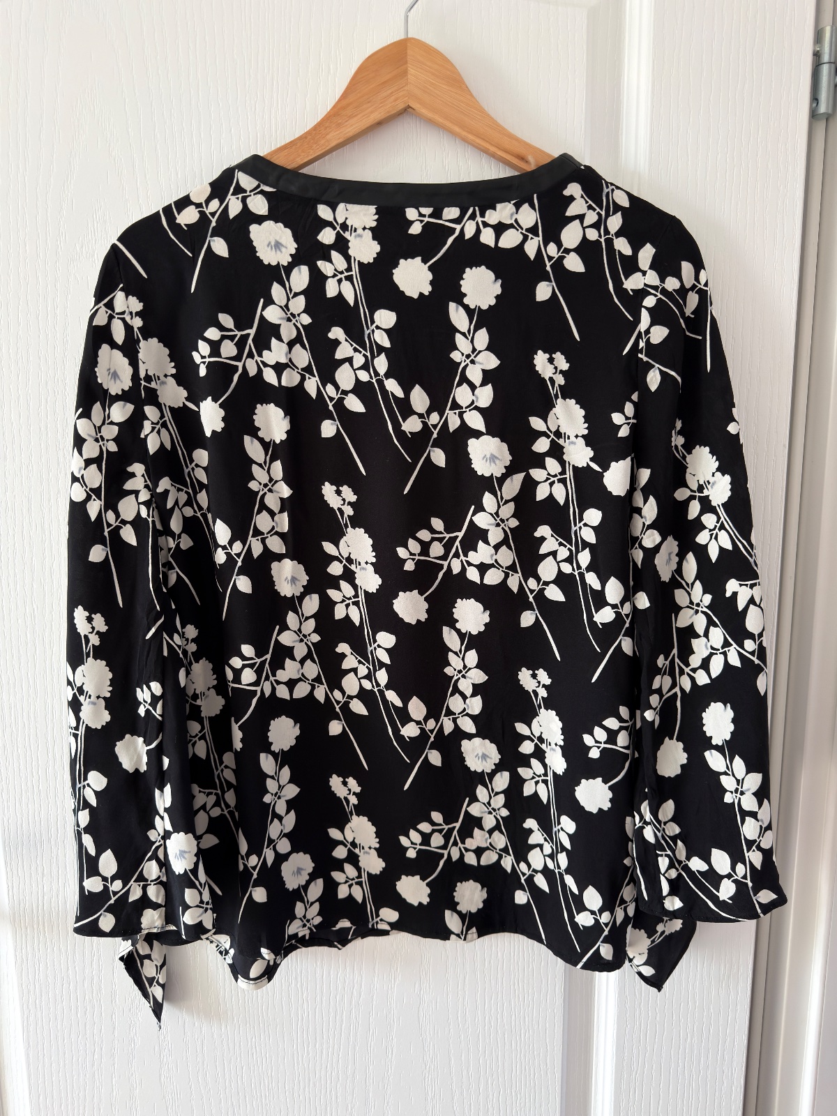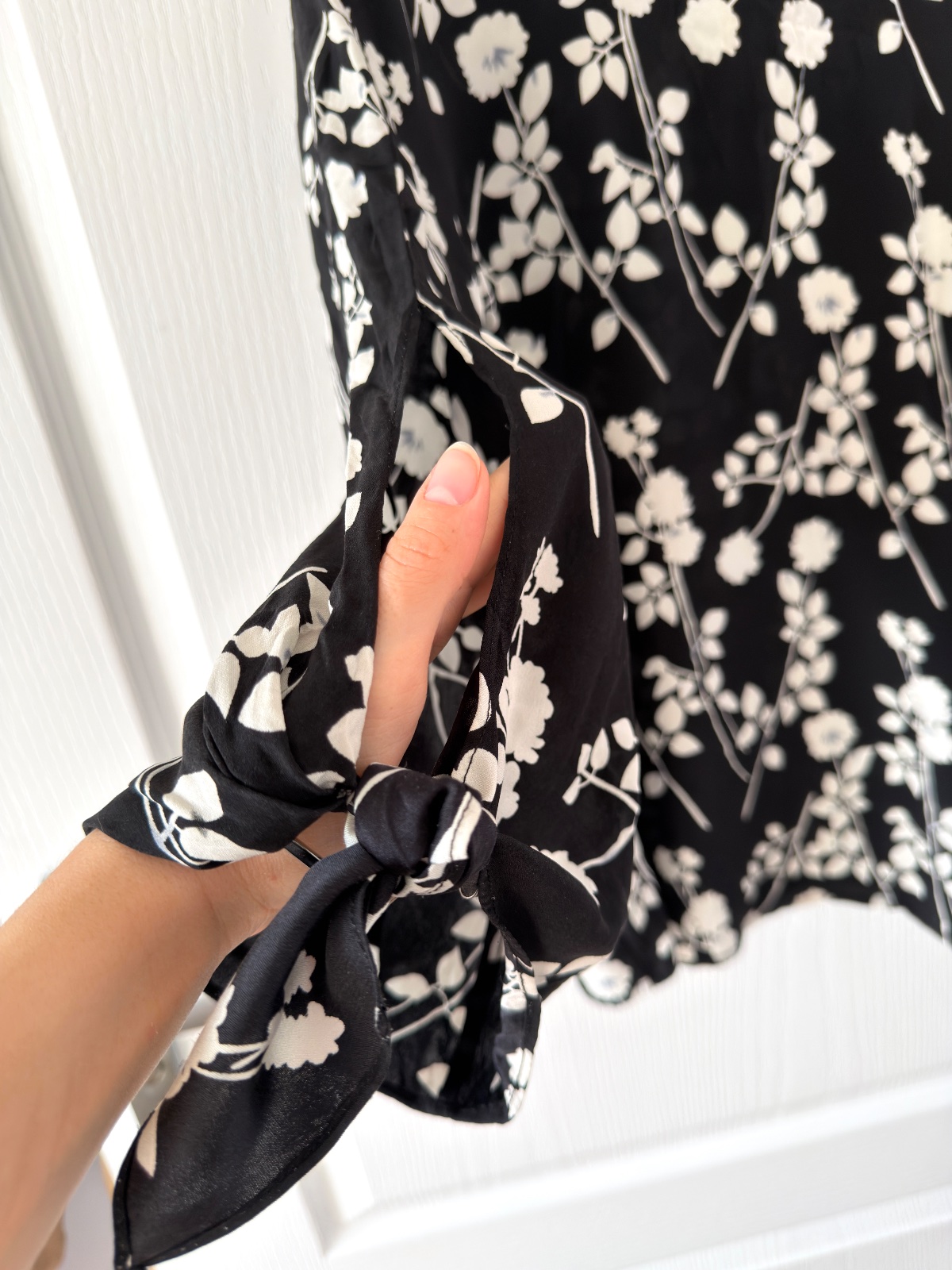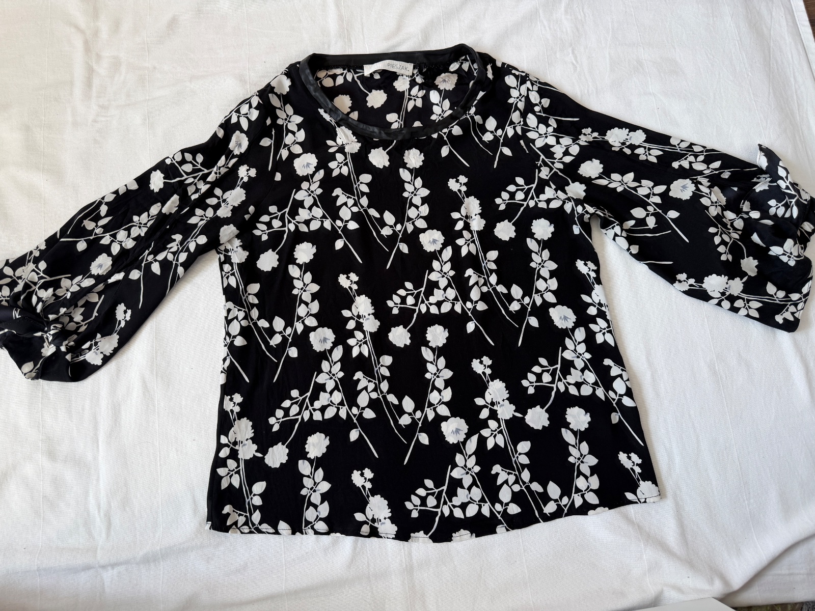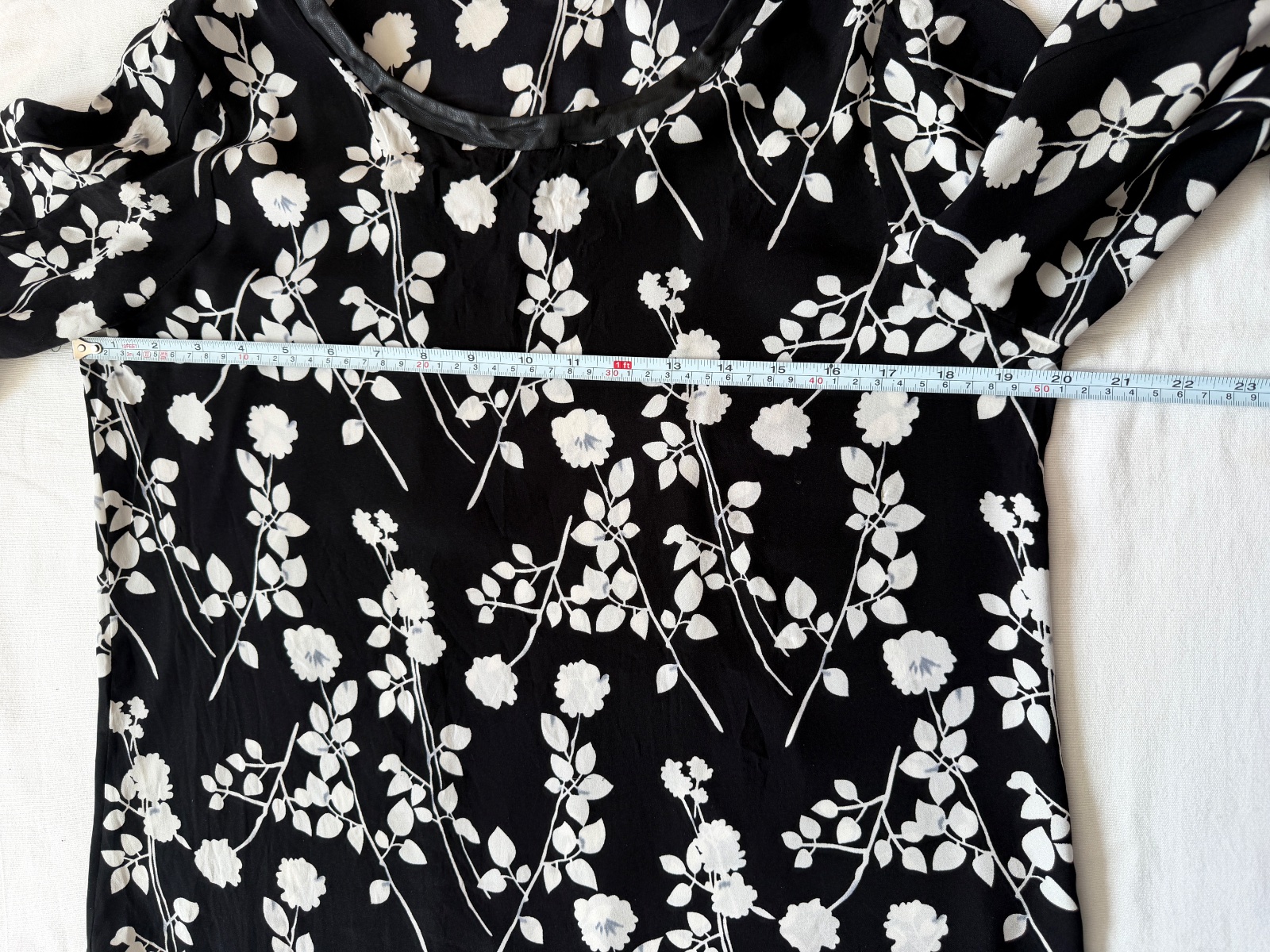 Skutočný klenot pre milovníkov jemných materiálov a jedinečných detailov. Táto blúzka od dánskej značky Pieszak, model Irene, kombinuje klasickú eleganciu s moderným nádychom. Nie je to len tak hocijaký polyester. Blúzka je vyrobená z 95 % prírodného hodvábu s 5 % Lycry. Vďaka tomu materiál krásne splýva, je neuveriteľne mäkký na pokožku a mierne elastický. Výstrih je zakončený štýlovým lemovaním s imitáciou kože. Rozparky na rukávoch sú zakončené výraznými striebornými prackami v štvorcovom tvare – ohromujúcim dojmom pri každom pohybe. Nadčasový biely kvetinový motív na tmavo čiernom pozadí. Veľkosť na etikete je 38; všetky miery sú na fotografiách. Blúzka vyzerá skvele s cigaretovými nohavicami aj s ihlovými nohavicami, ako aj s rovnými džínsami, ktorým pracky na rukávoch dodávajú šperkový vzhľad.