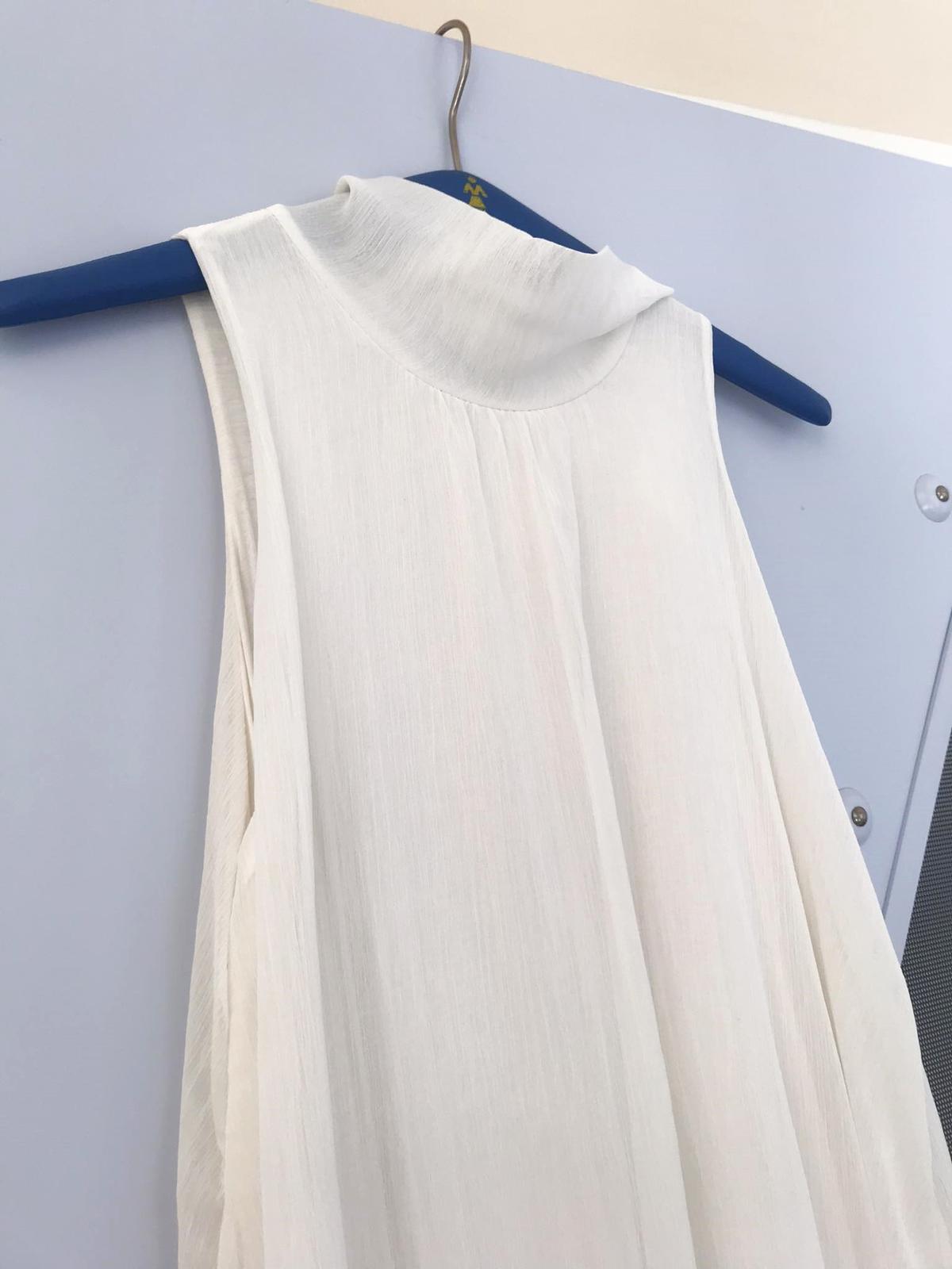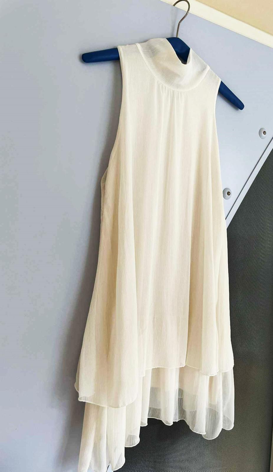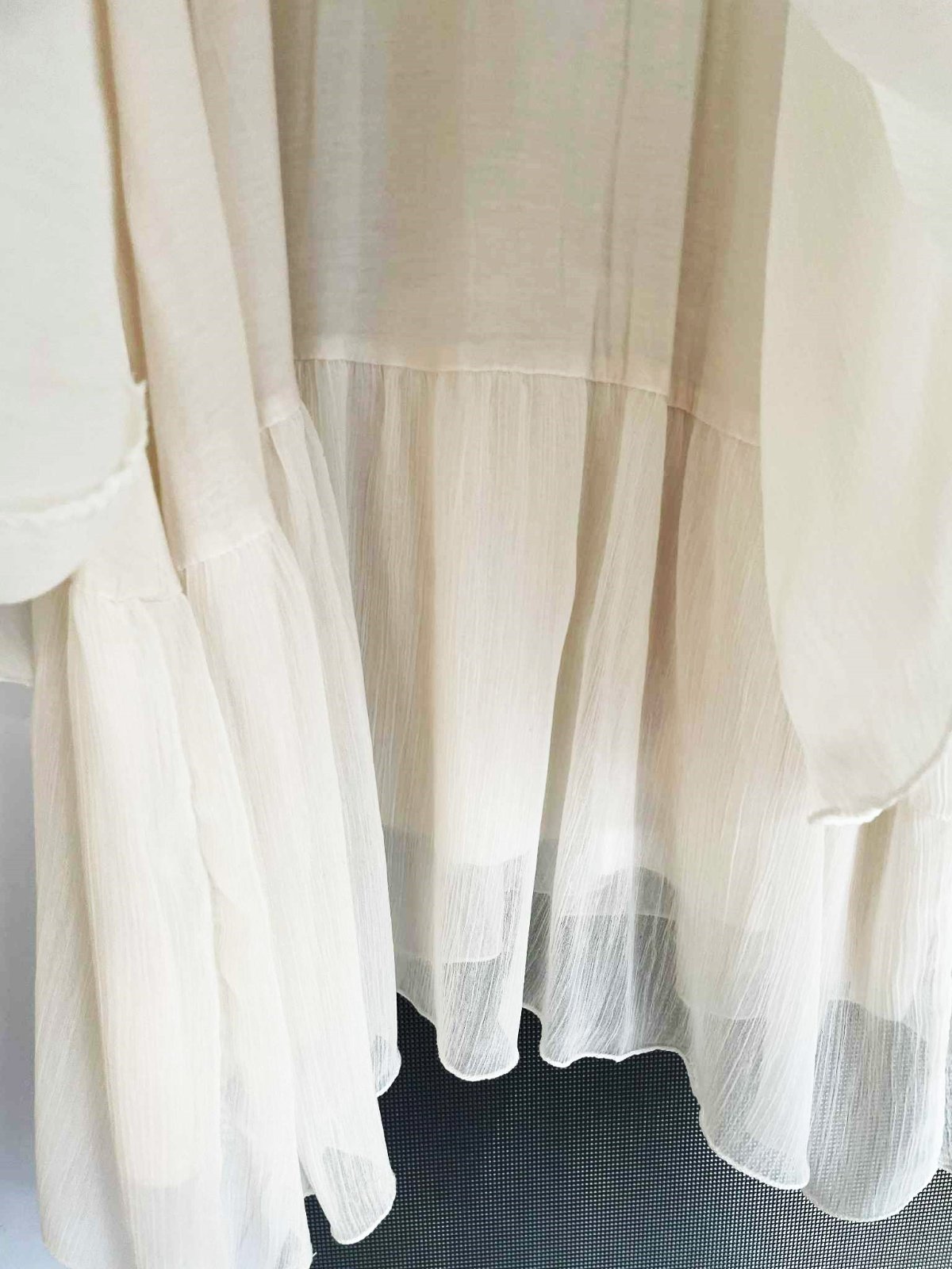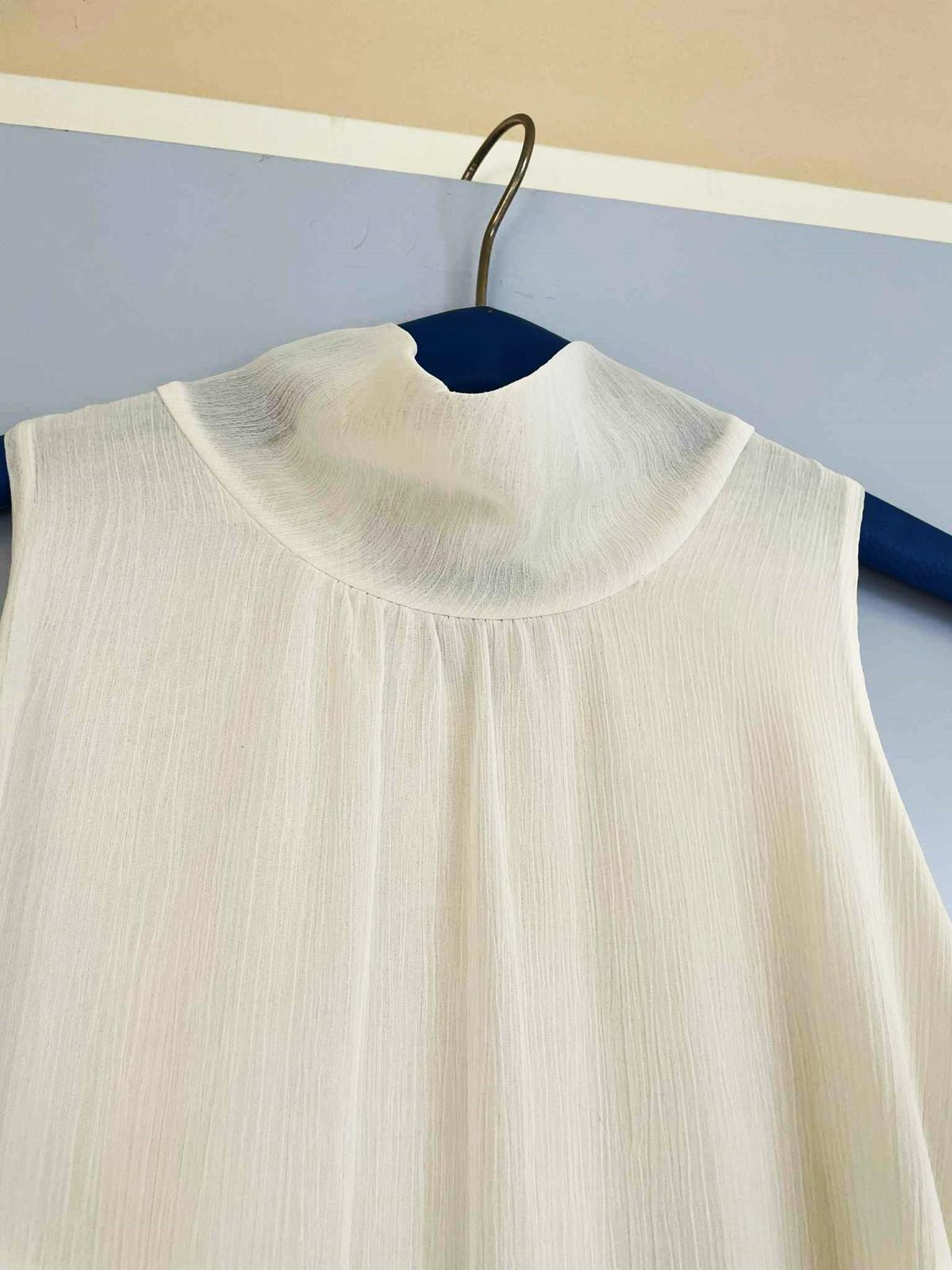jemný zaujímavý dlhší top, vrstvený, na spodku je tenučká tričkovina ukončená dlhším mušelínom,ktorý prečnieva zo spodu popod vrchný diel,ktorý je kratší,krásne riešený stojačik ukončený stužkami na uväzovanie,šírka = 50 x 2 cm,dlžka od pazuchy dole = 60 cm,95% viskóza,5% elastan,super aj k dlhým legínam,ale nielen,krásne zamaskuje väčšie prsia