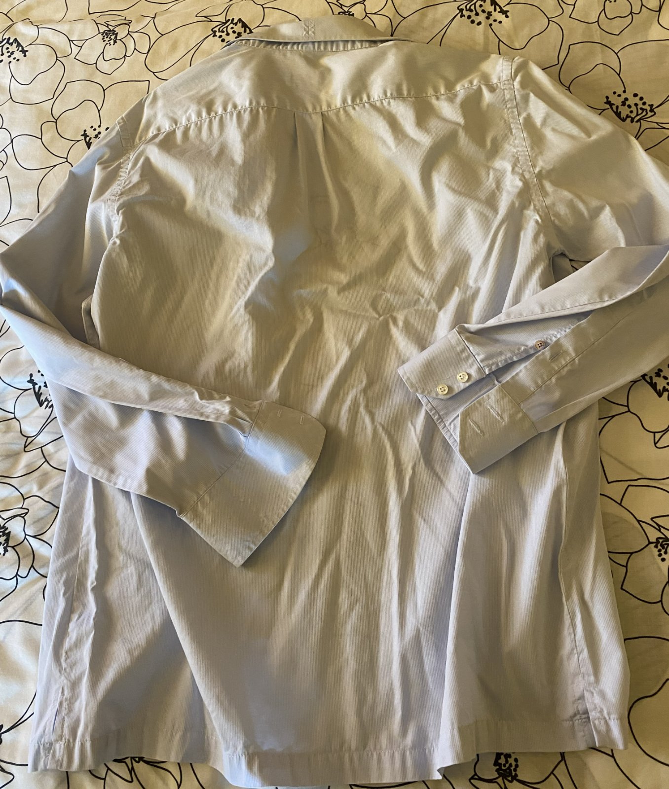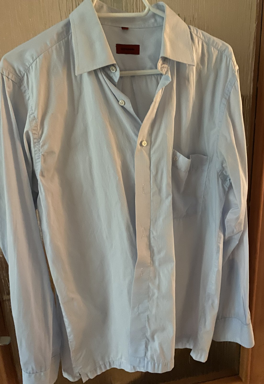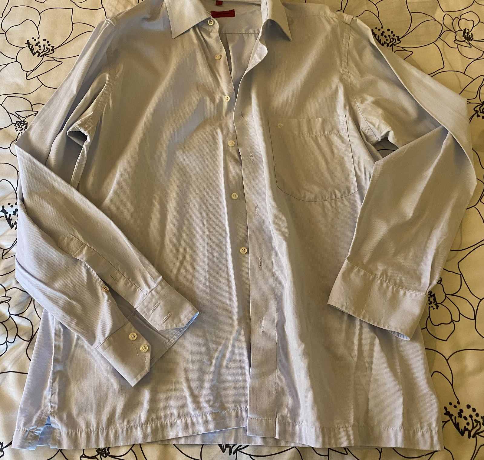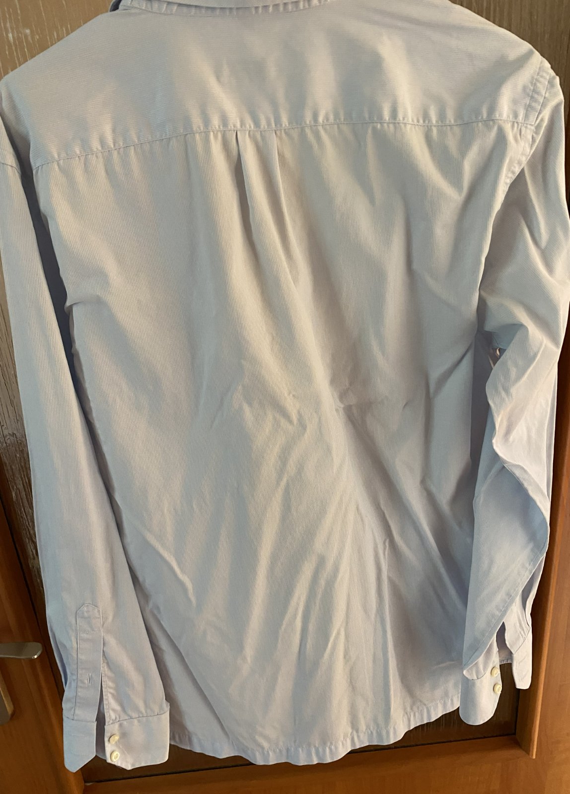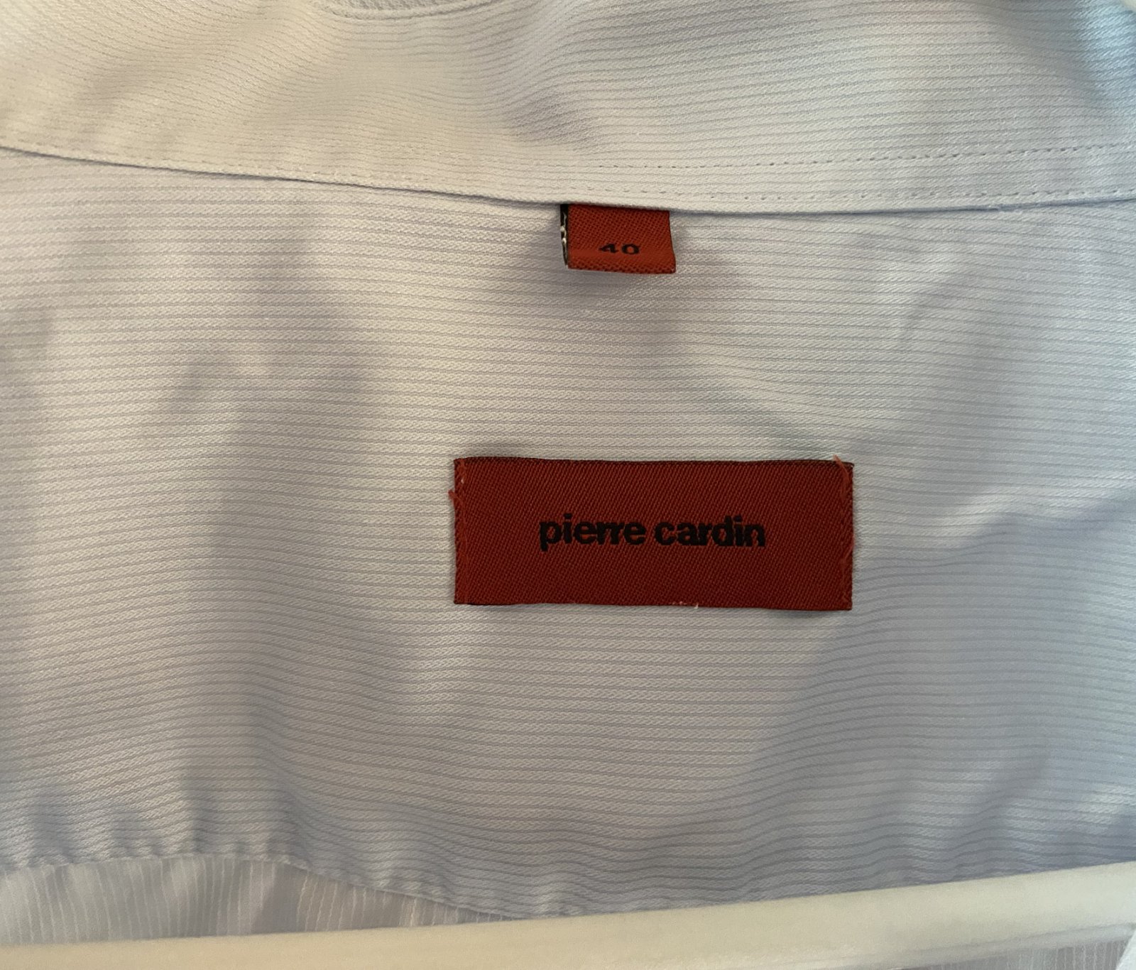 Bavlnená košeľa Pierre Cardin v. 40, kvalitne prepracovaná, kopa pekných detailov, materiál 100% bavlna, farba bledučko modrá-biela (jemné prúžky) - viď detail. foto - niektoré osvietené, na bokoch rozpárky, kupovaná nová, málo nosená na striedačku s inými. Na jednom rukáve chýba malý farebný gombík na zapínanie - v spodnej časti je náhradný, treba prešiť. Miery: dĺžka od krku dolu: 72cm, šírka: 54cmx2.