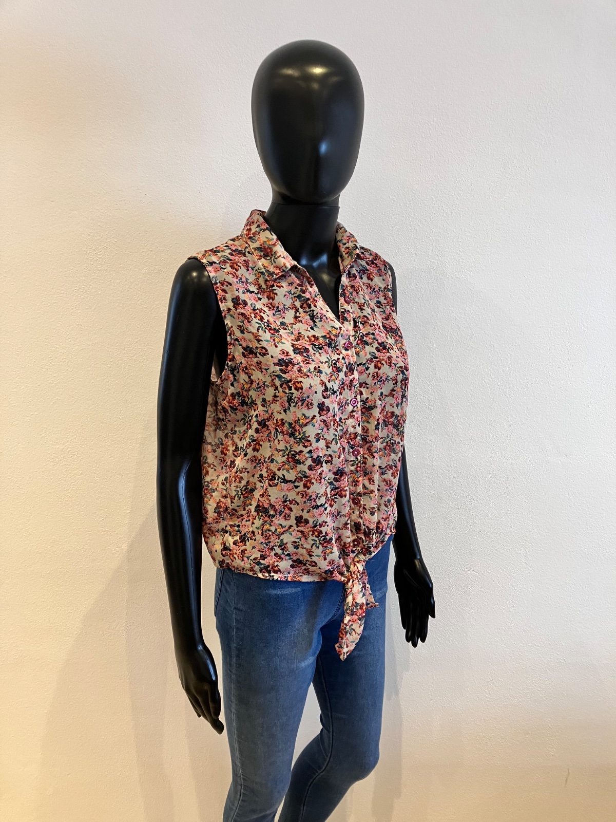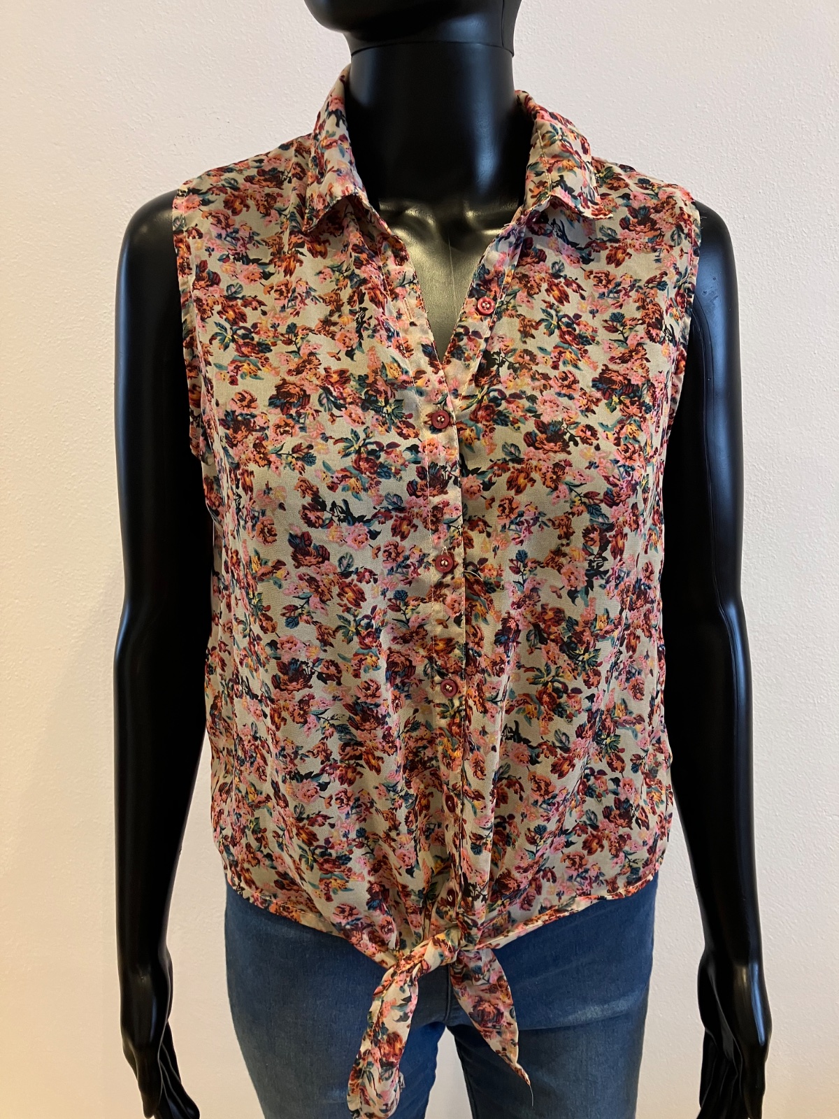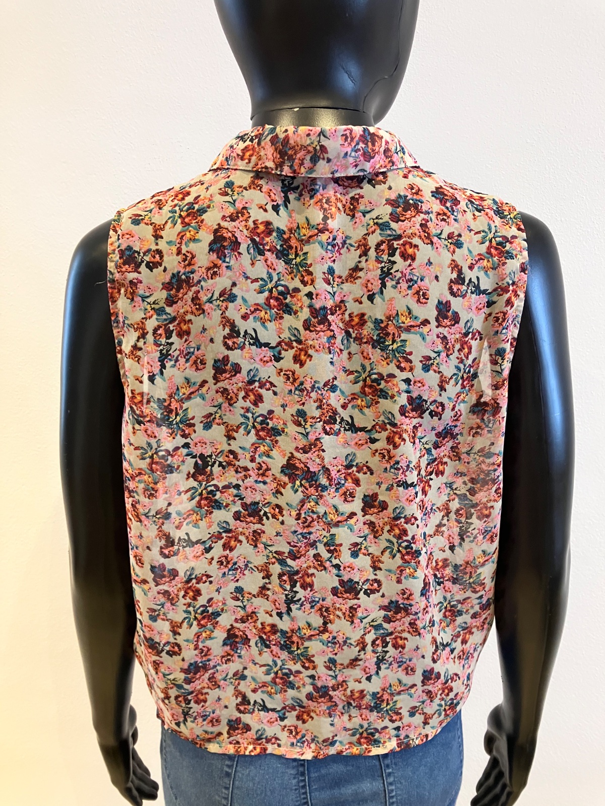 Kvetovaná blúzka bez rukávov, veľmi tenká, priesvitná, zapínanie na gombíky, materiál 100% polyester.