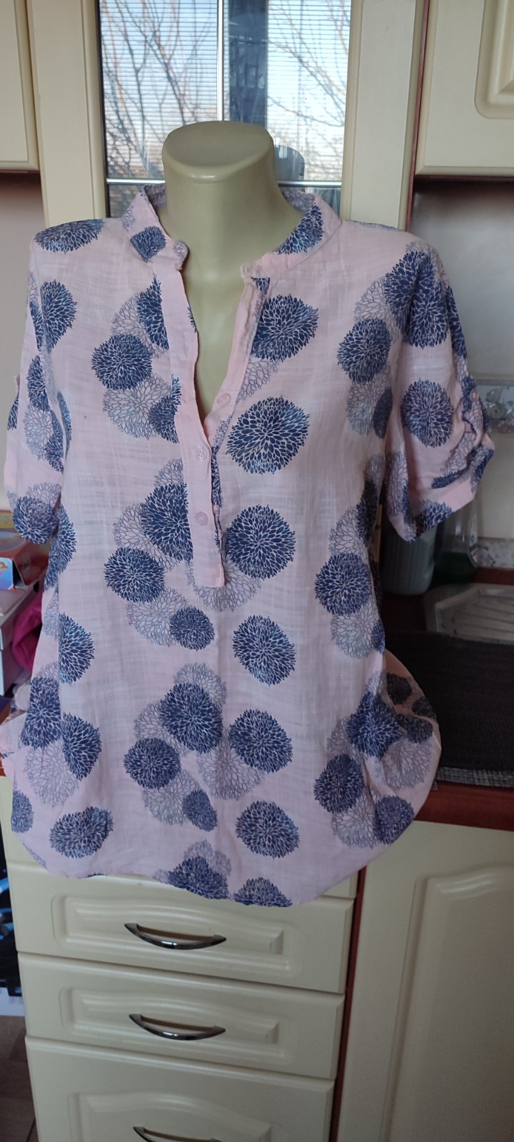 Krásna blúzka ružovo modrej farby. Iba vyprata. Dĺžka je 65 cm a šírka je 54 cm.