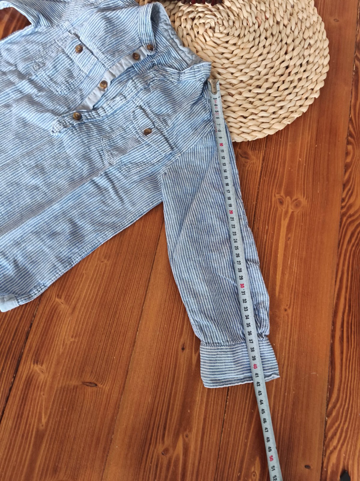 Pekná ľanová košela vo veľmi zachovalom stave. Jedine dva malé fľaky, ani ich nevidieť pokiaľ sa na ne nezameriate. Snažila som sa odfotiť, no veľmi to nevidieť. Inak bez poškodení. Stále pekná. Rozmery uvedené na foto.