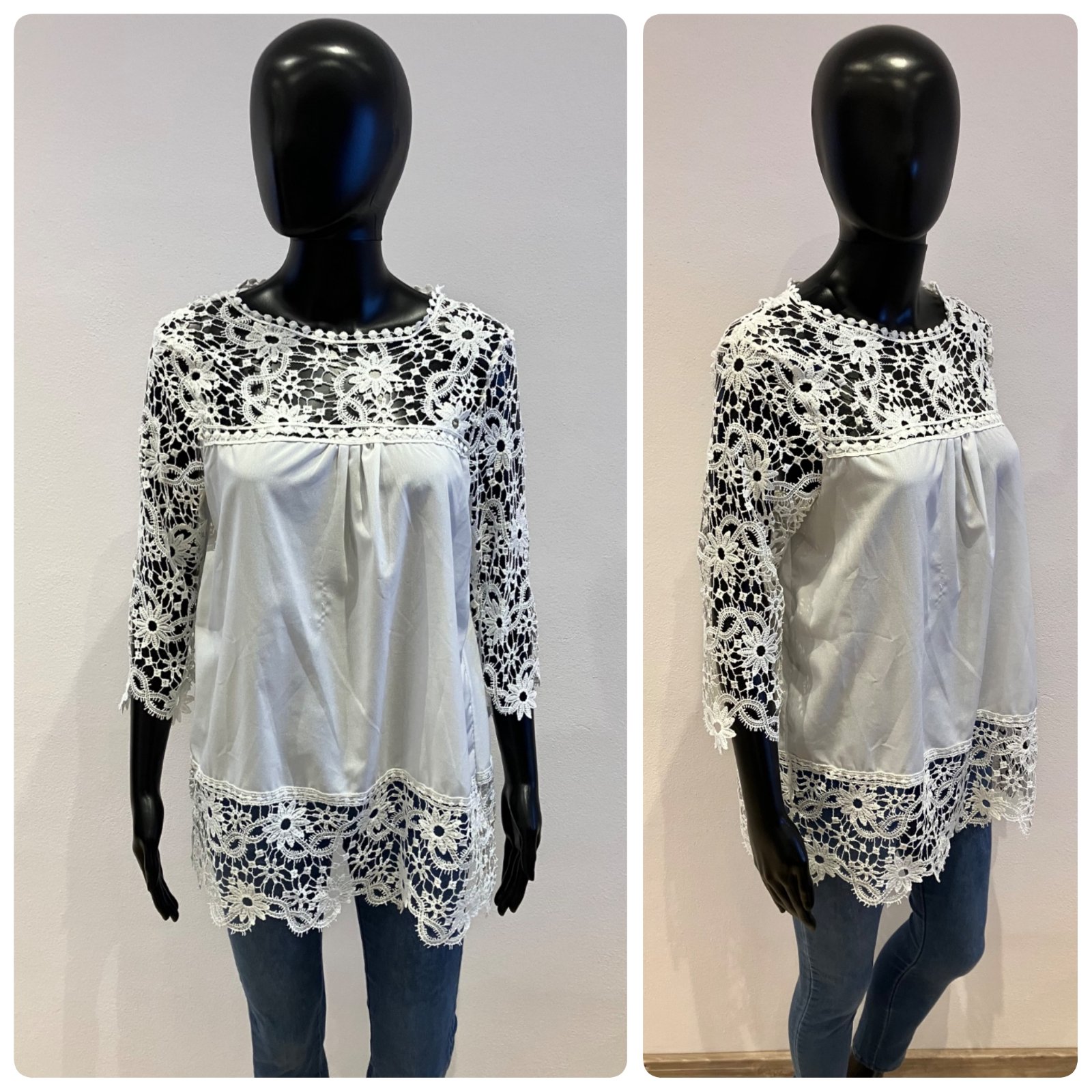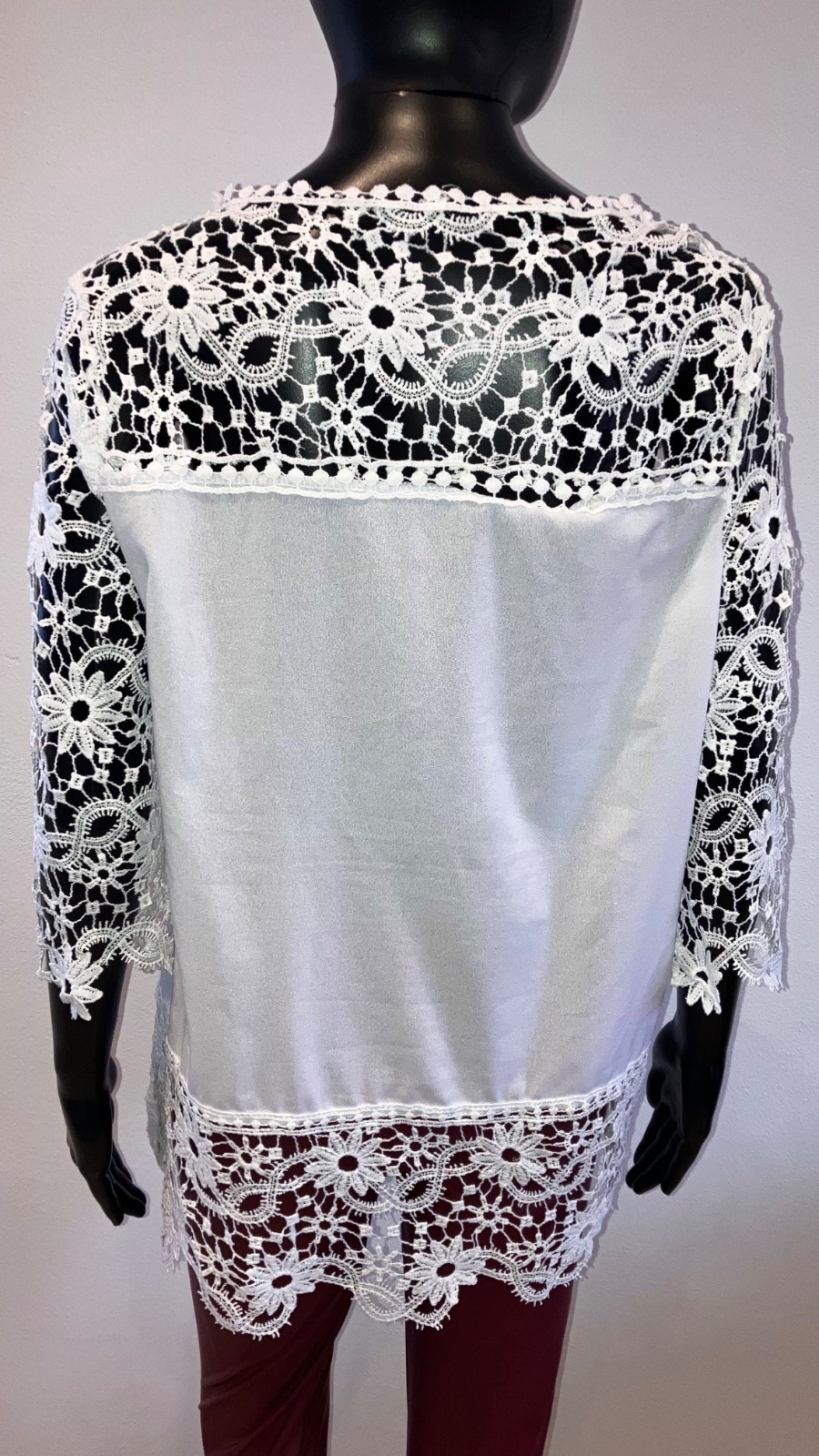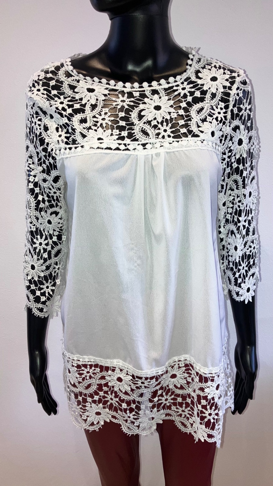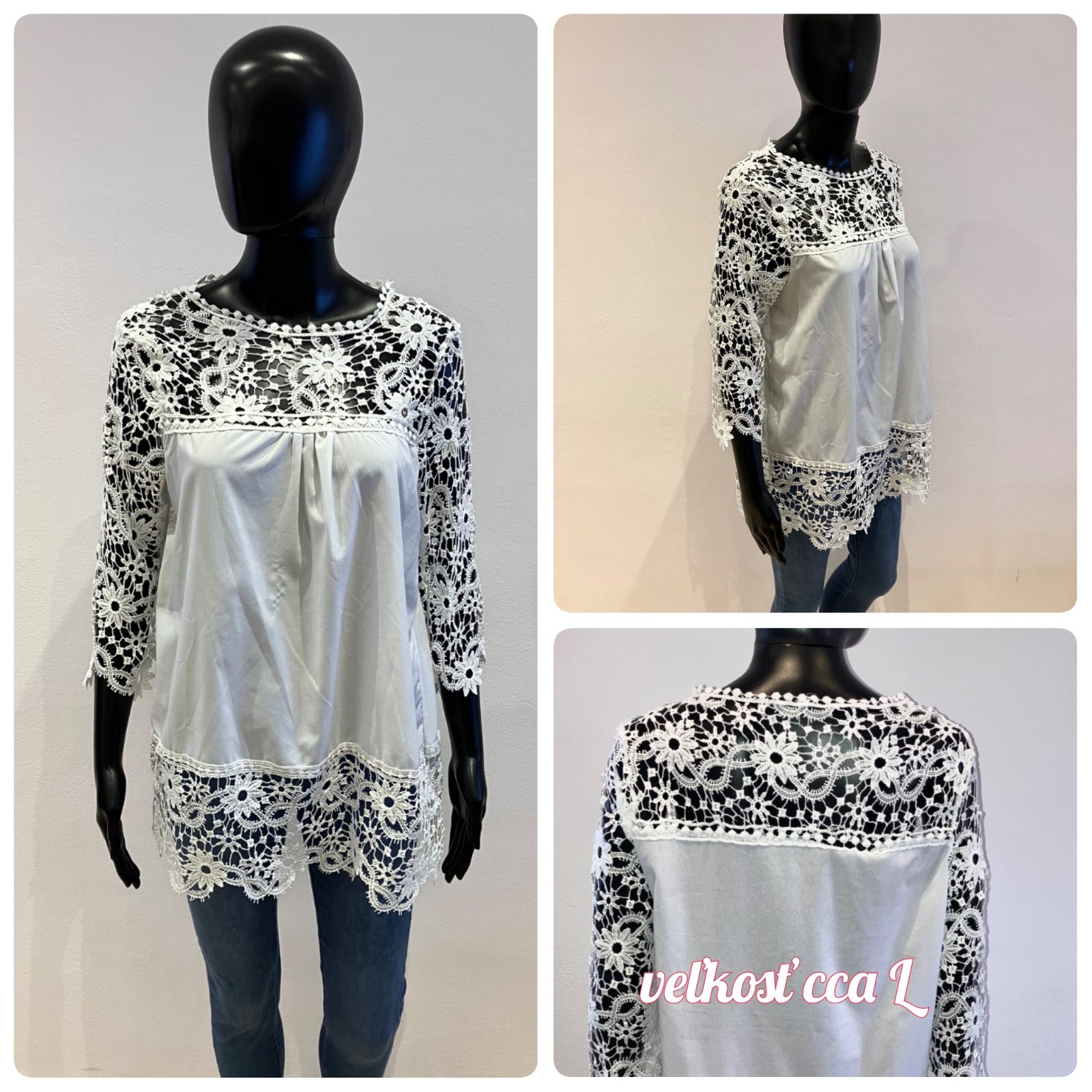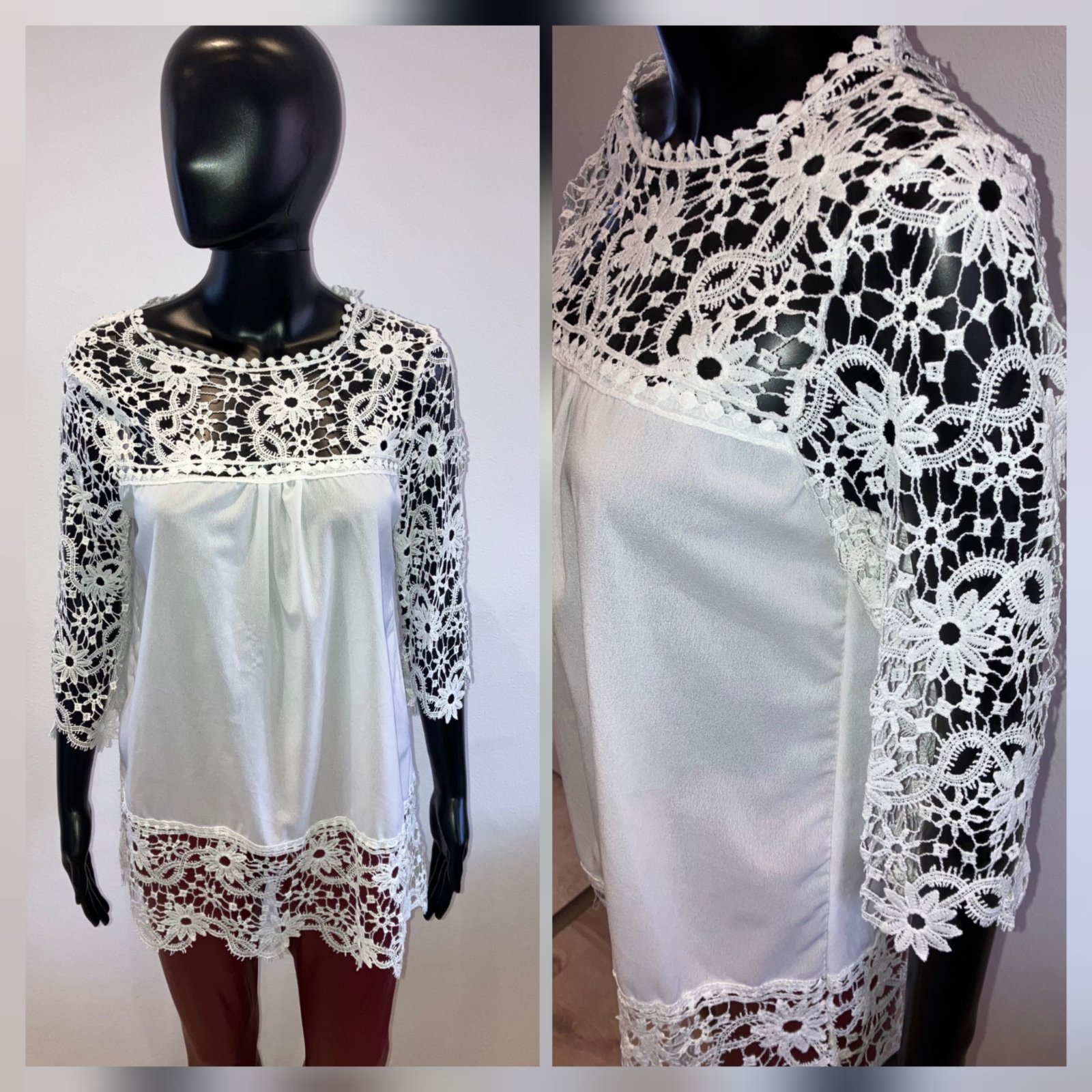 Dámska šifónová predĺžená blúzka v bielej farbe doplnená krajkovaným detailom, s trojštvrťovým rukávom, elastická. Veľkosť cca L.