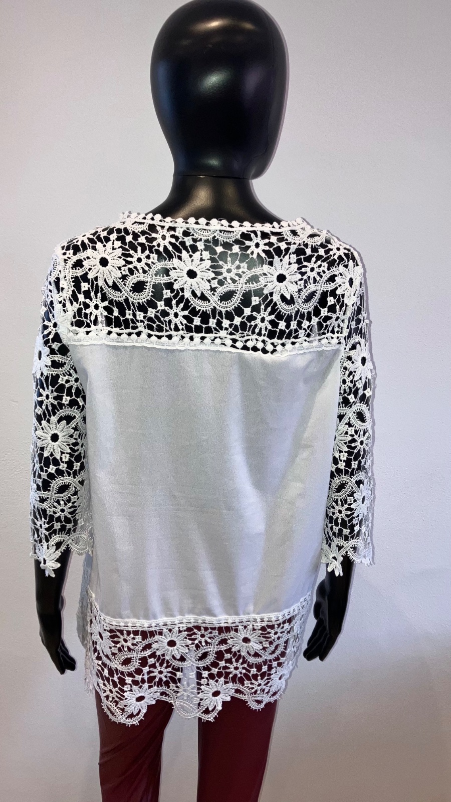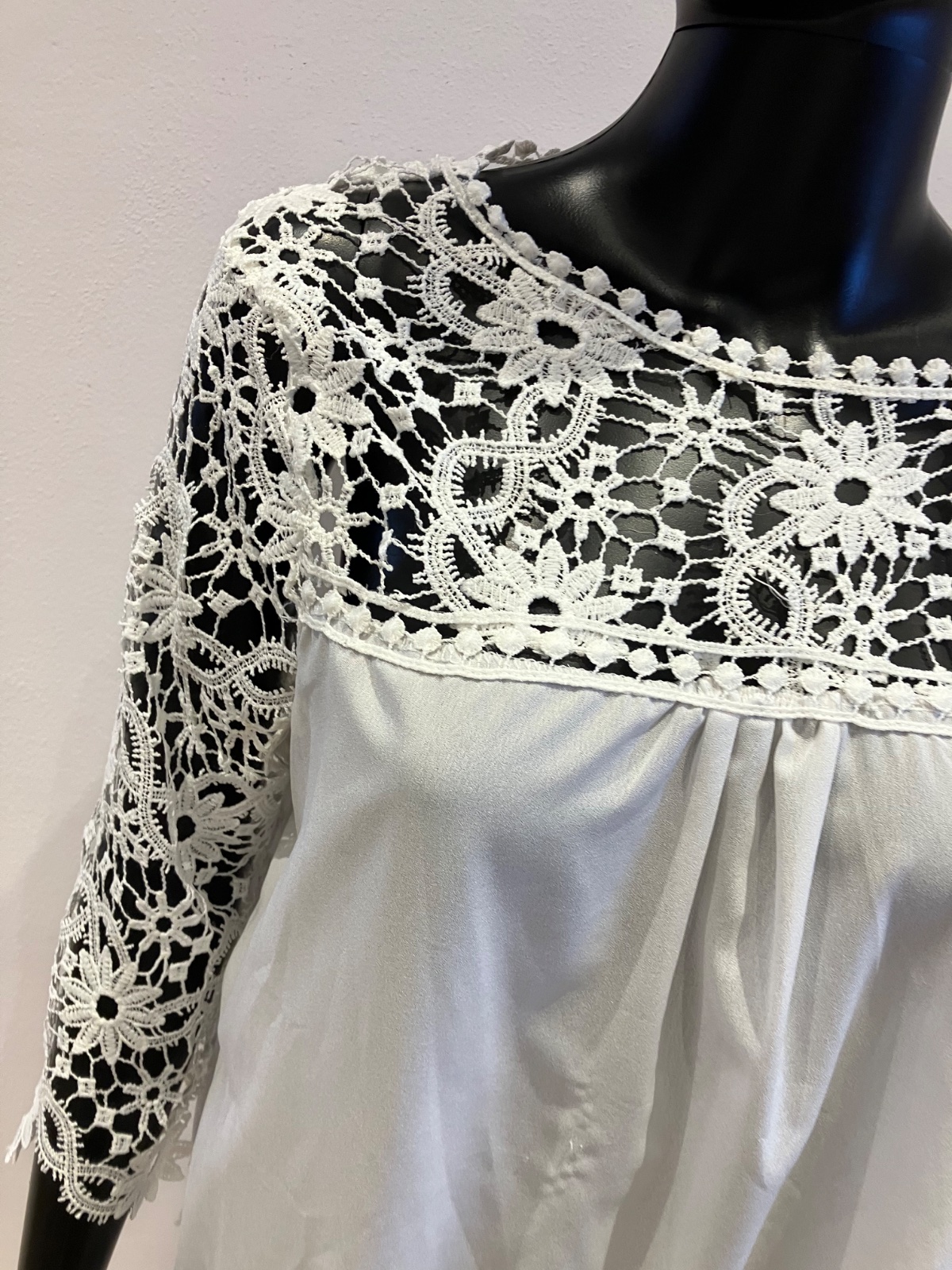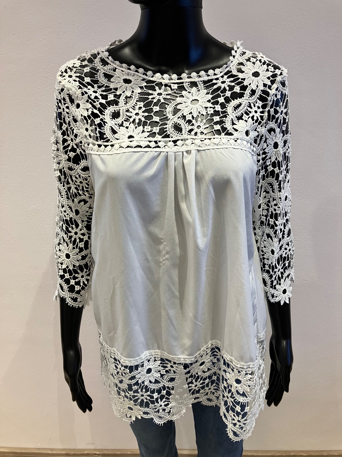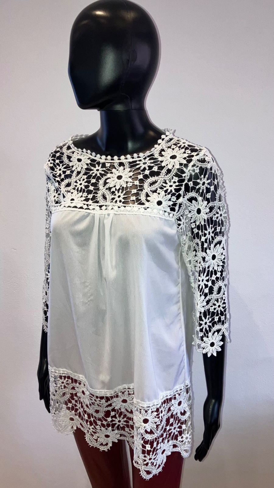 Dámska šifónová predĺžená blúzka v bielej farbe doplnená krajkovaným detailom, s trojštvrťovým rukávom, elastická. Veľkosť cca L.