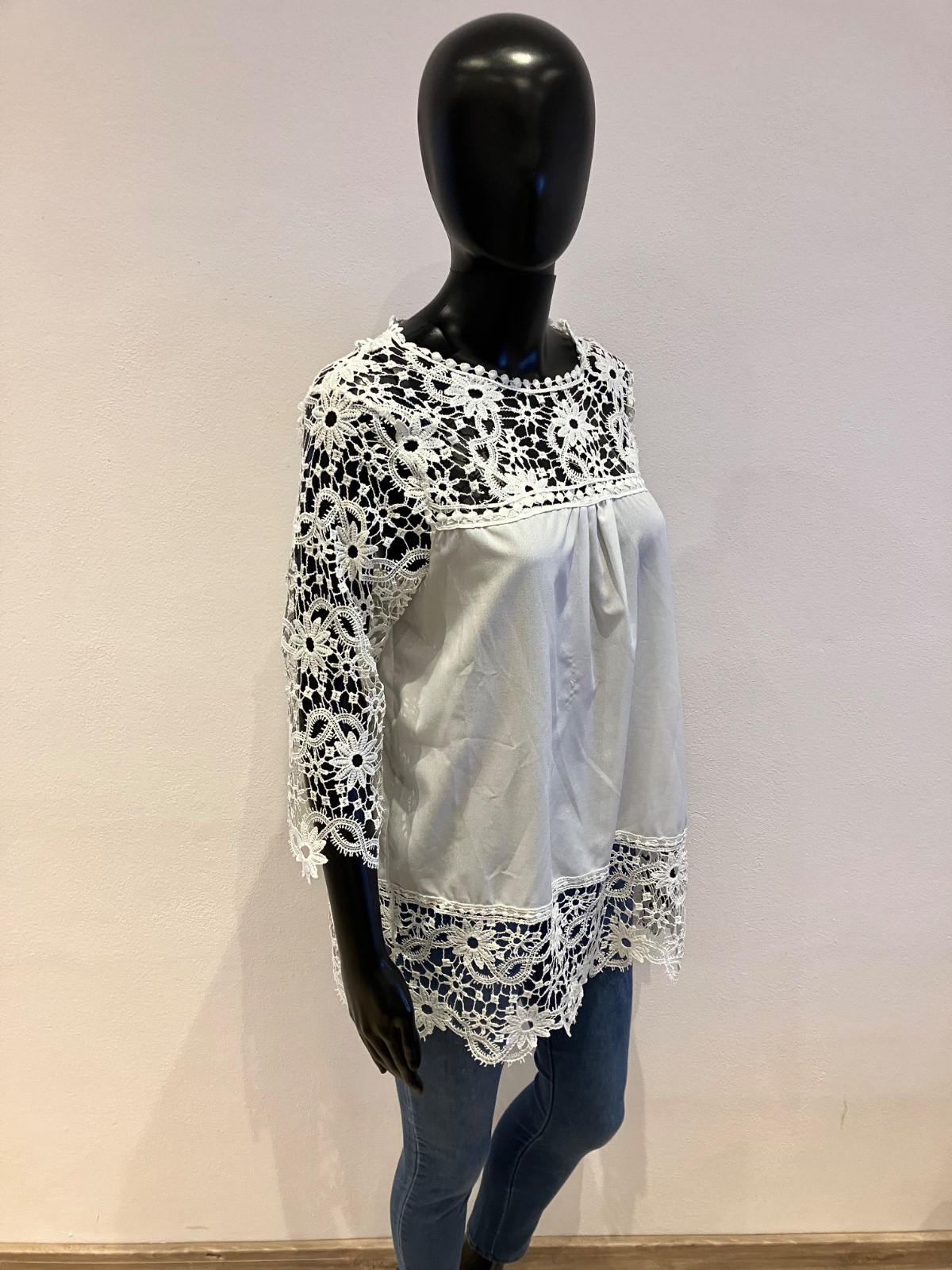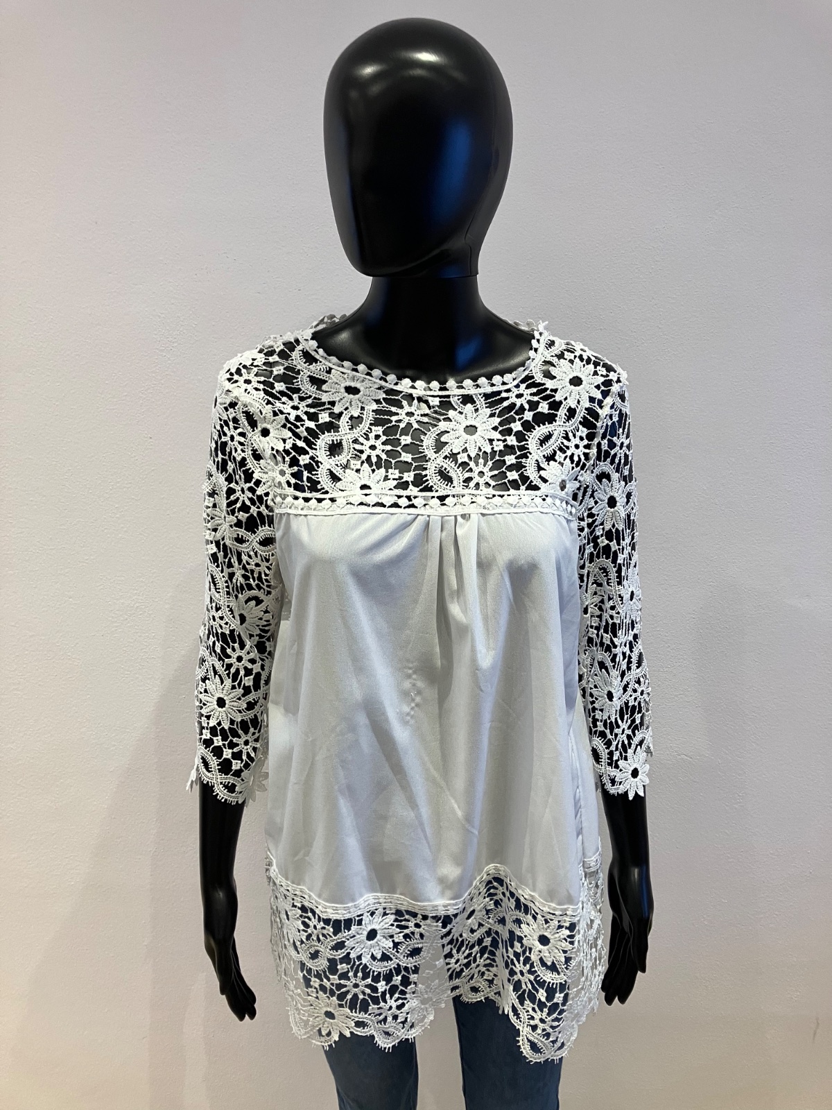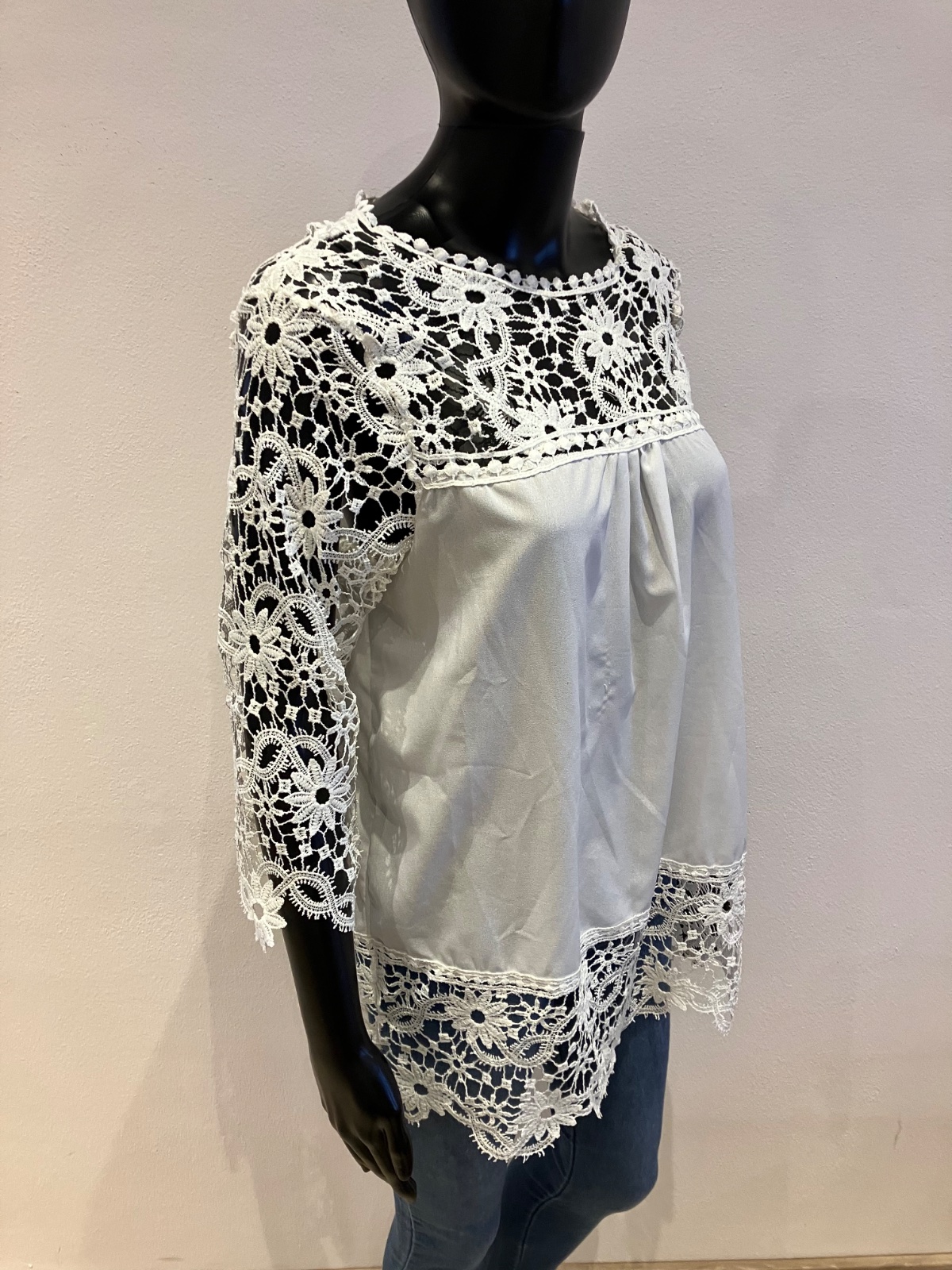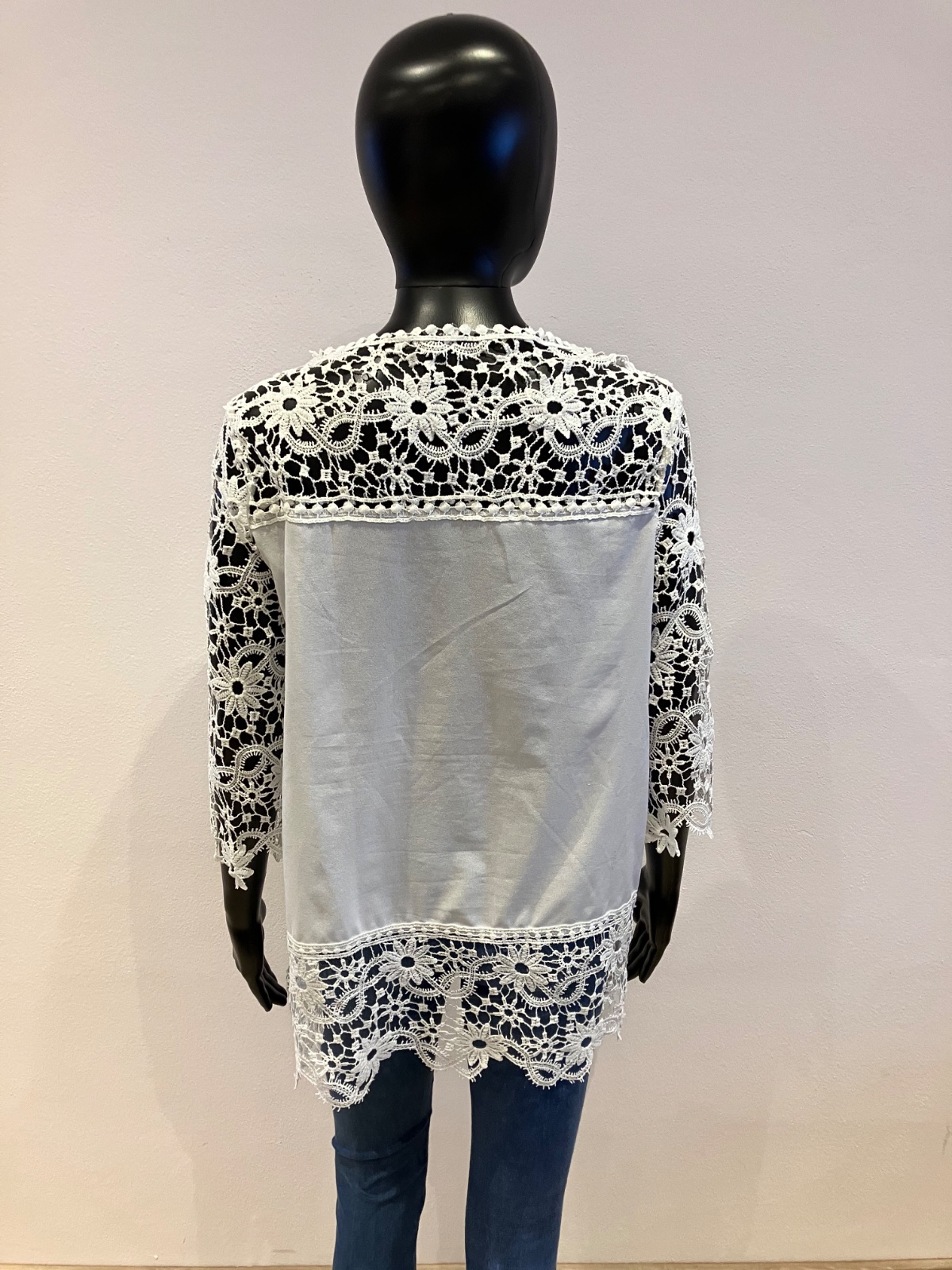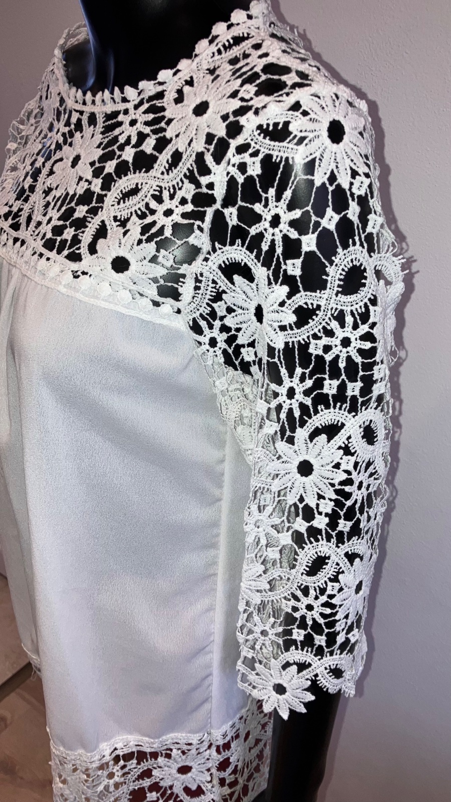 Dámska šifónová predĺžená blúzka v bielej farbe doplnená krajkovaným detailom, s trojštvrťovým rukávom, elastická. Veľkosť cca L.
