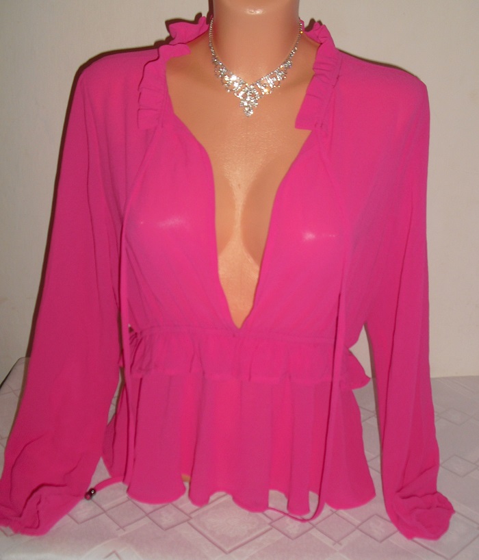 predam nadhernu jemne priesvitnu sexy bluzocku, zdobena volanikmi babydoll, je nadhernom vybornom stave. velkost uvedena s, ale ide aj na s/m . nosi sa navolno , padavo na topiku na ramienka alebo podprsenke. sirka chrbatik 54 cm , dlzka 60 cm, dole pod poprsim pas s volanmi elasticka gumka sirka 38 cm x 2 az 56 cm x 2.
