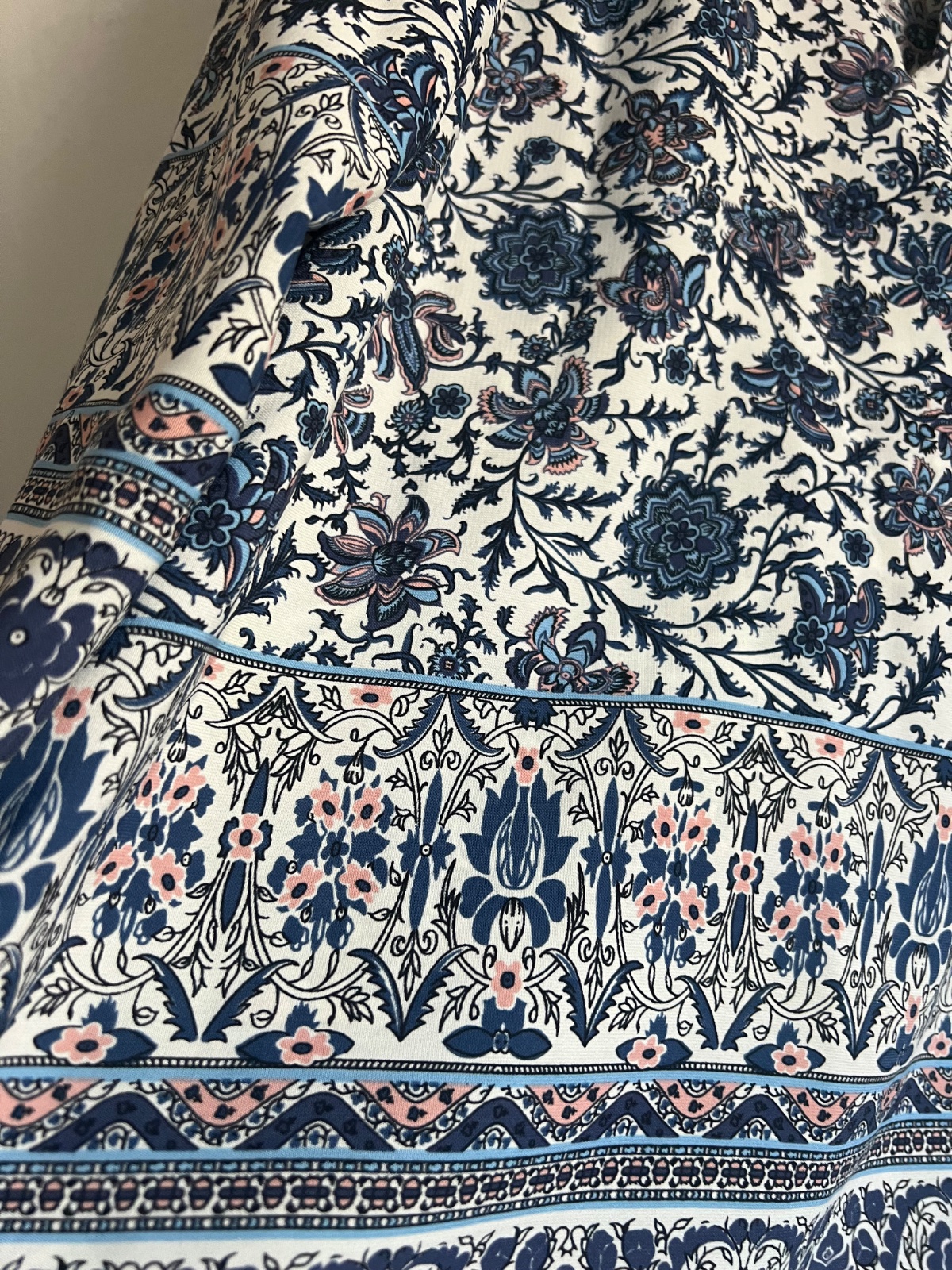 Krasna modra , eu velkost nie je uvedena , sedi s/ m pod pazuchami 50x2 dlzka cca 62 cm riad sa rozmerom