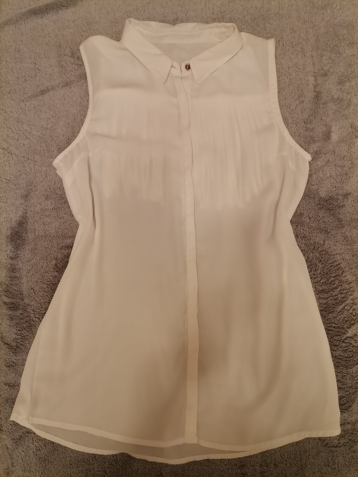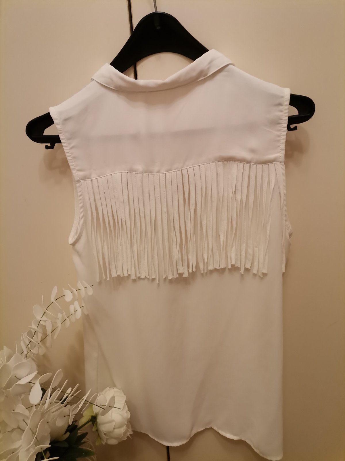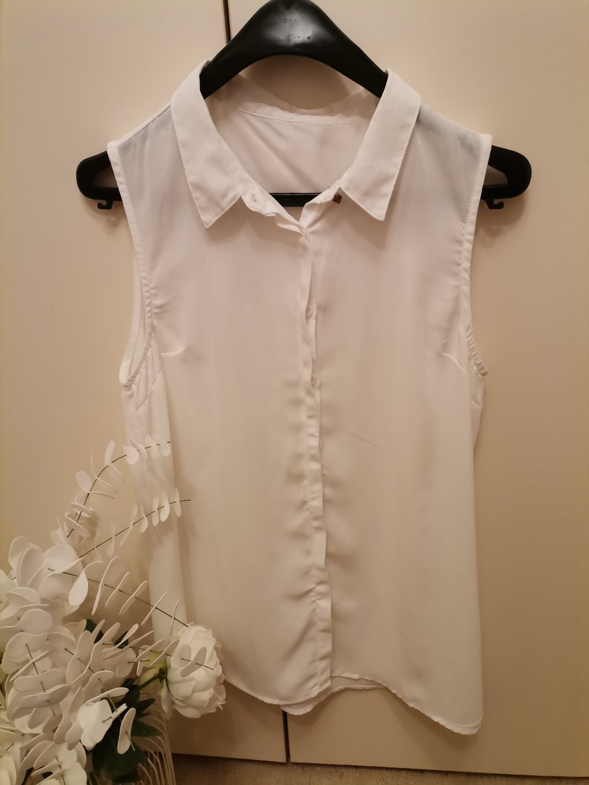 Romantická biela blúzka bez rukávov, obtiahnutá s väčším výstrihom zvýrazňujúca prsia. Dobrý nosený stav bez poškodení.