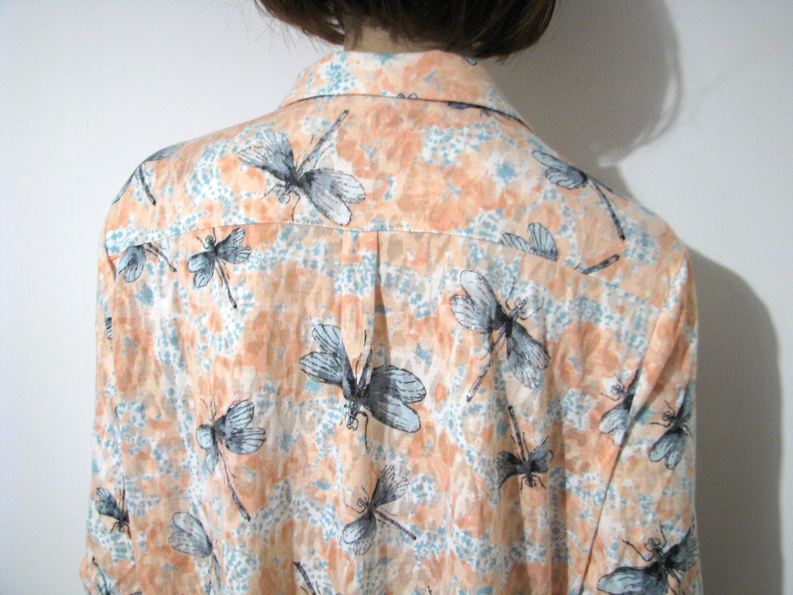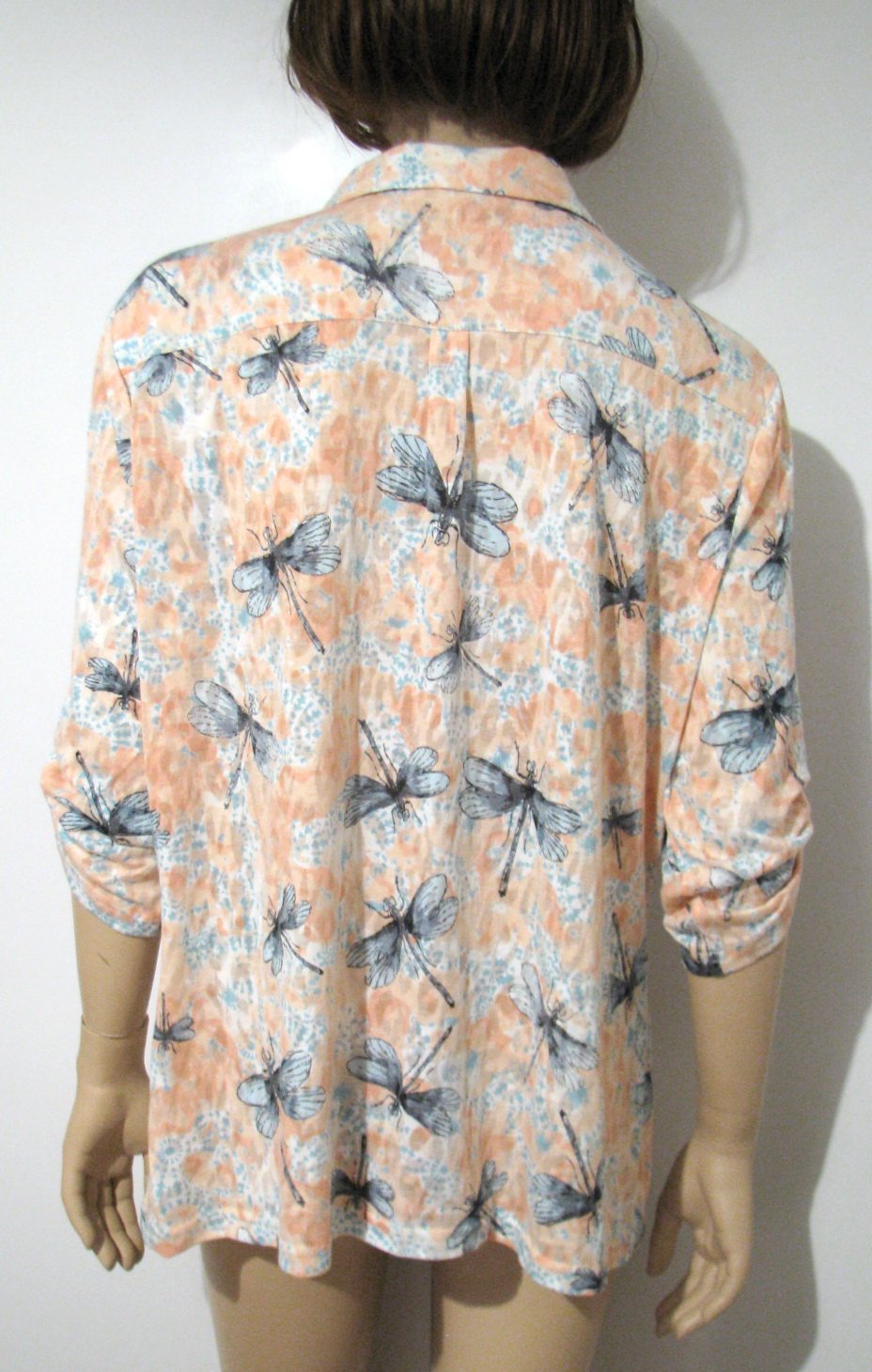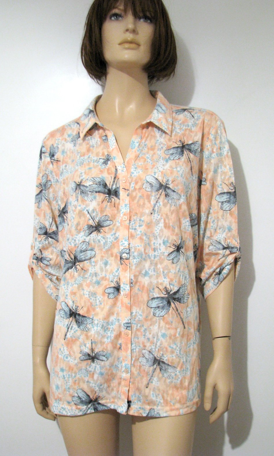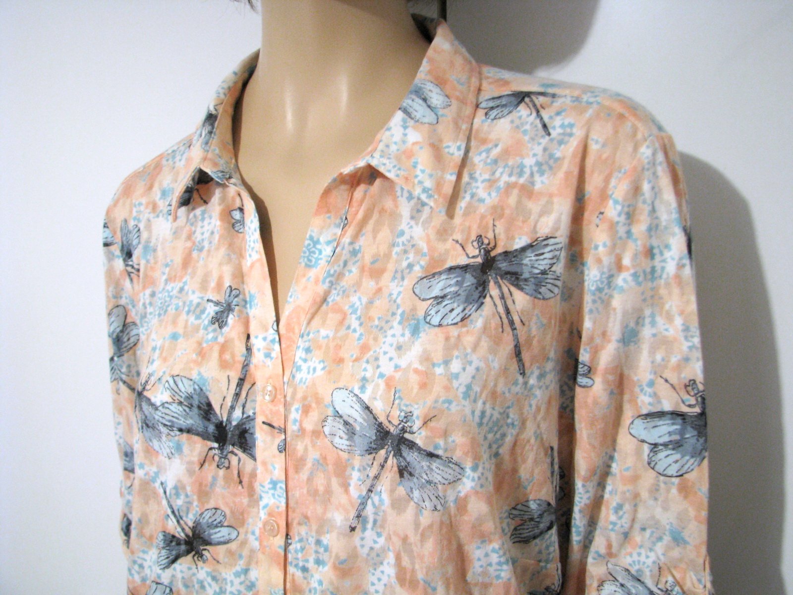 Pekná blúzka - košeľa so vzorom hmyzu - vážky. Farba bielo - lososová so sivomodrou a tyrkysovou. Výborne zachovalá, bez poškodení. Materiál 65% polyester, 35% bavlna. Veľkosť píše 50, neviem, či je až taká veľká, no podľa mňa je univerzálna, pokojne aj ako oversize na menšie veľkosti. V prípade záujmu premeriam.