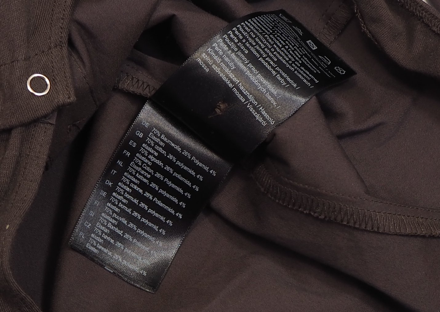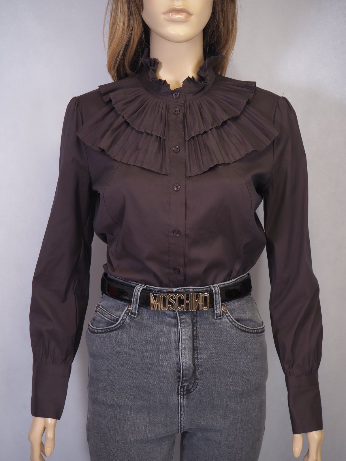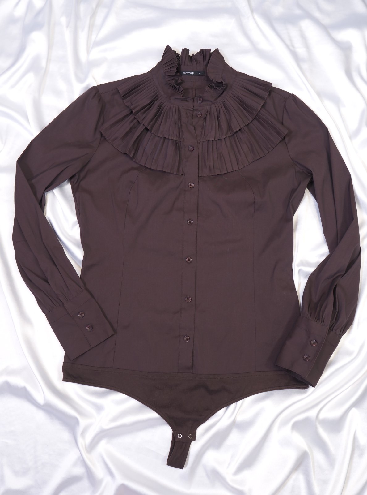 Luxusné blúzkové body tmavohnedej farby, nariasený golieri, zapínanie lemované rovnakým nariaseným volánikom v dvoch radoch, strečový materiál 70% bavlna, 26%nylon, 4% elastan, super stav, ako nová.