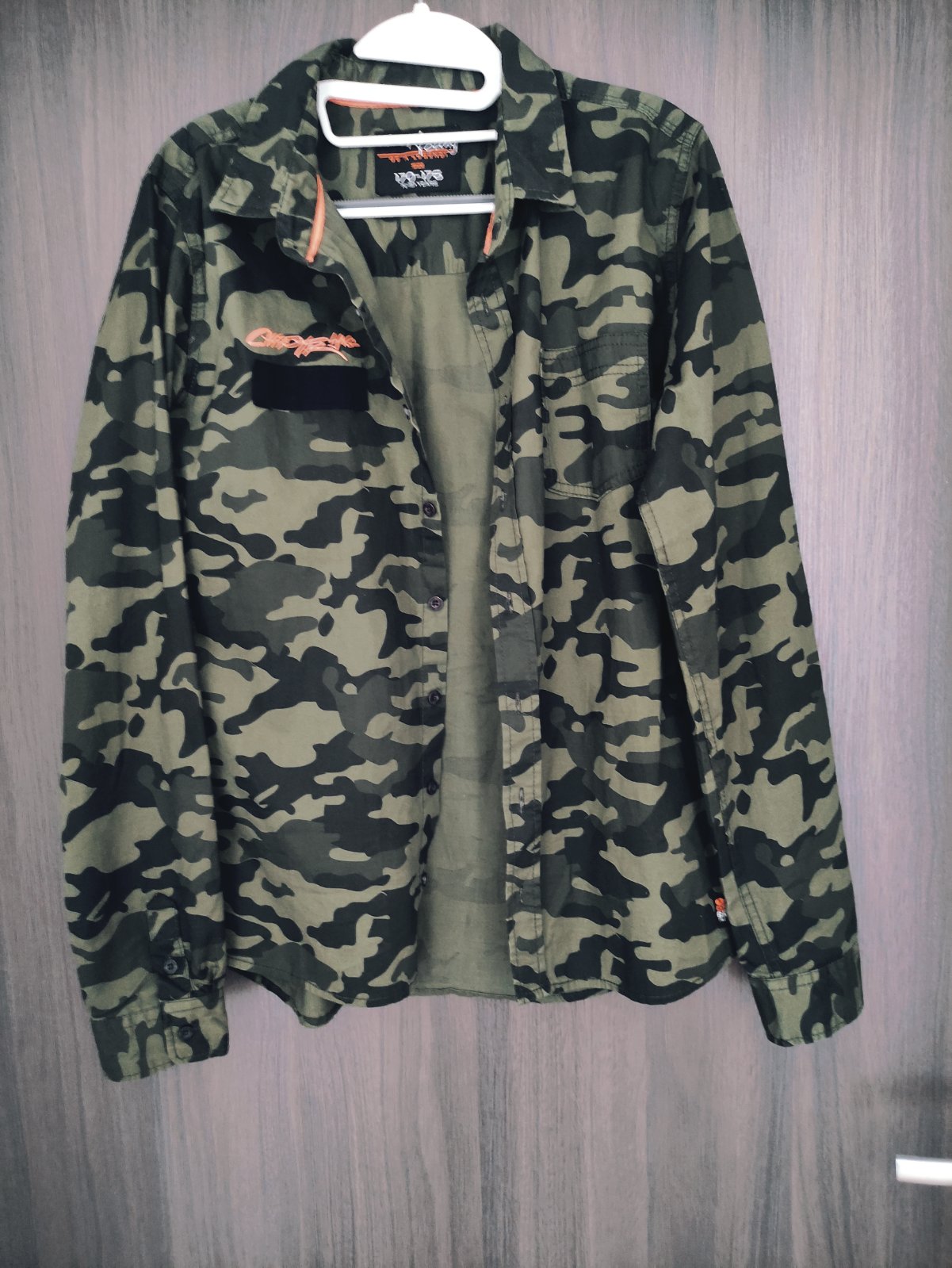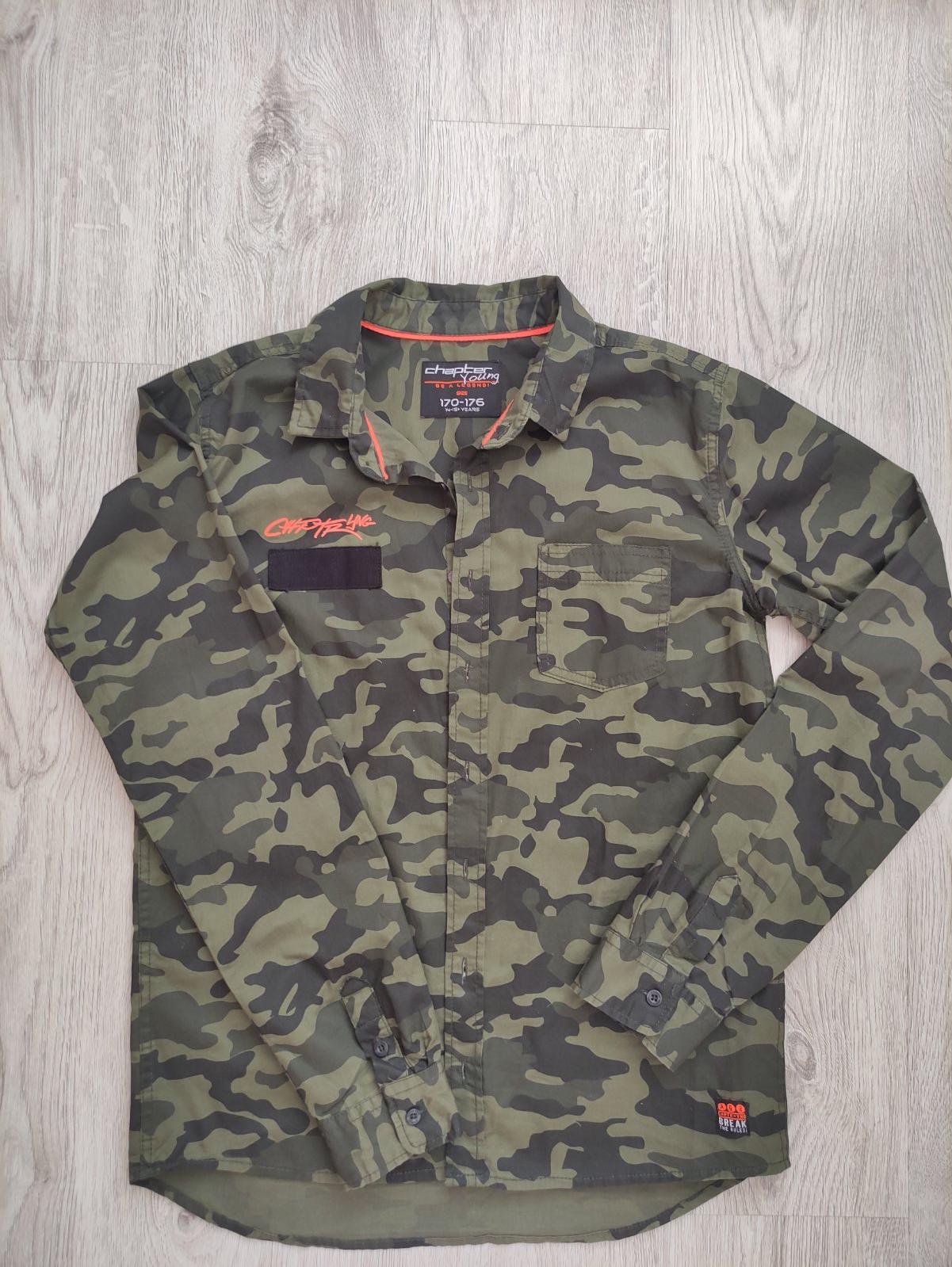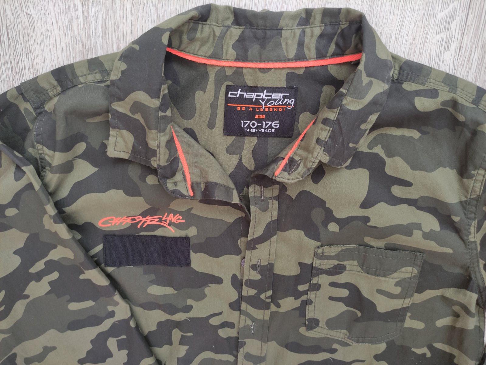 Predám 2x oblečenú maskáčovú košeľu s dlhým rukávom. Veľkosť č. 170/176, 14-15 r., zapínanie na gombíky, náprsné vrecko, oranžové aplikácie nápisov, 100% bavlna. Dĺžka 70 cm, šírka 2x51 cm, vnútorná dĺžka rukáva 56 cm, vonkajšia dĺžka rukáva meraná od krku 80 cm. Košeľa kupovaná v Takku. Syn ju mal oblečenú iba príležitostne, na striedačku s inými. Bez poškodenia, nevyblednutá.