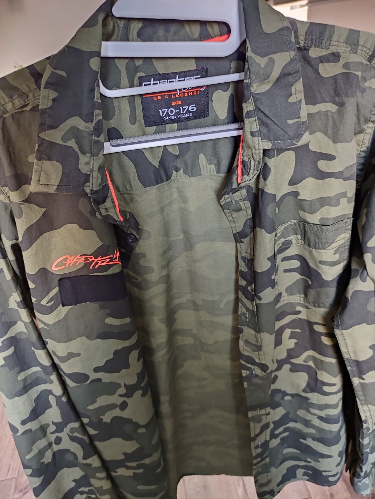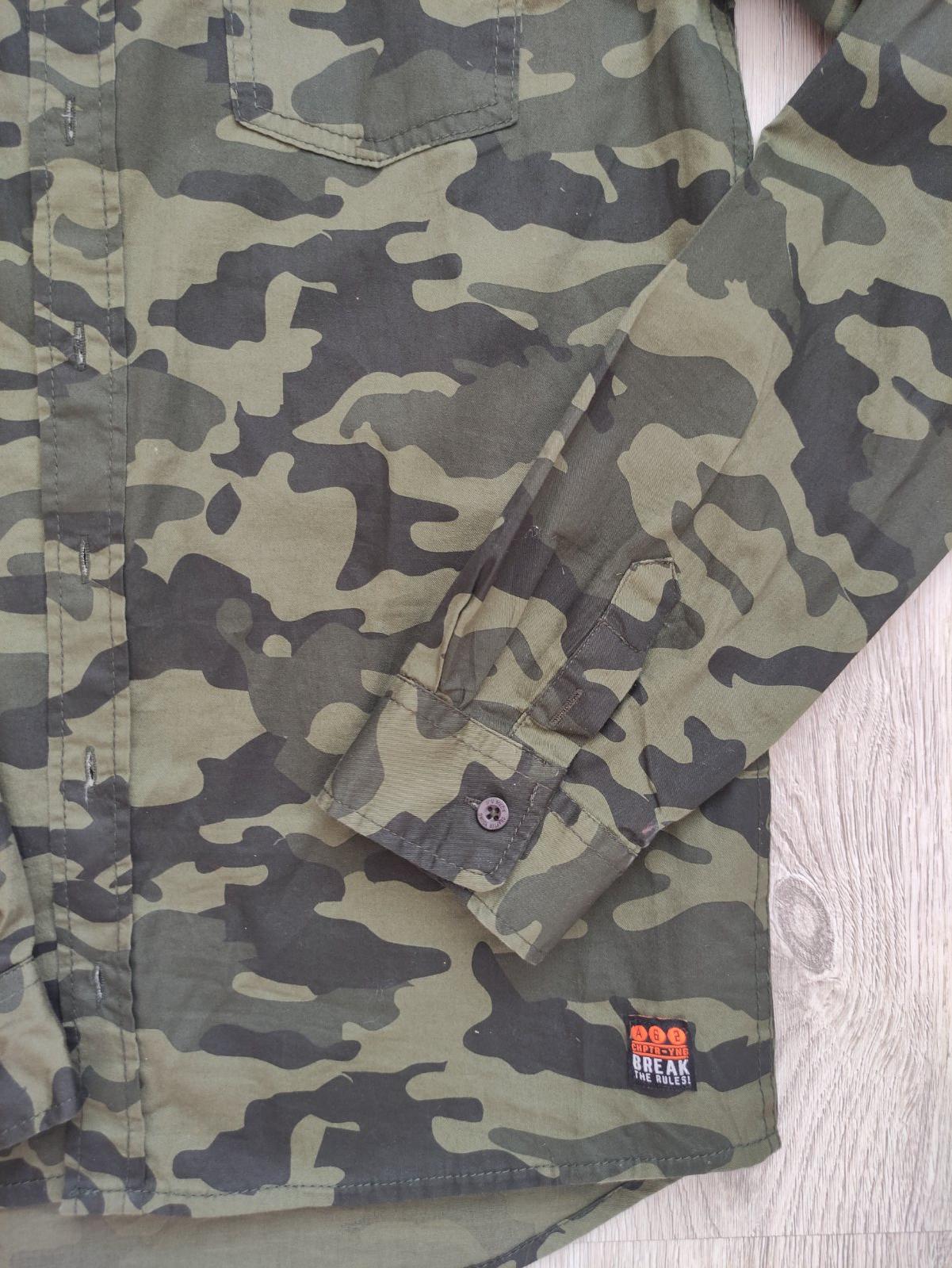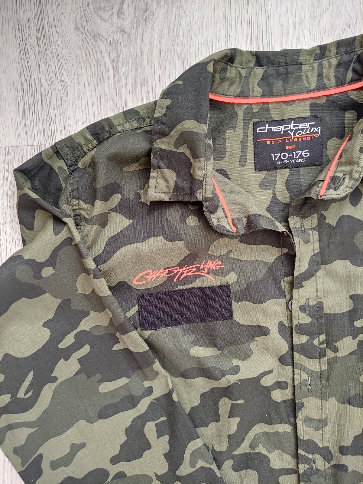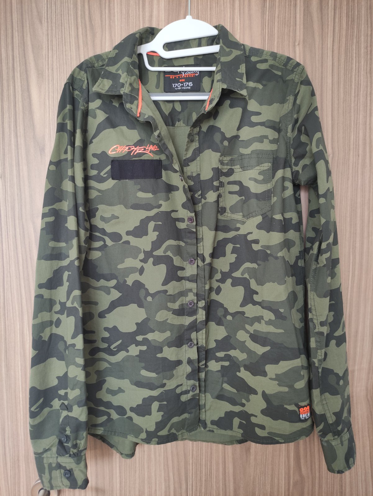 Predám 2x oblečenú maskáčovú košeľu s dlhým rukávom. Veľkosť č. 170/176, 14-15 r., zapínanie na gombíky, náprsné vrecko, oranžové aplikácie nápisov, 100% bavlna. Dĺžka 70 cm, šírka 2x51 cm, vnútorná dĺžka rukáva 56 cm, vonkajšia dĺžka rukáva meraná od krku 80 cm. Košeľa kupovaná v Takku. Syn ju mal oblečenú iba príležitostne, na striedačku s inými. Bez poškodenia, nevyblednutá.