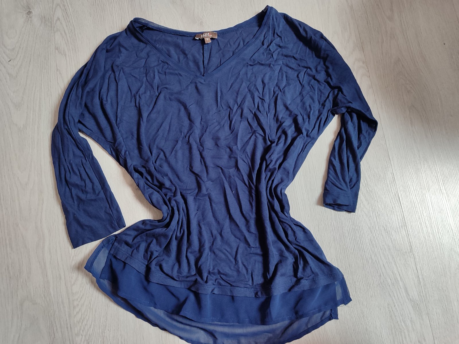 Košeľa s 3/4 rukávmi veľkosť S, šírka cez prsia 41 cm, celková dĺžka 54 cm, dĺžka od rukáva od pliec 42 cm. Nosená, bez poškodenia. Cena 2 EUR + poštovné