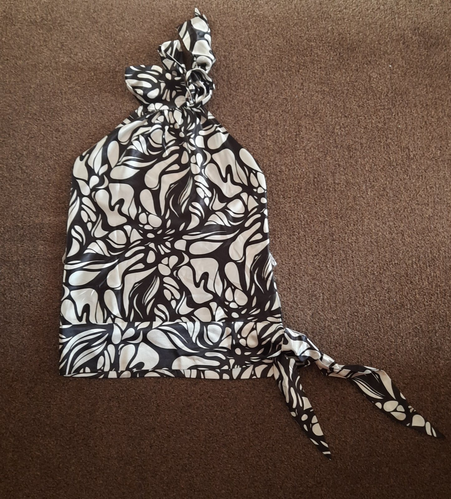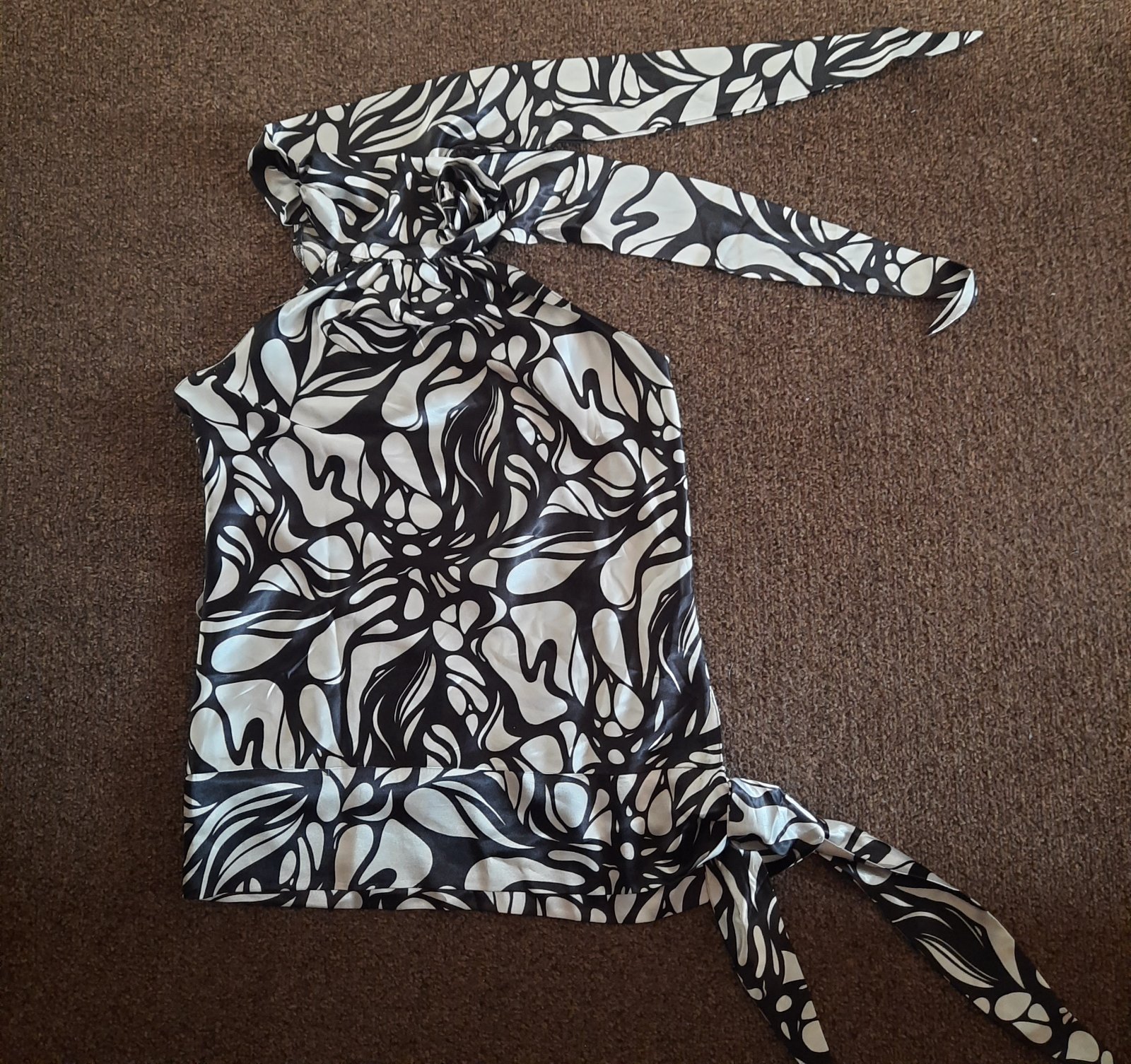 Krasny, elegantny top-bluzka. Je to akoby na elastickom tyle ponasivane cierne a biele stuhy. Rovnaky vzor aj na chrbte.