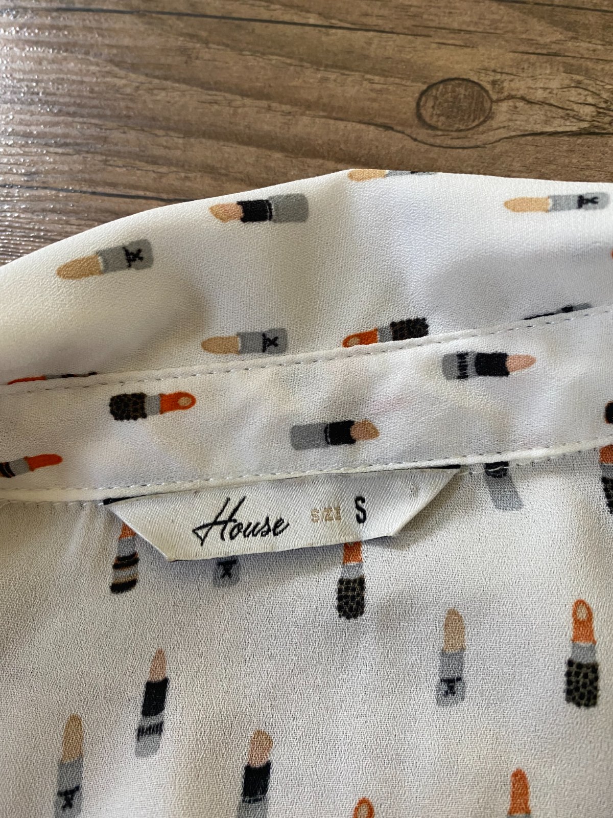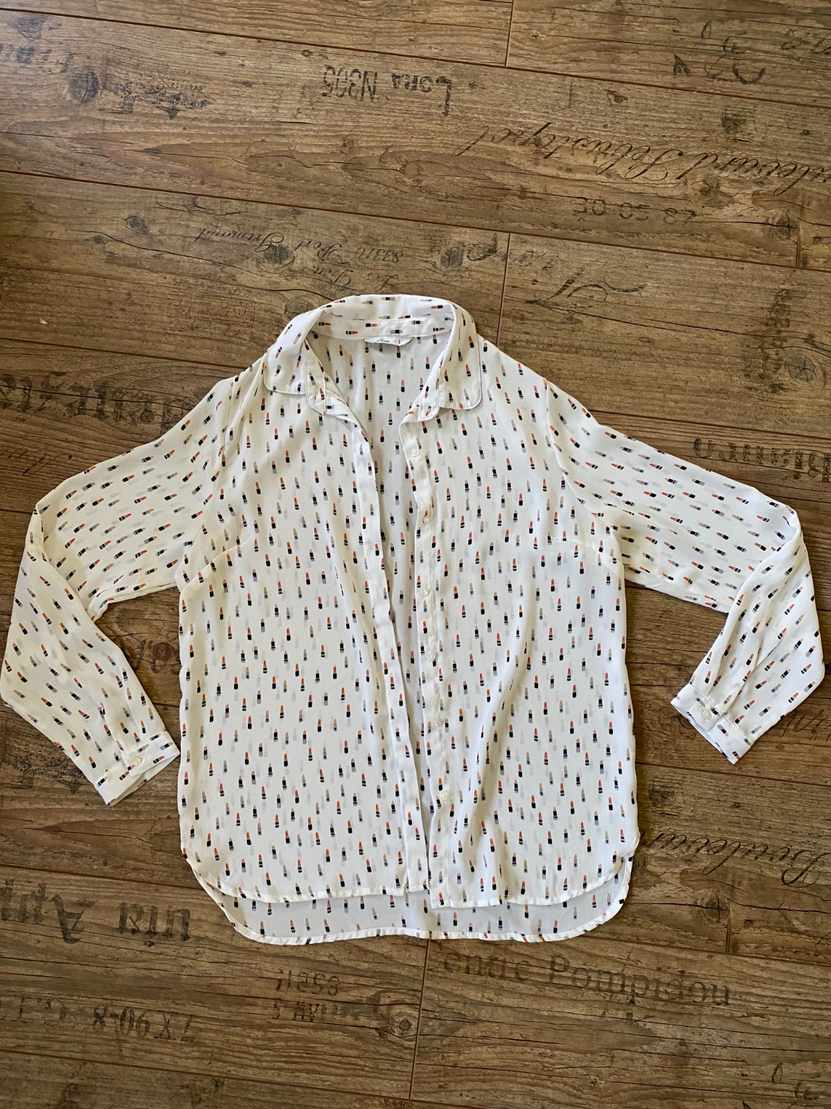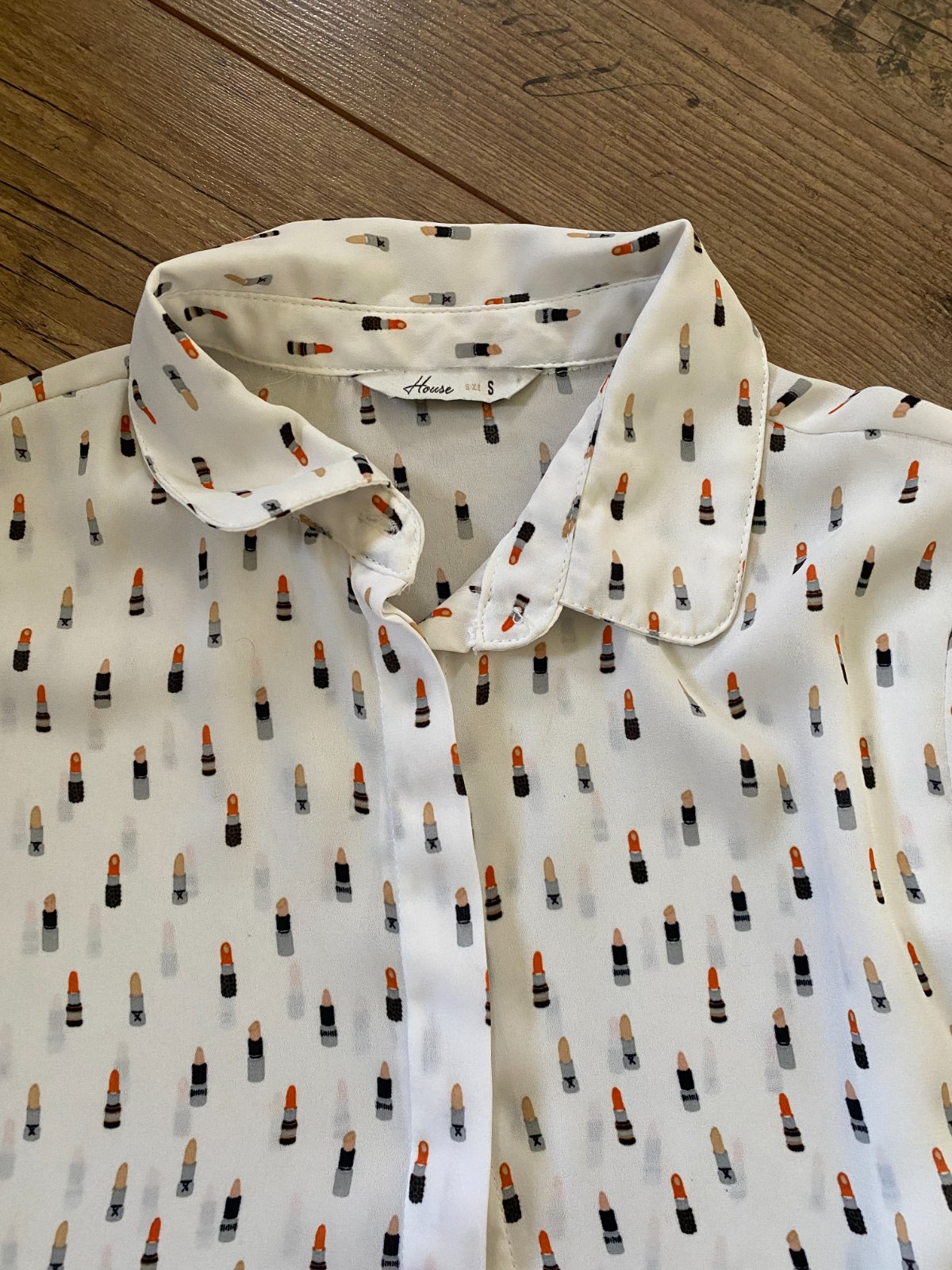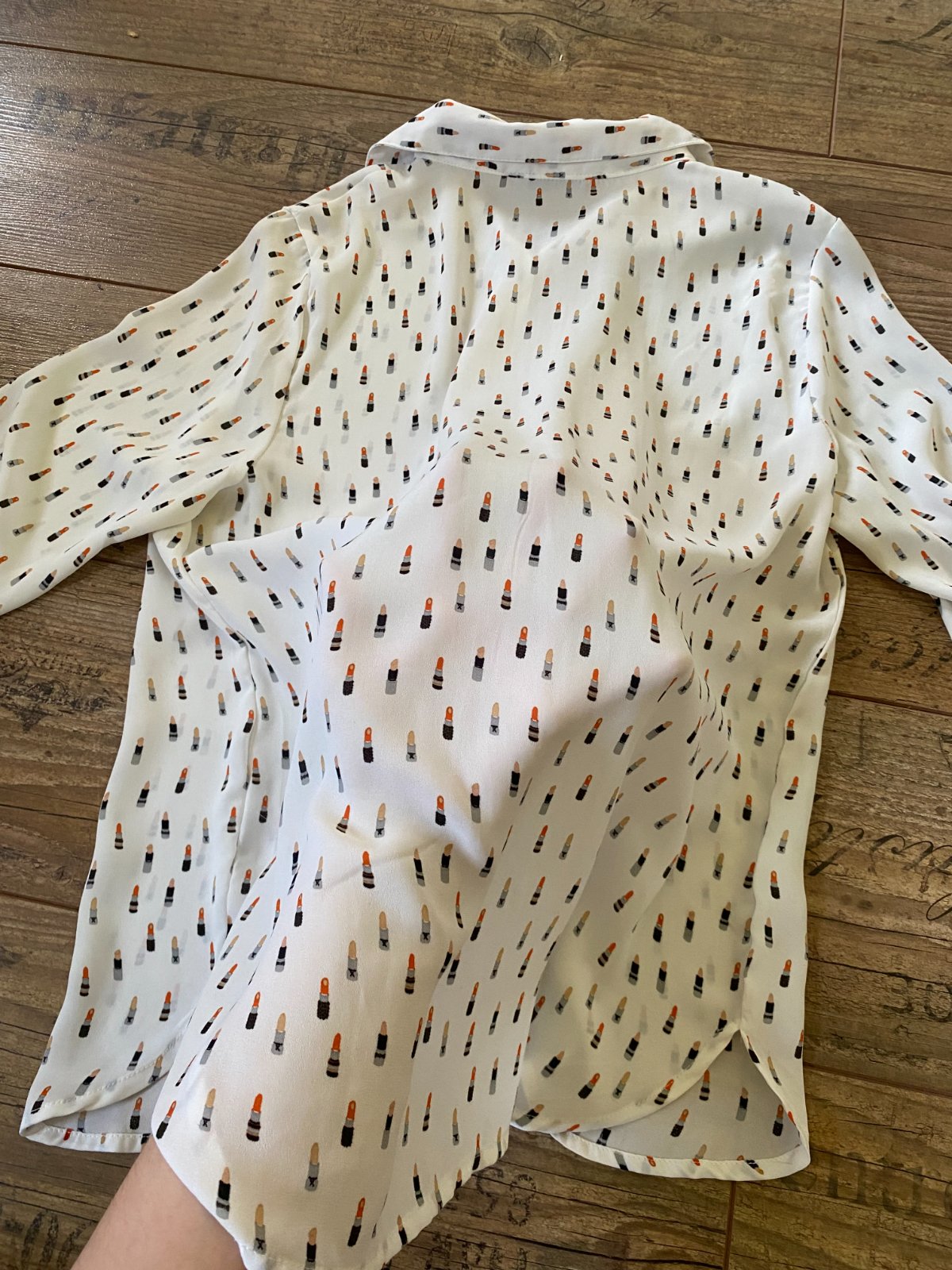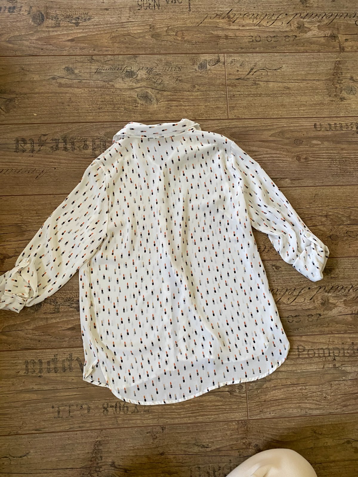 Nepamätám si, že by som ju mala niekedy oblečenú, ale bola praná. Stav je krásny. Nie je elastická. Veľkosť S. Má nastaviteľné rukávy a gombíky sú kryté. Štítok s materiálom je odstrihnutý, ale je to taký elegantný chladivý materiál, mierne priesvitný.