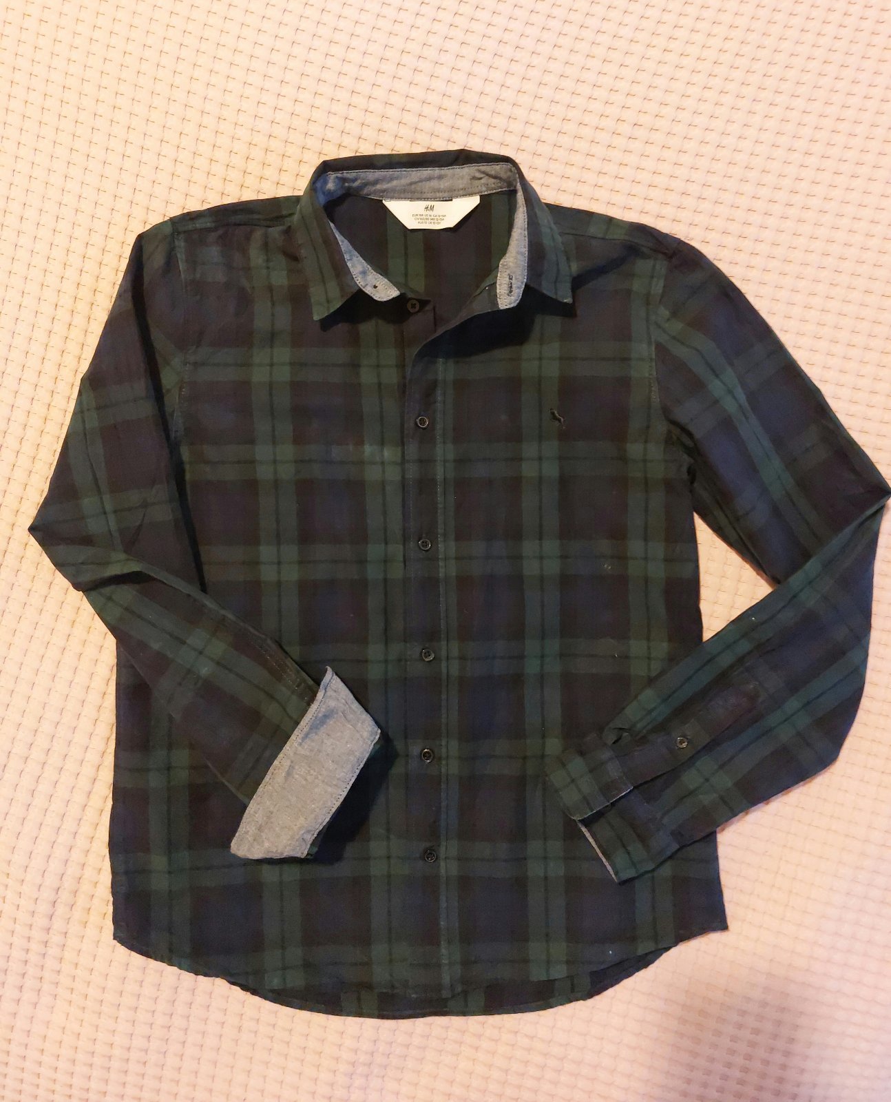 Ponúkam krásnu košeľu s veľmi efektným vzorom: tmavozeleno-tmavomodrým károm, značky H&M, veľkosť 158. Rukáv sa dá nosiť ohnutý, lebo má peknú modrú manžetu. Košeľa je ideálna na nosenie do školy, ale aj na špeciálnu príležitosť. Bola oblečená len raz, takže je v dokonalom stave. :)