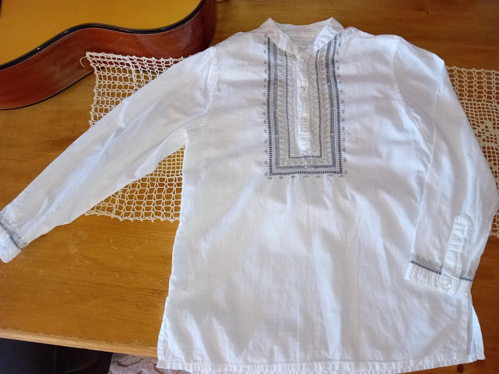 Krásna vyšívaná košeľa/kaftan. Vhodná na príležitosť ako svadba/prijímanie/krst, ako aj na bežné nosenie. Je ľahká, tenká, vhodná na leto. 100% bavlna. Košeľa je v dobrom nosenom stave. Na poslednej foto odfotené žlté fľaky,jadrovým mydlom nezišli,treba skúsiť agresívnejšie čističe na škvrny. Cena tomu prispôsobená.