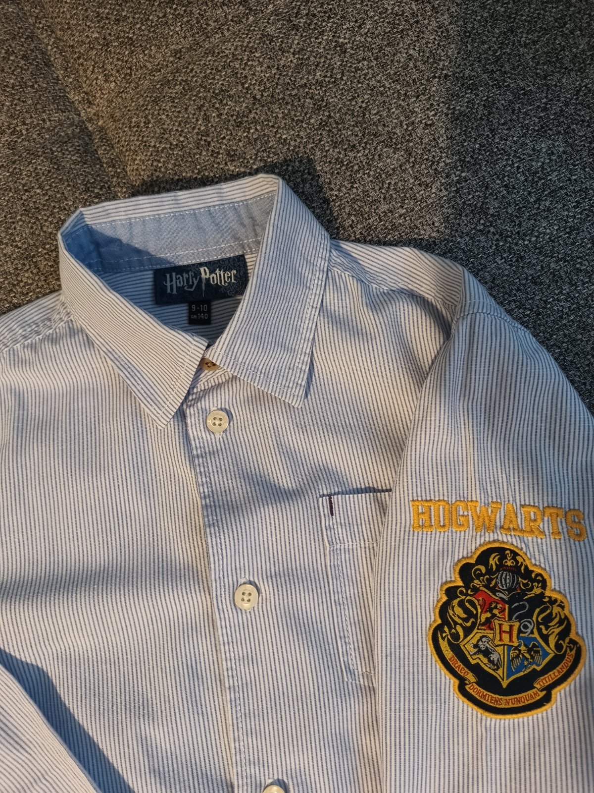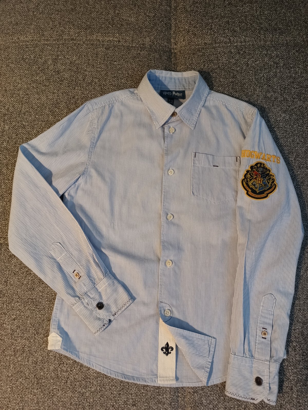 Košeľa s dlhým rukávom Harry Potter nápis a znak na rukáve, veľmi zachovalý stav bez fľakov a poškodenia, 100% bavlna, dĺžka 54 CM, šírka pod pazuchami 42 CM, dĺžka rukáva od ramena 53 CM.