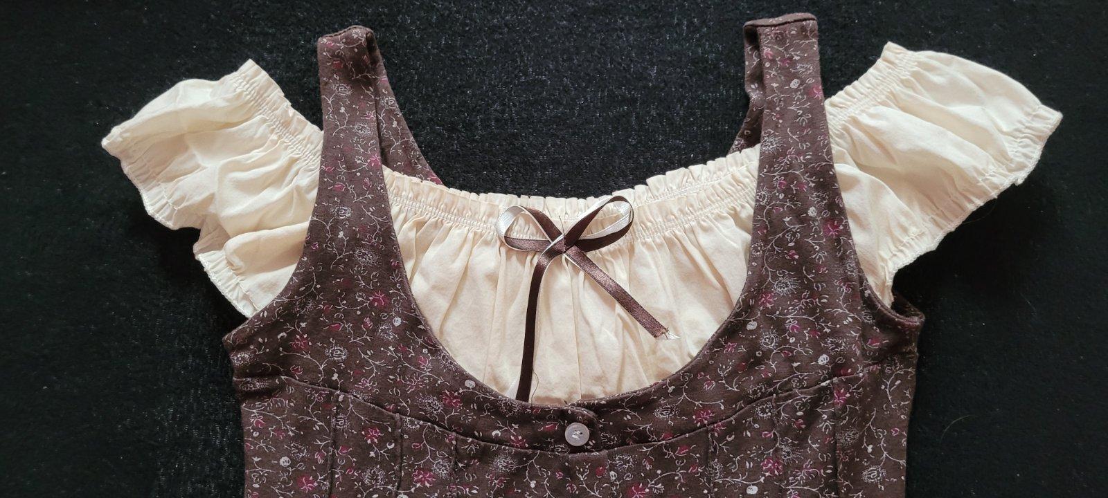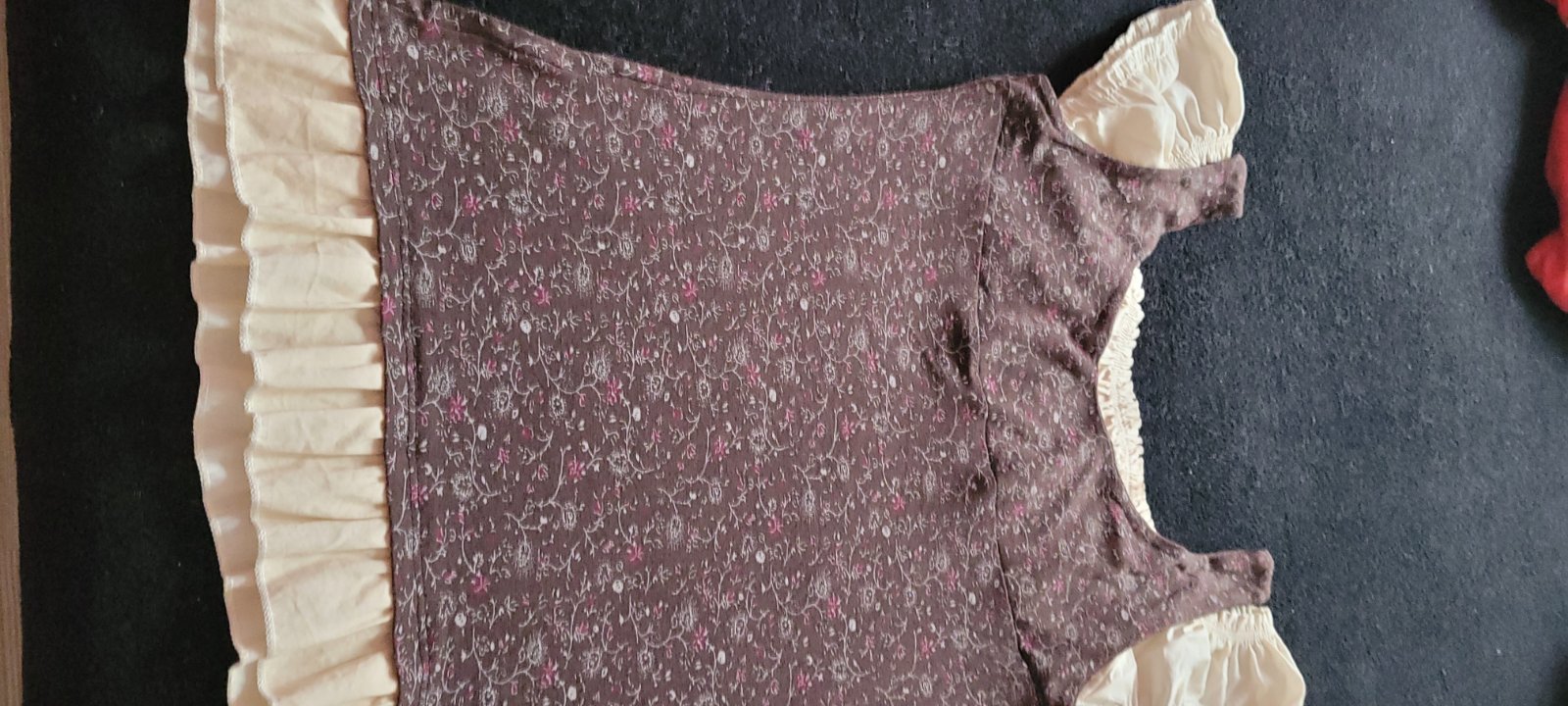 Krasna bluzka, kde sa daju rukavy stiahnut na ramienka. Jemne elasticka, zapinanie je na ozdobu, dolu volan, vrch zdobeny zberkanim a maslickou.