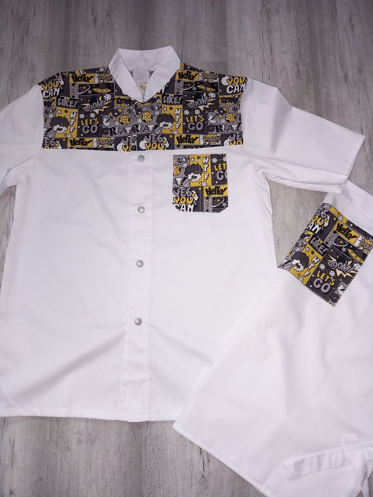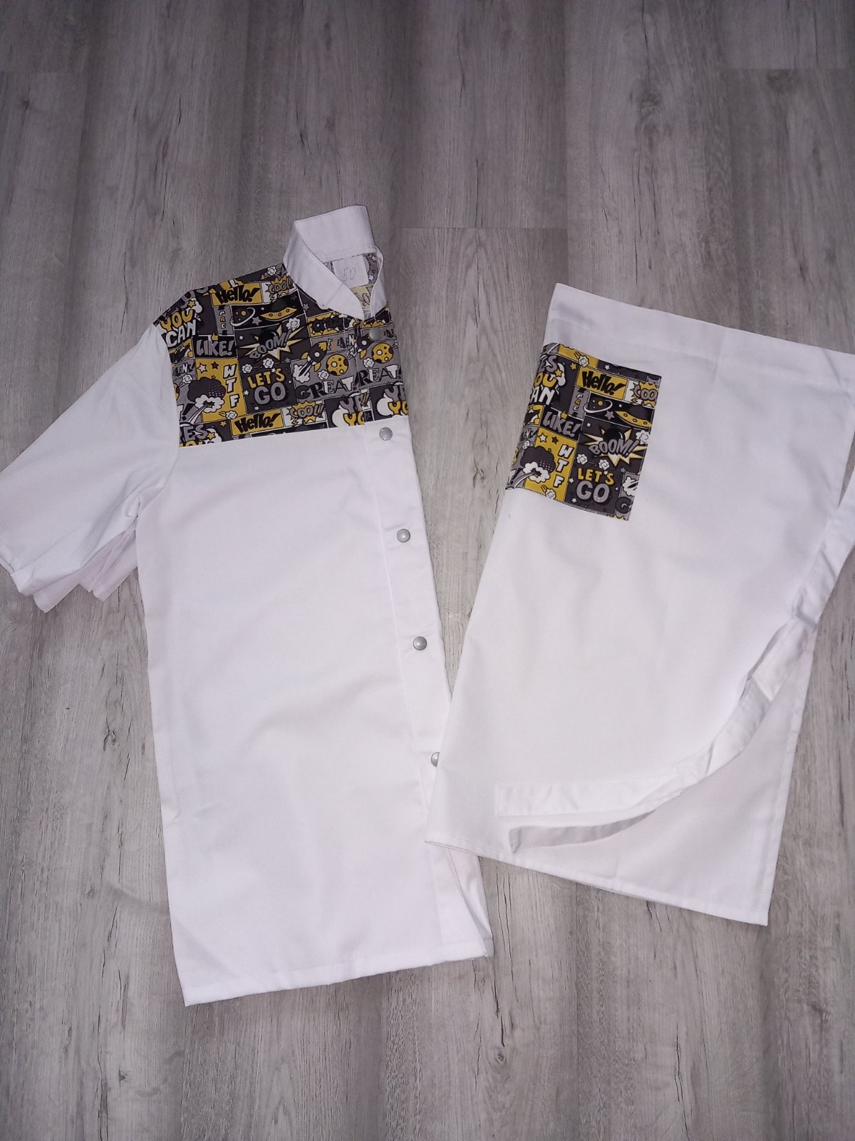 Štýlový pánsky kuchársky rondon pre kuchára ktorý aj v kuchyní okrem toho ,že vie dobre variť chce aj dobre vyzerať a práve pre neho je tento rondon čiernej farby v kombinácii so vzorom ,má jednoradové zapínanie a vrecko na rukáve .