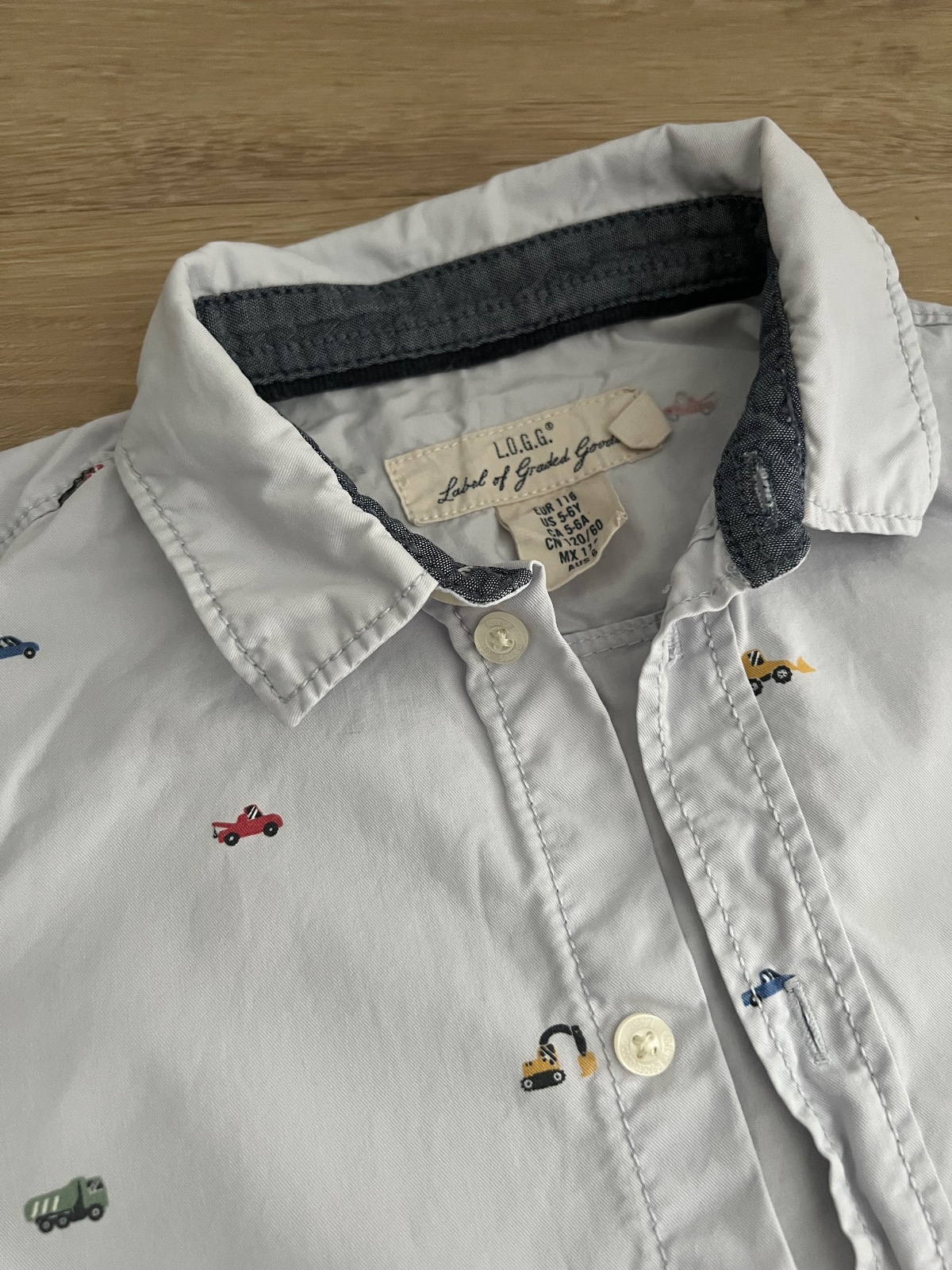 Predám košieľku bledučkomodrej farby s jemným motívom dopravných prostriedkov. V top stave