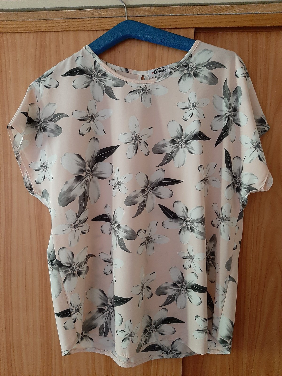 Bledoružová blúzka so šedými kvietkami, nenosená, dĺžka 62 cm.