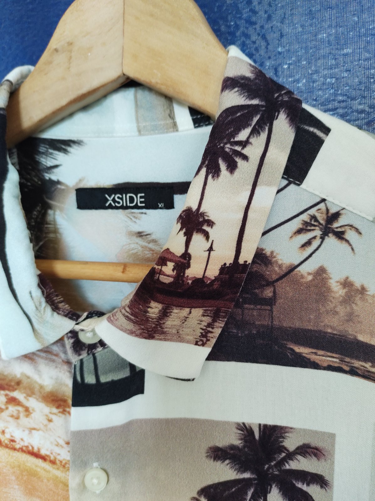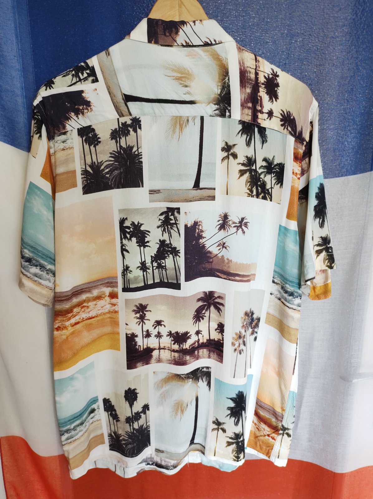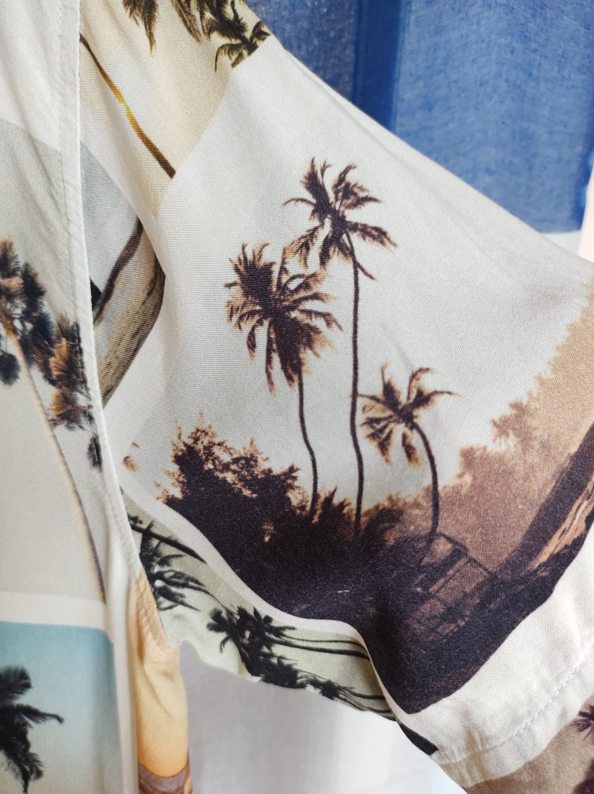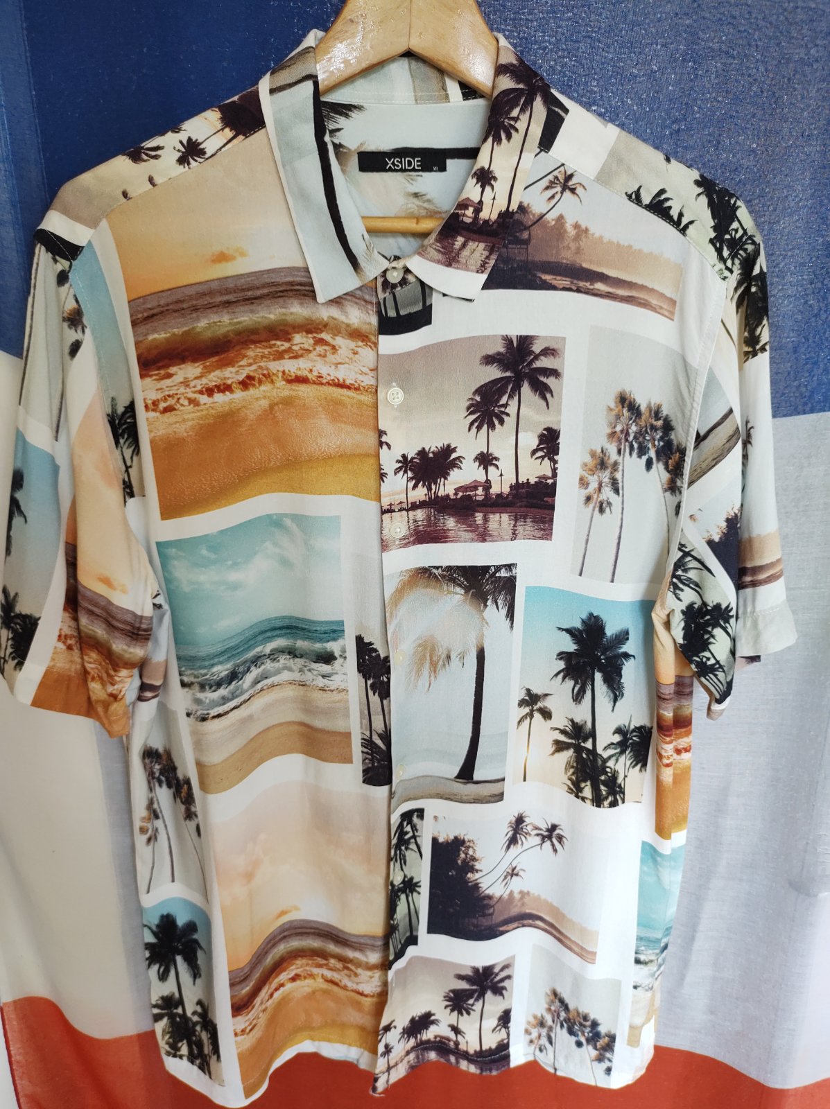 letná košeľa, pekný vzor, veľkosť uvedená XL (premeriam na požiadanie), 2 drobné kazy na látke (na ľavej strane nad vačkom a na pravom pleci, je to odfotené), zaujímavé detaily