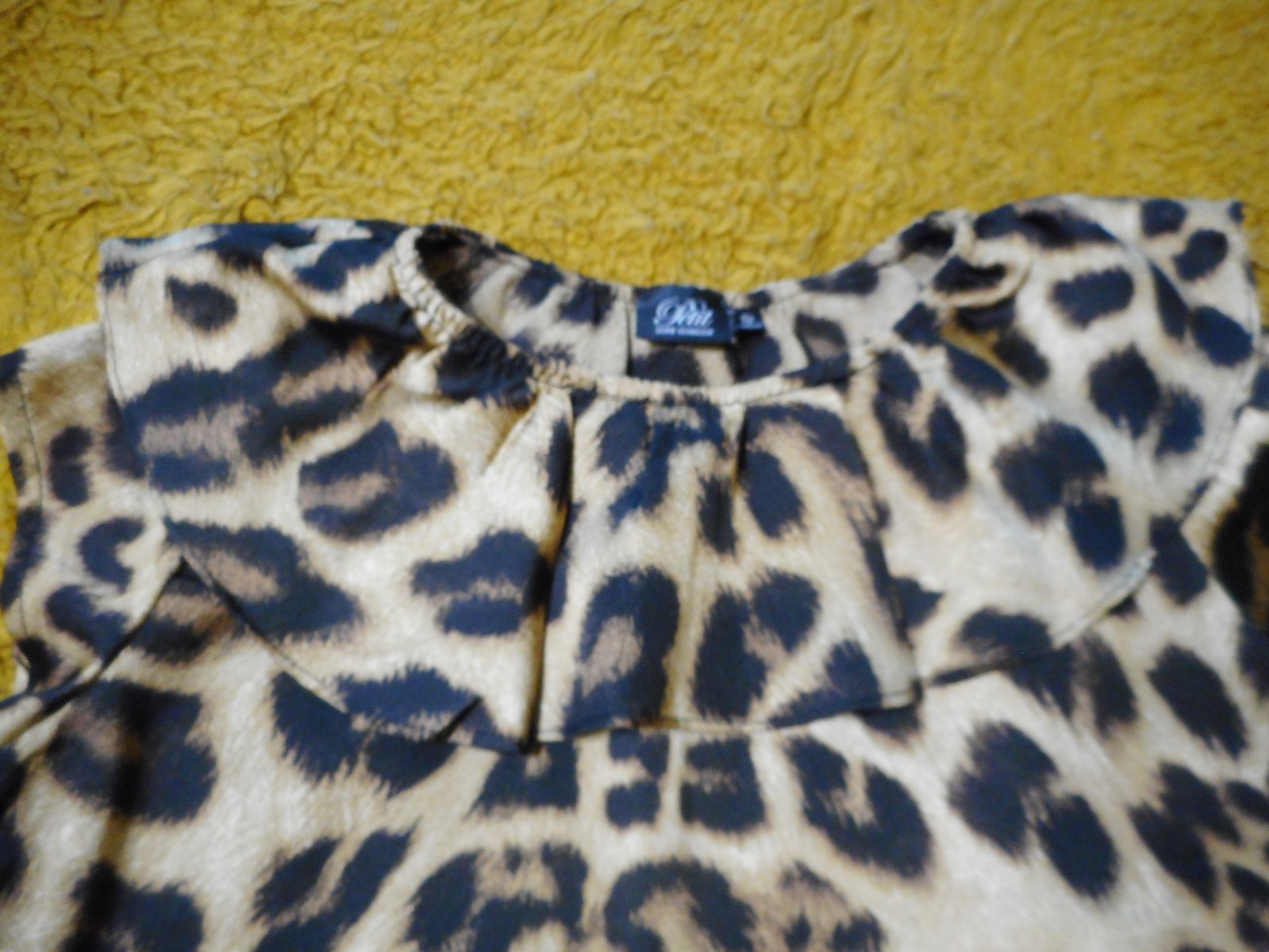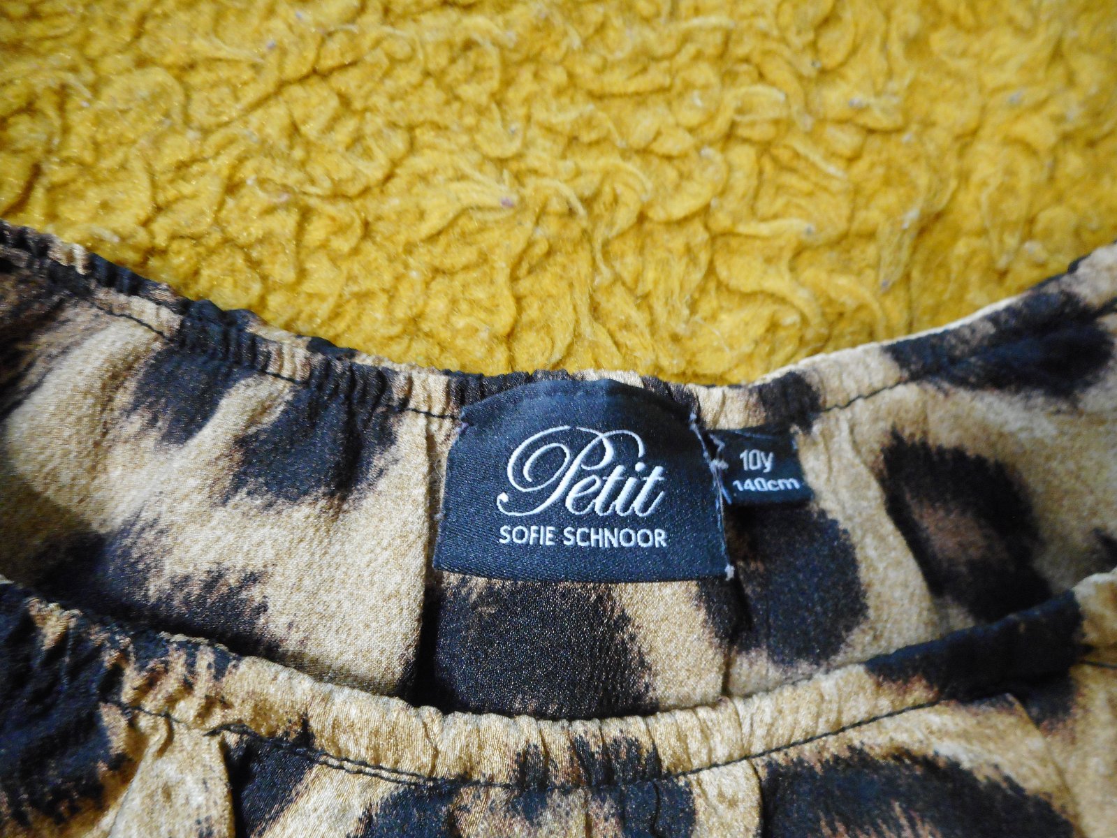 predám používaný nepoškodený krásny slávnostný letný dievčenský top s krátkym rukávov z tenučkého lesklého materiálu pre dievčatko na vek 10 rokov výška cca 140cm, zn. Petit Sofie Schnoor s leopardím vzorom s volánom v časti ramien, obliekanie cez hlavu, celková dĺžka topu je 50cm, šírka pod pazuchami je 45cm