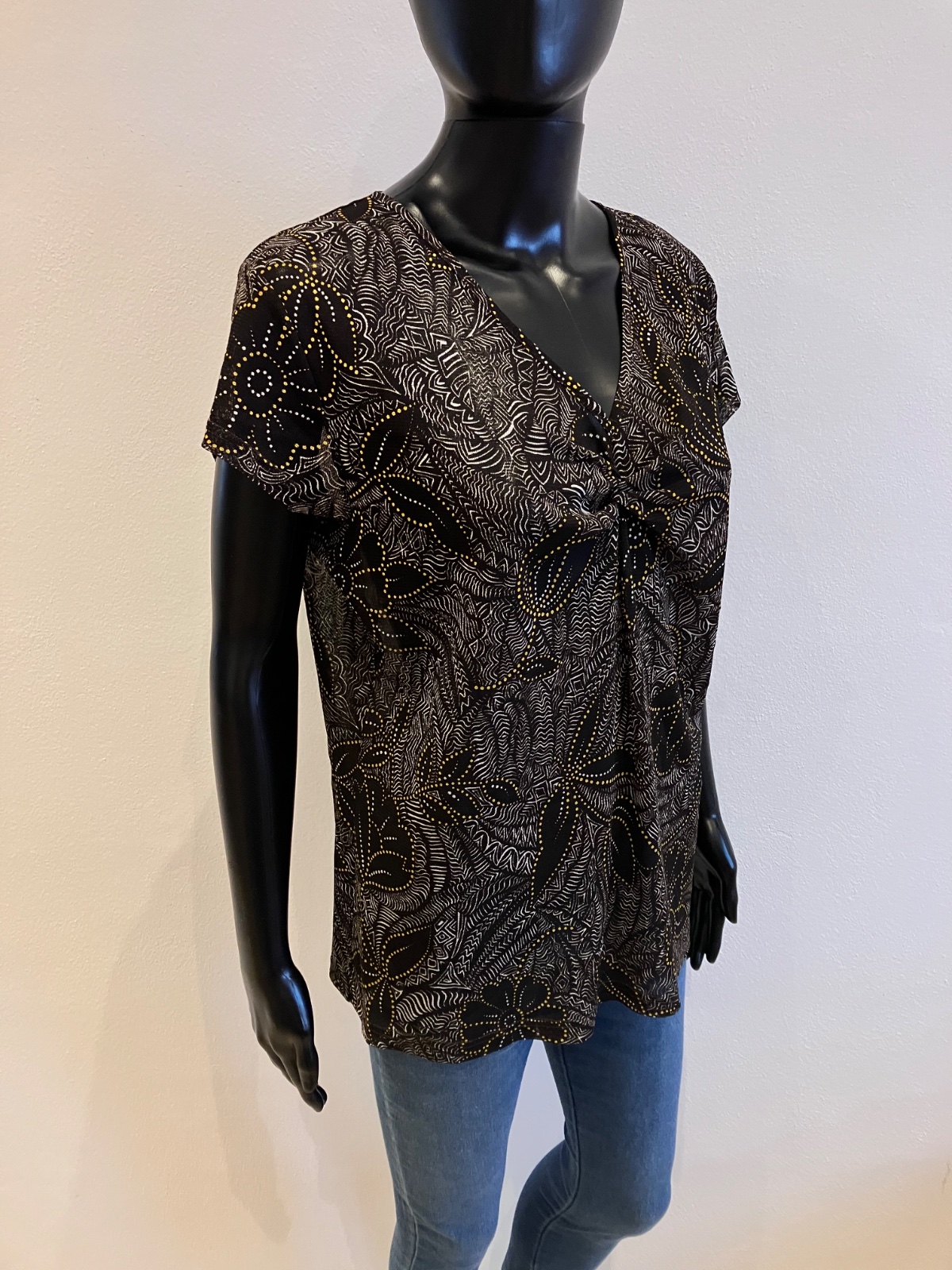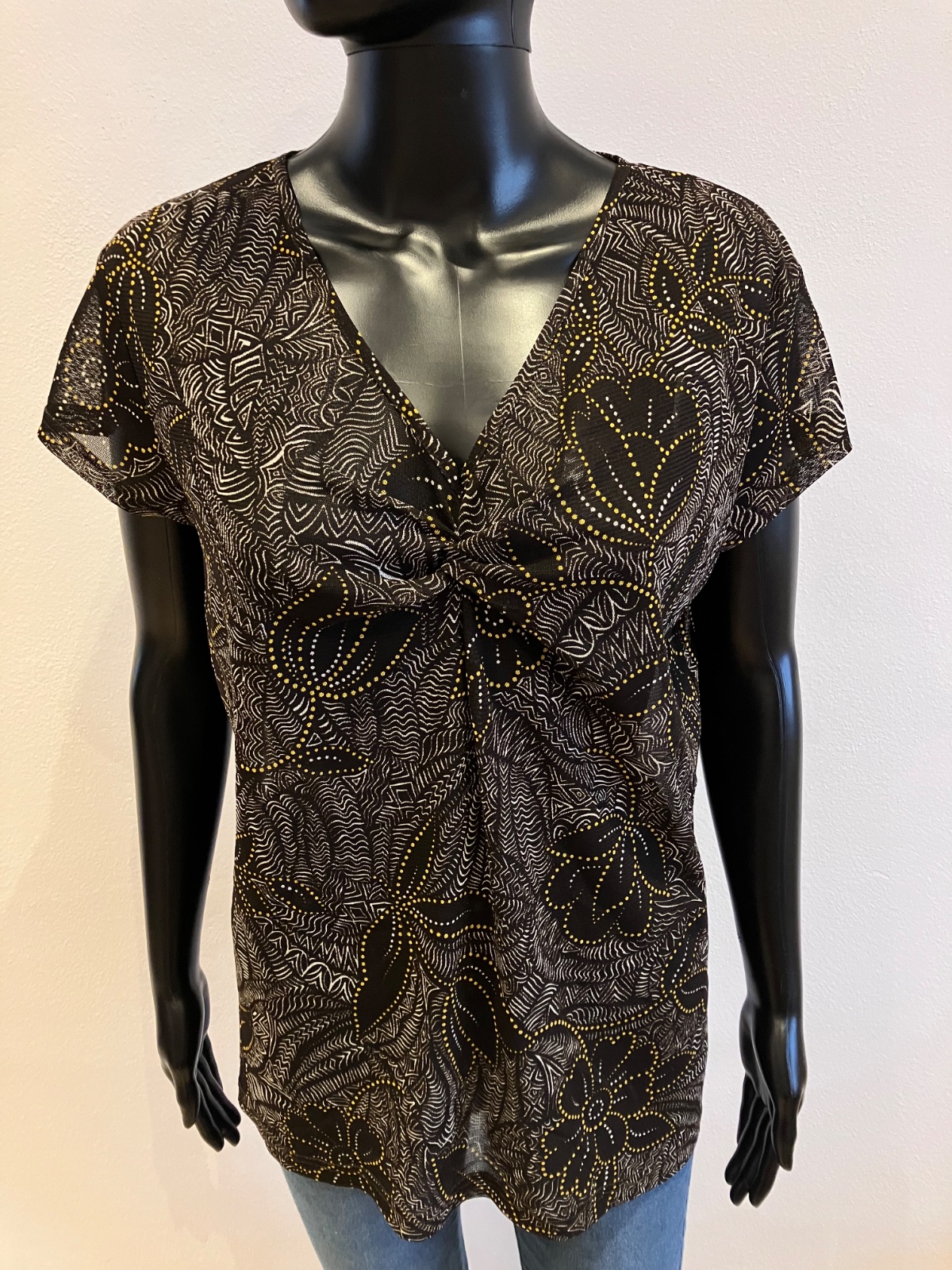 Dámska blúzka s krátkym rukávom, vzorovaná, véčkový výstrih, tenká, priesvitná, elastická.