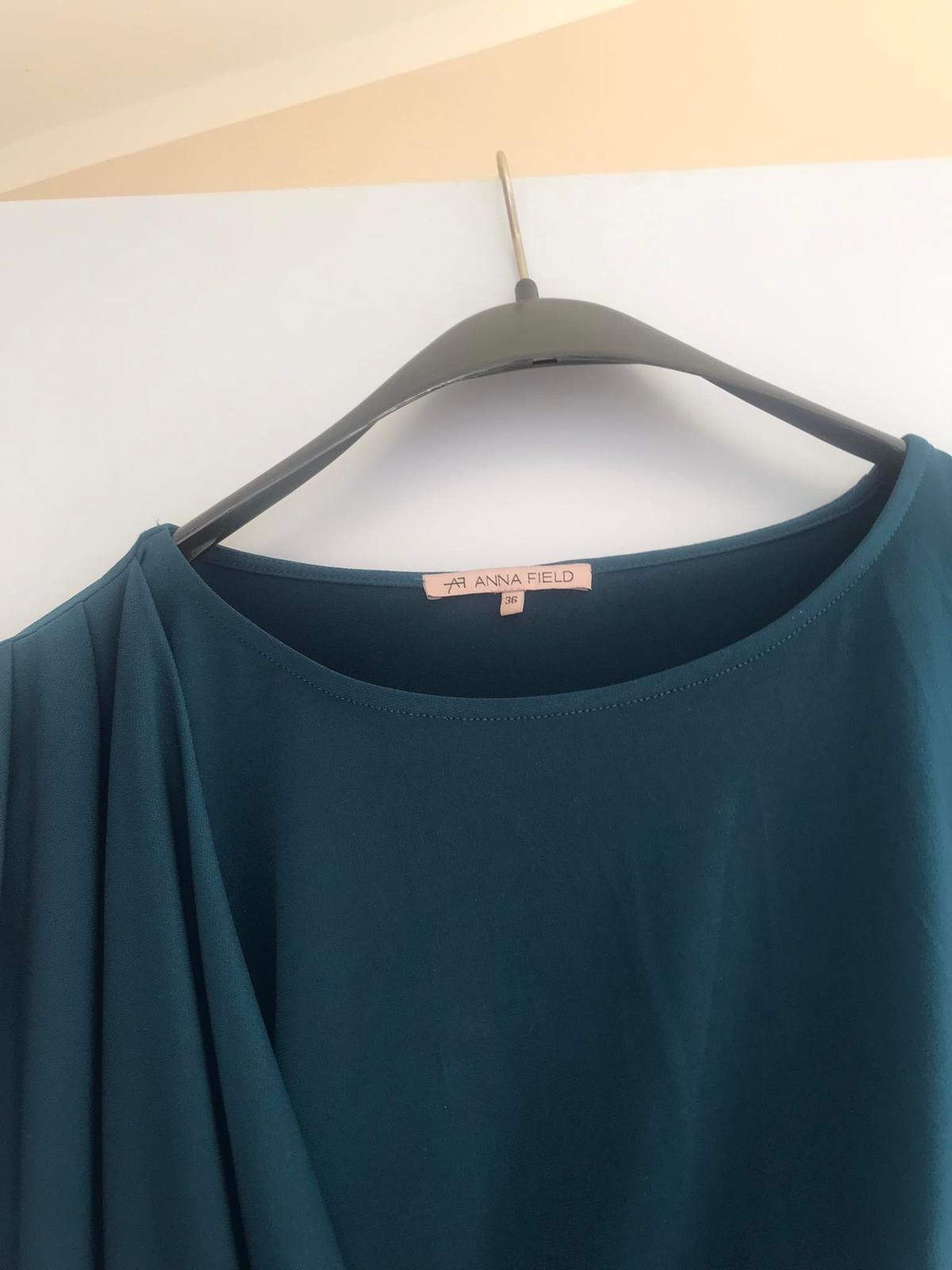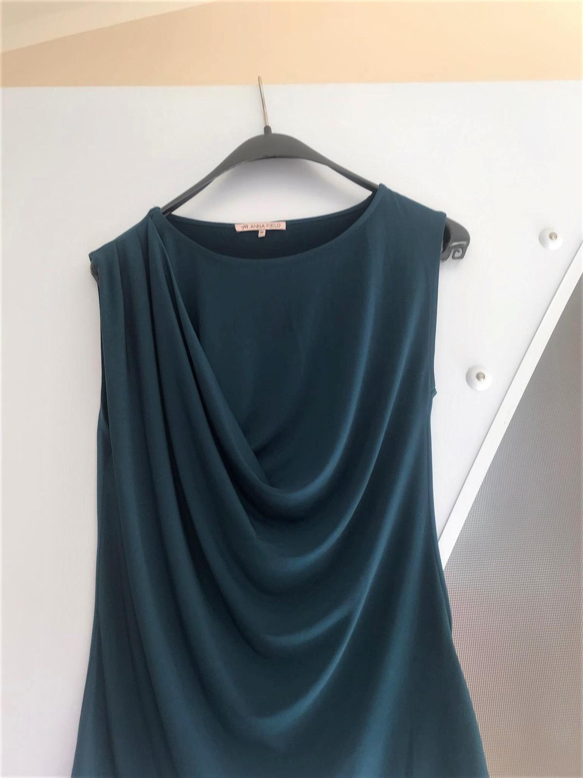 nadčasové vysokokvalitné tričko/top/ blúzka/,krásne riešené,použité na 1 slávnostnú príležitosť - ako nové,špičková kvalita a vypracovanie,95% polyester, 5% elastan,super aj do saka a kostýmov,aj na spoločenské podujatia,zaujímavá farba - zvláštny odtieň stredne modrej do tyrkysova, dlžka celkom = 66 cm, dlžka meraná a boku od pazuchy dole = 42 cm, šírka meraná pod pazuchou 45 x 2 cm,lepšie ak ak menej,pekne riasi,top kúsok,značka Anna Field..viac o značke a cenách viď link