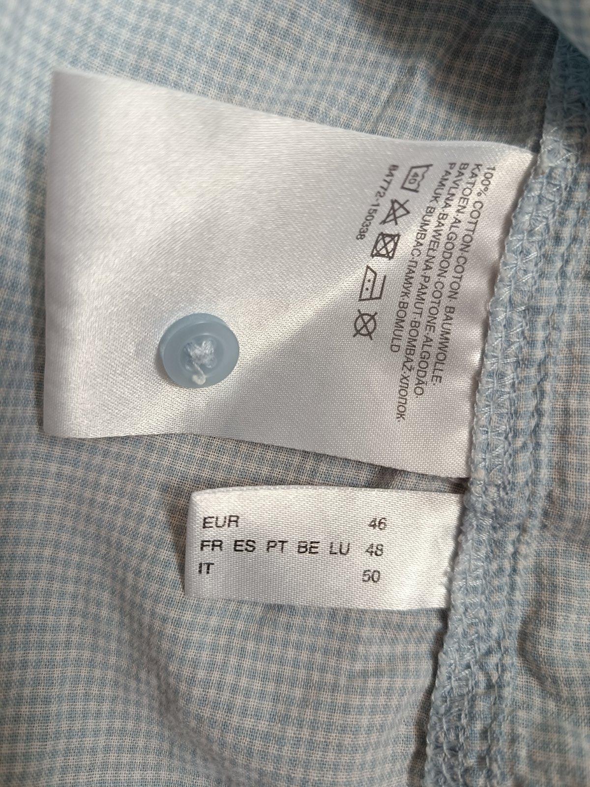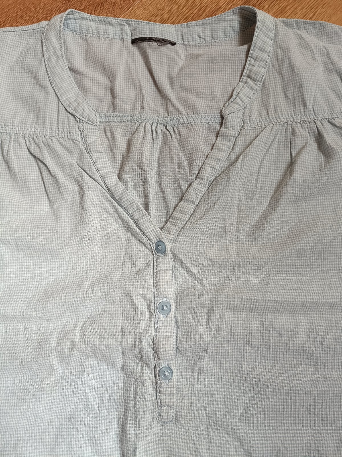 Bluzka je vyrobena z bavlnenej latky v bledomodrej farbe. Ma kratke rukavy a zapinanie na gombiky.
