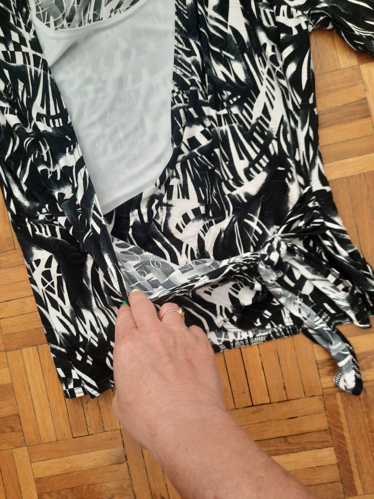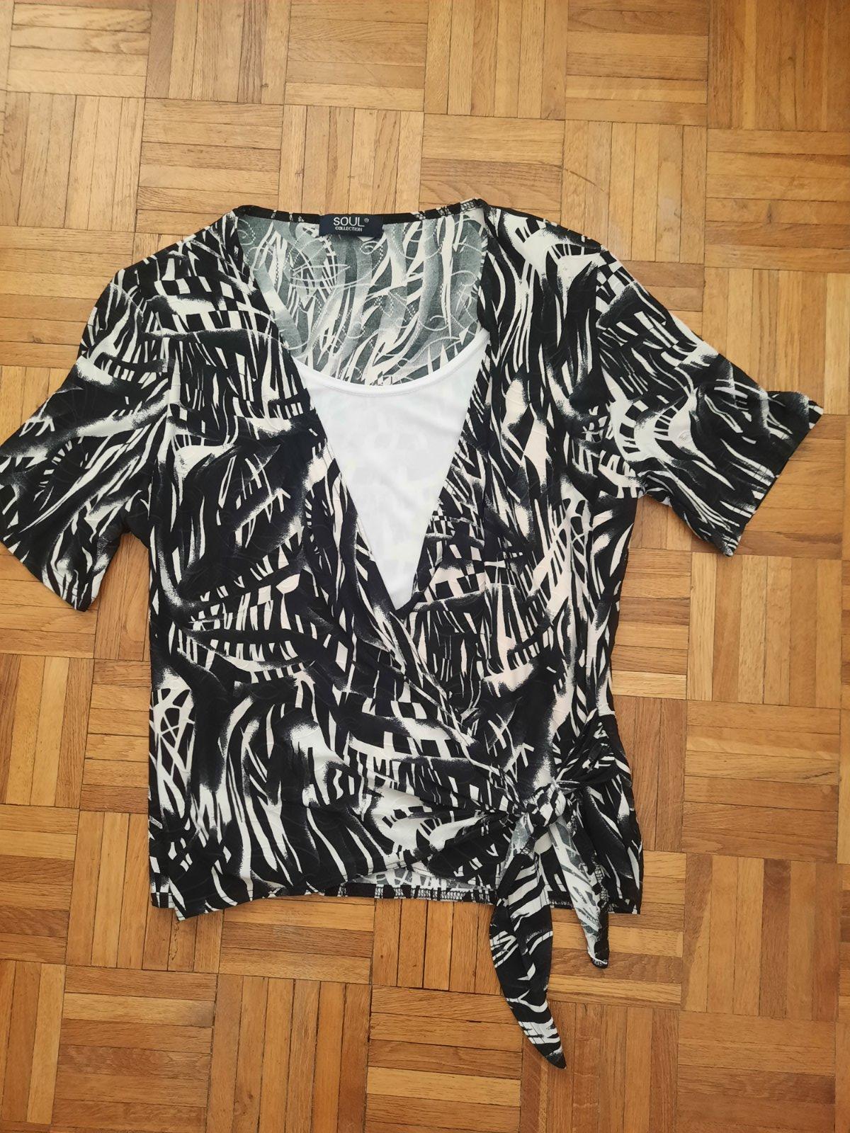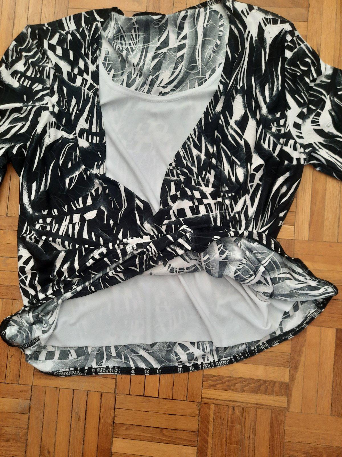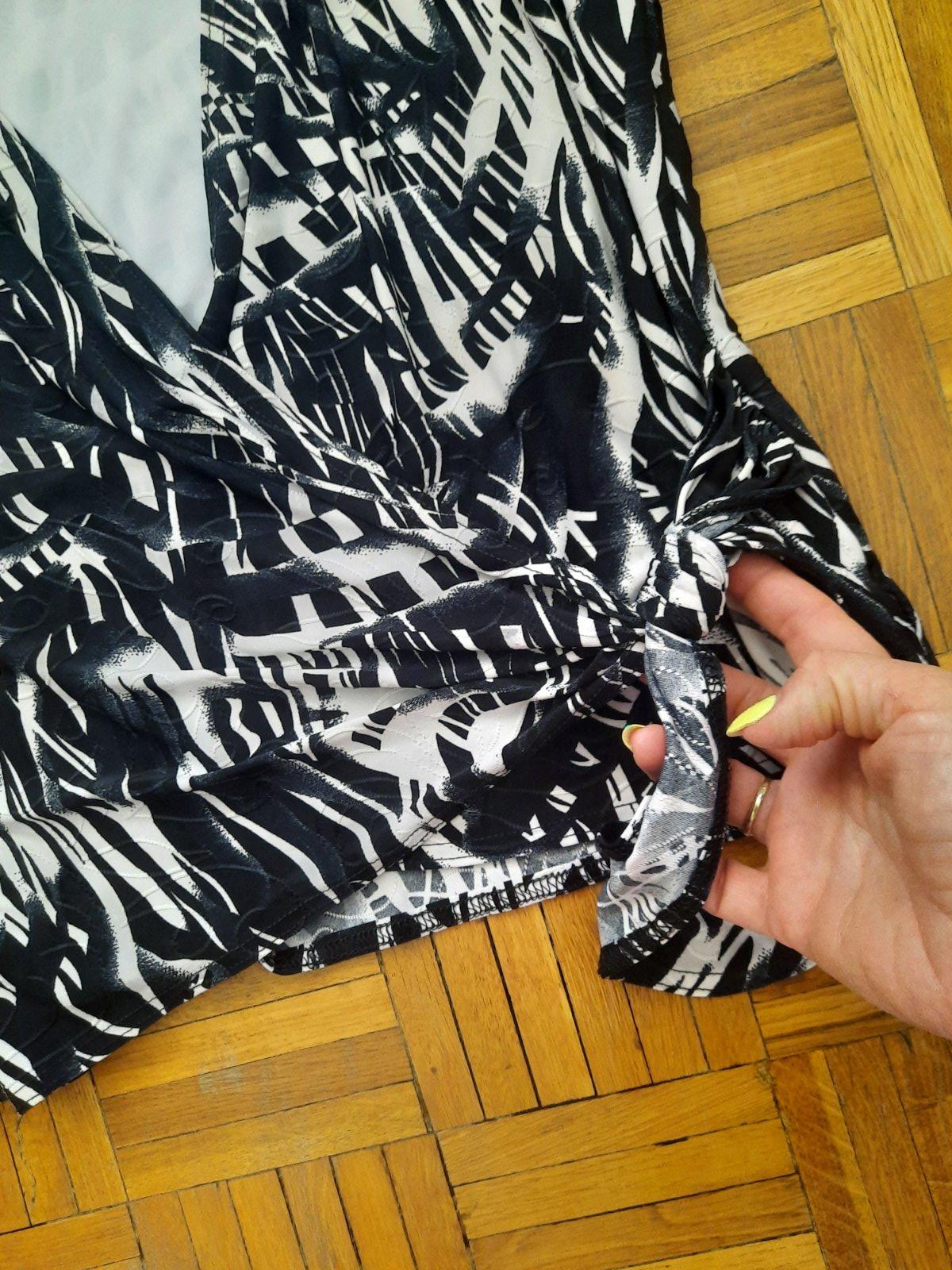 Krásny a zaujímavo šitý elegantný top zo super nekrčivého elastického materiálu. Vpredu je dvojitá vrstva- je podšitá bielou látkou. Tá vzorovaná látka je vpredu prekrížená a zaväzuje sa na uzol. Je ako nový.