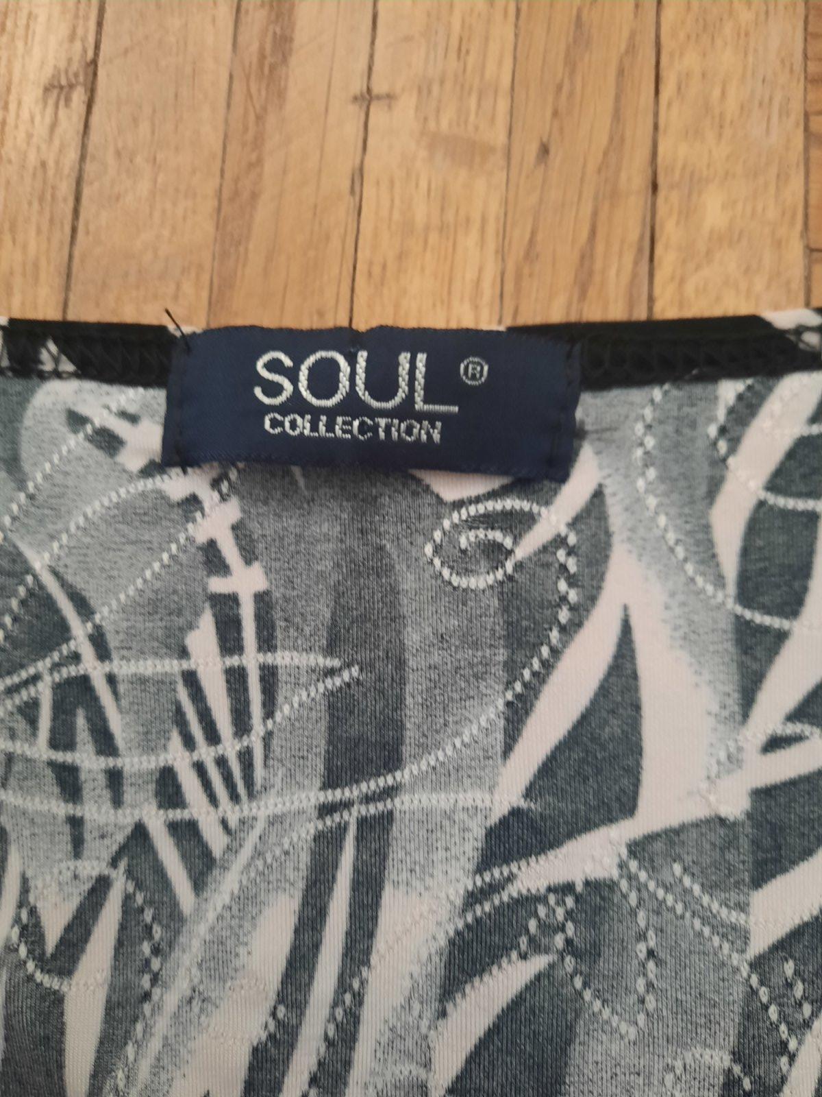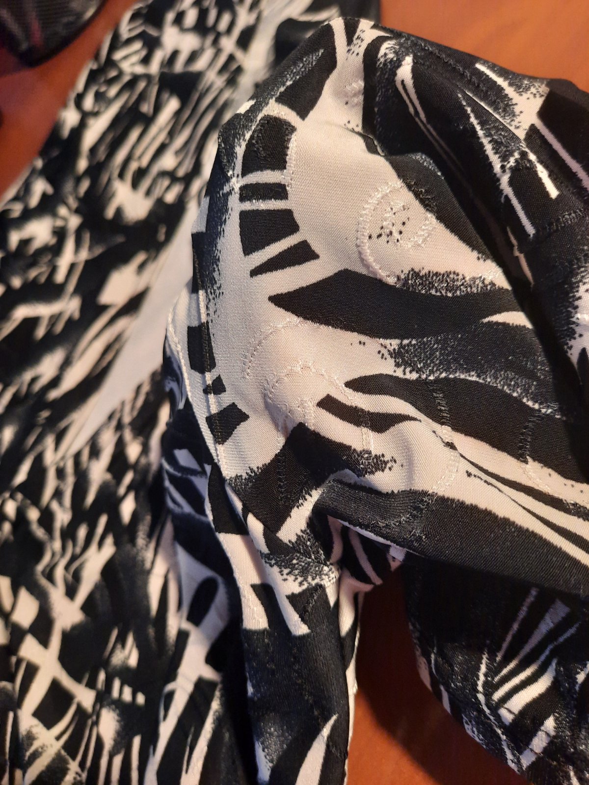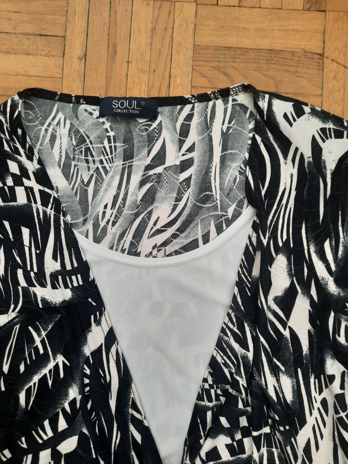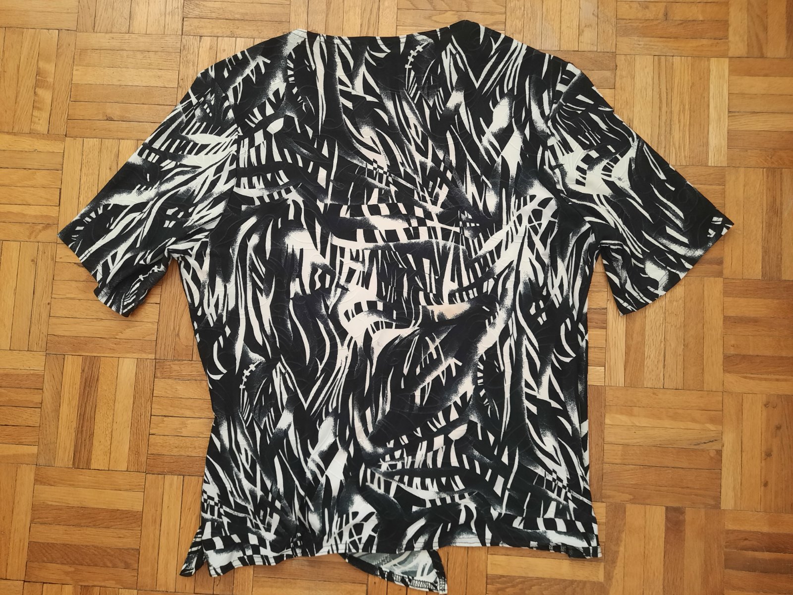 Krásny a zaujímavo šitý elegantný top zo super nekrčivého elastického materiálu. Vpredu je dvojitá vrstva- je podšitá bielou látkou. Tá vzorovaná látka je vpredu prekrížená a zaväzuje sa na uzol. Je ako nový.