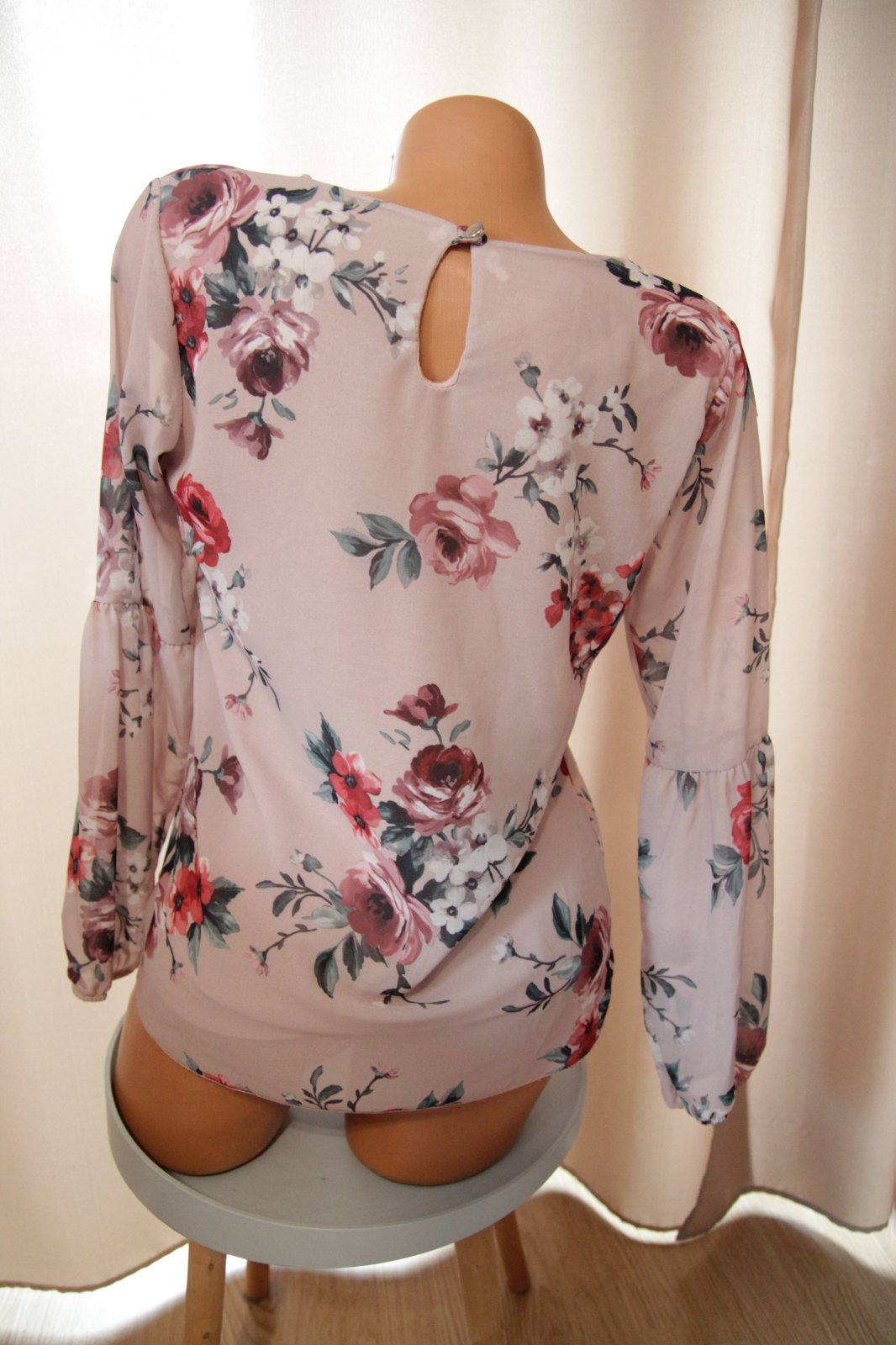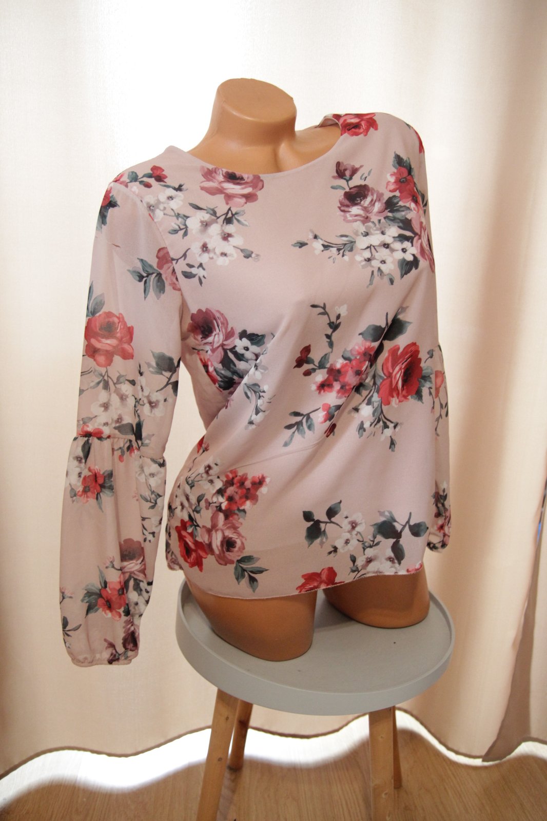 Bledo ružová kvetinová blúzka, na jednom rukáve je roztrhnutá, inak pekný stav. Veľkosť M.