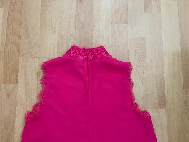 Letna bluzka/ halenka v trendy ruzovo-cyklamenovej farbe, volnejsieho strihu rozsirujuceho sa do tvaru pismena "A". V hornej casti zdobena cipkou a priehladnou castou. Zapina sa vzadu na 2 gombiky, ktore nie je po zapnuti vidiet. Velkost S, sirka cez prsia v kludnom stave 43 cm, dlzka 64,5 cm. V pripade zaujmu k nej mam aj pasujuce nausnice.
