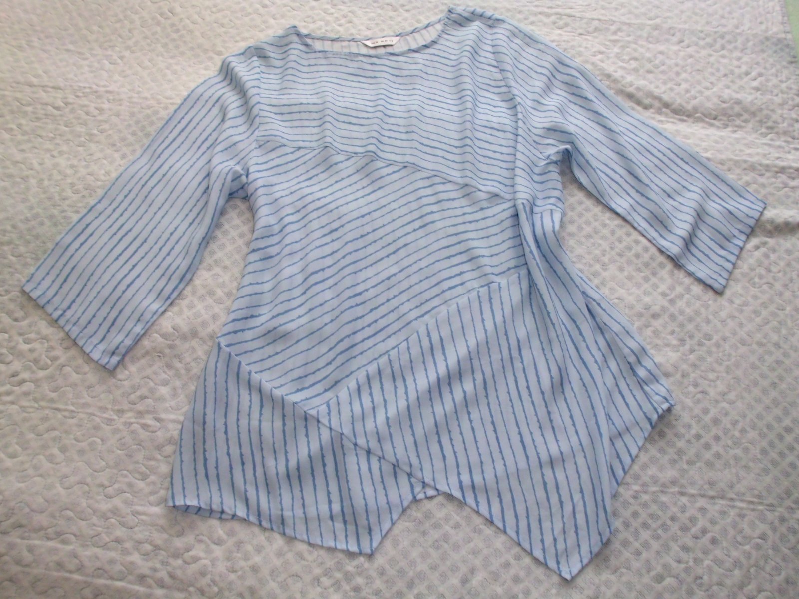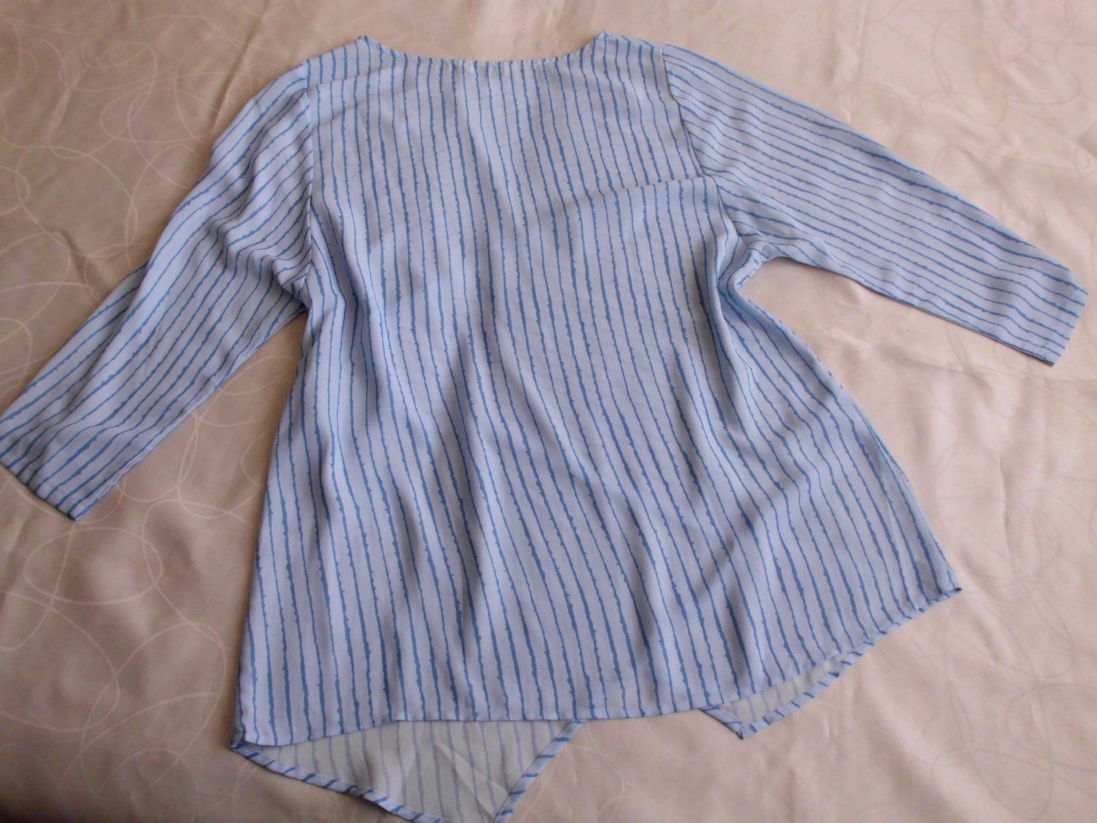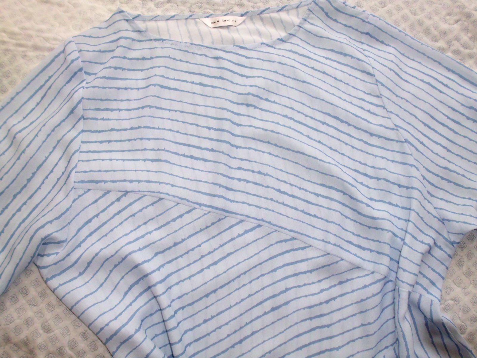 Predám dámsku oversize tuniku blúzku vel. M-L-XL . šírka 56 cm, zadná dĺžka 72 cm, rukáv 50 cm od pleca, ľahký tenší materiál , bledomodrá + tmavšie modré pásy farba , 2x oblečená, top stav