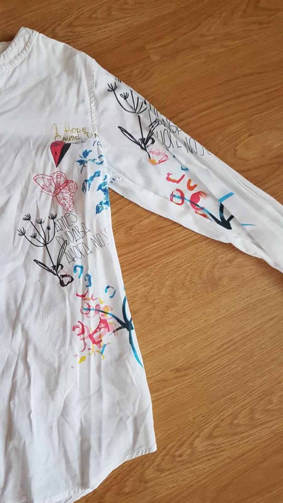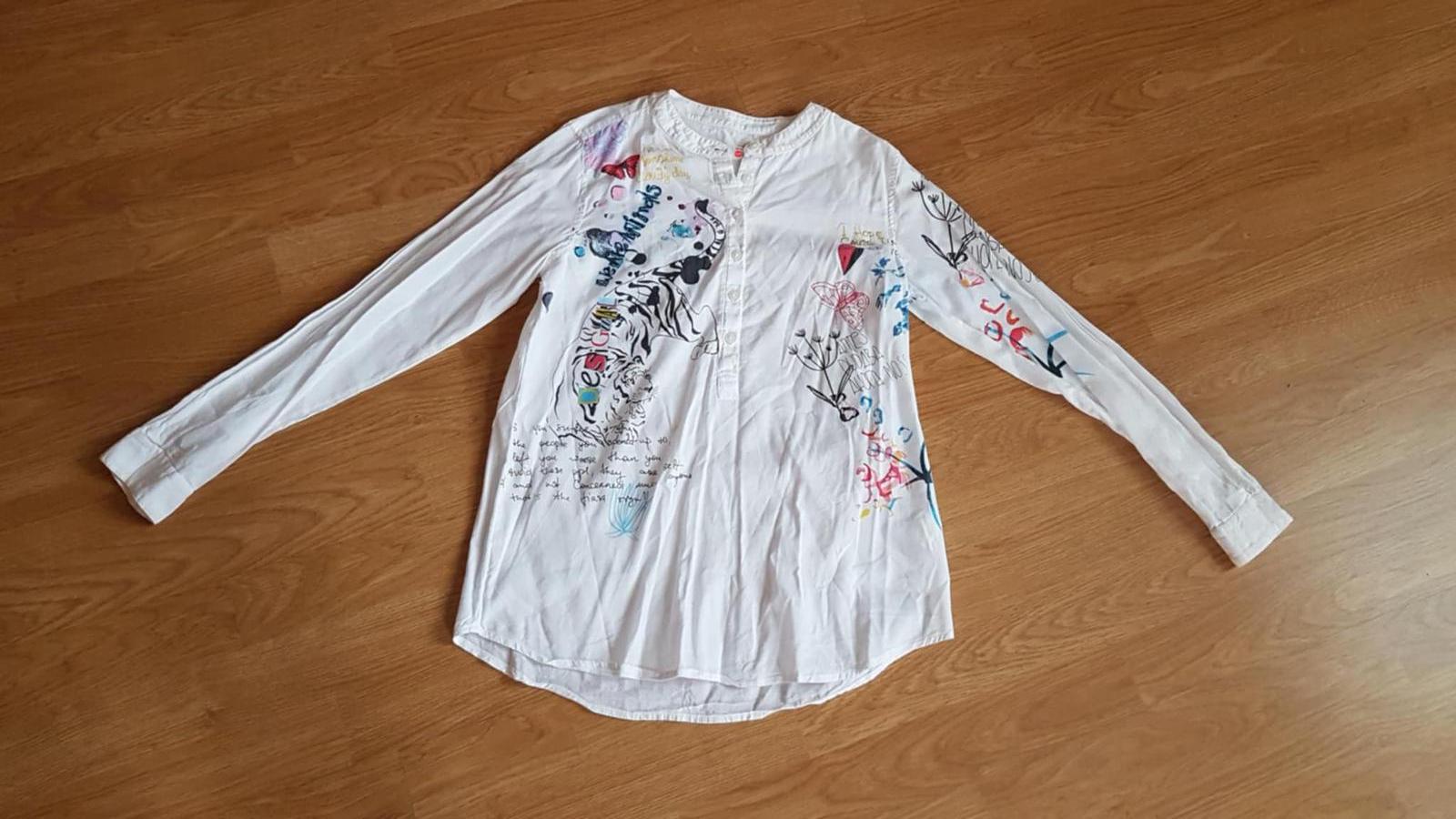 pekná košeľa s potlačou vo výbornom stave, na boku má z vnútra náhradný gombík.