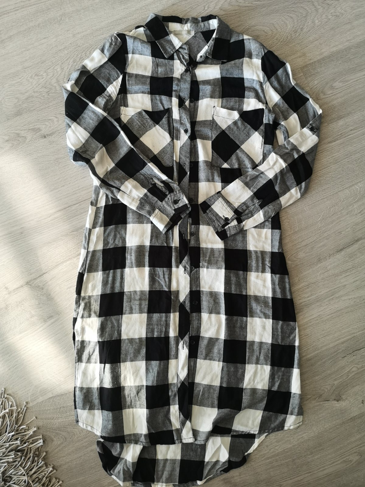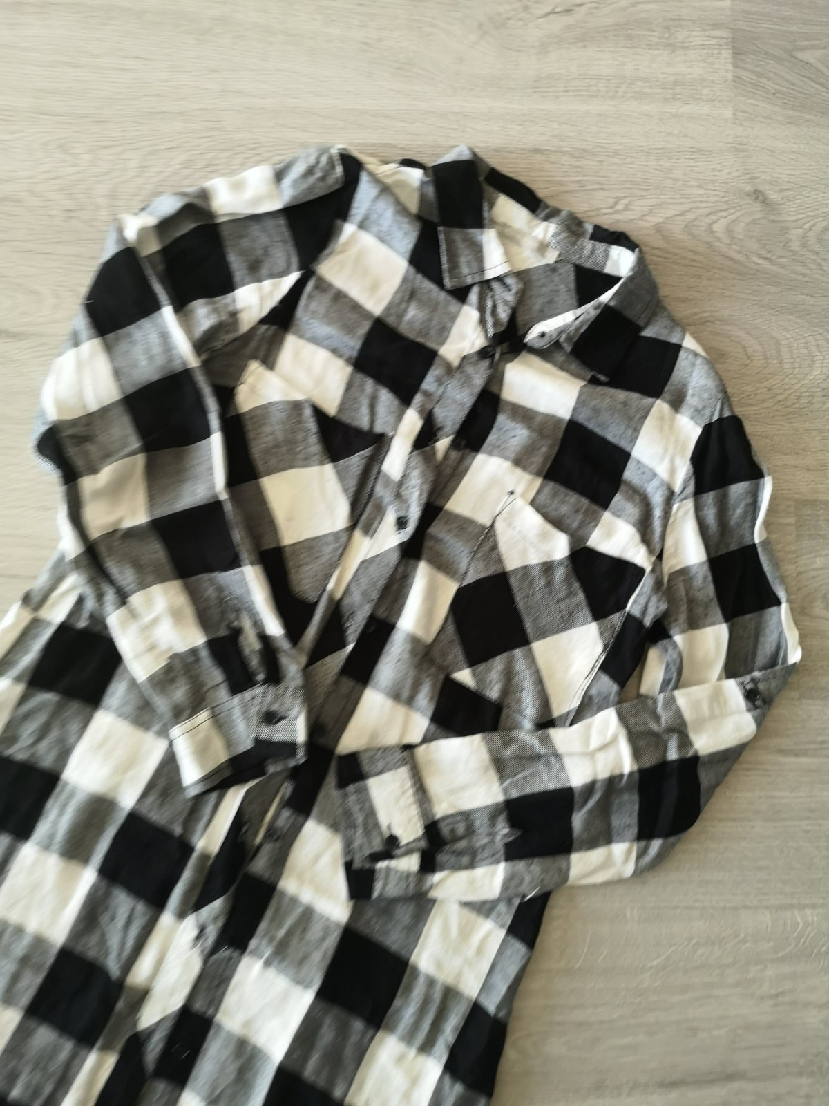 Predám dlhu károvanu košeľu, velkost 34. Dĺžka 104 cm, šírka 42 cm, slzka rukavu 60 cm.