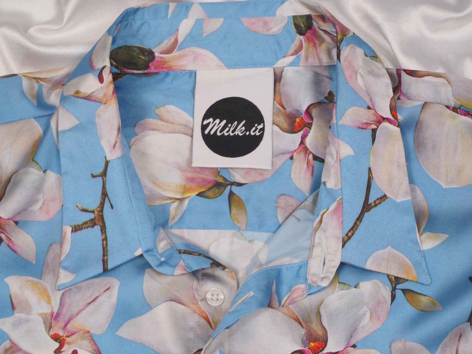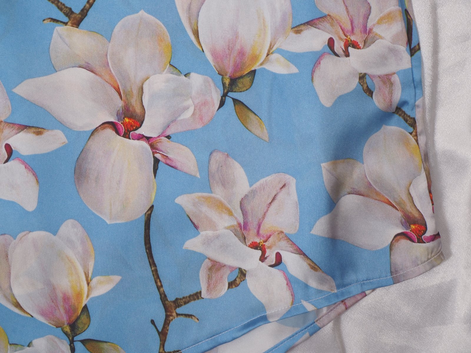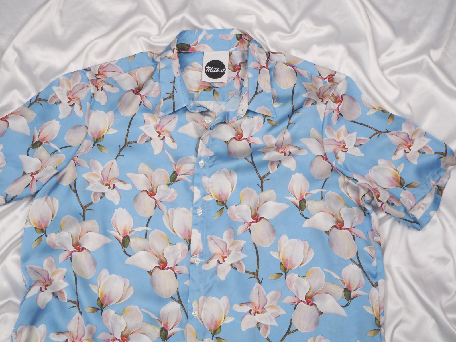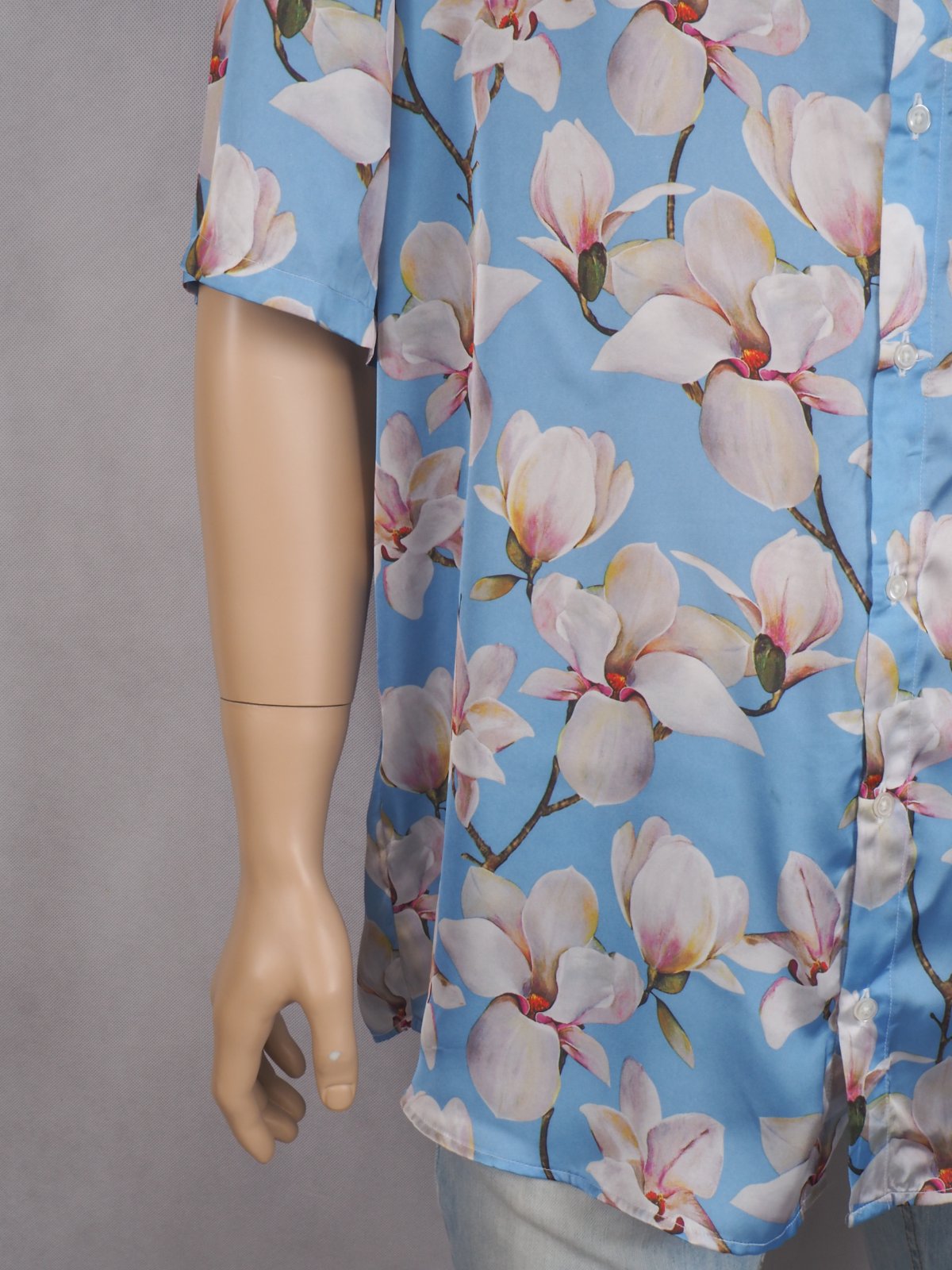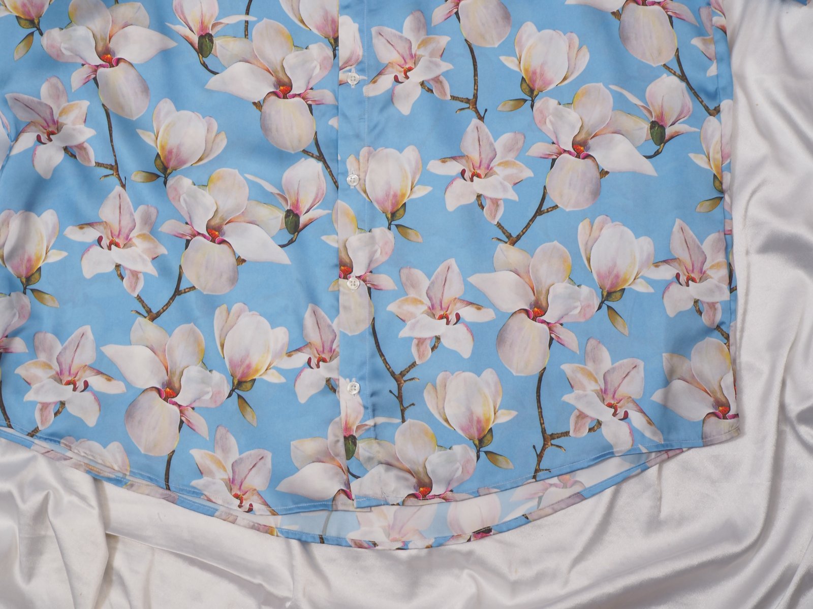 Kvalitná saténová košeľa, modrej farby s krásnou potlačou, materiál 100% polyester, super stav.