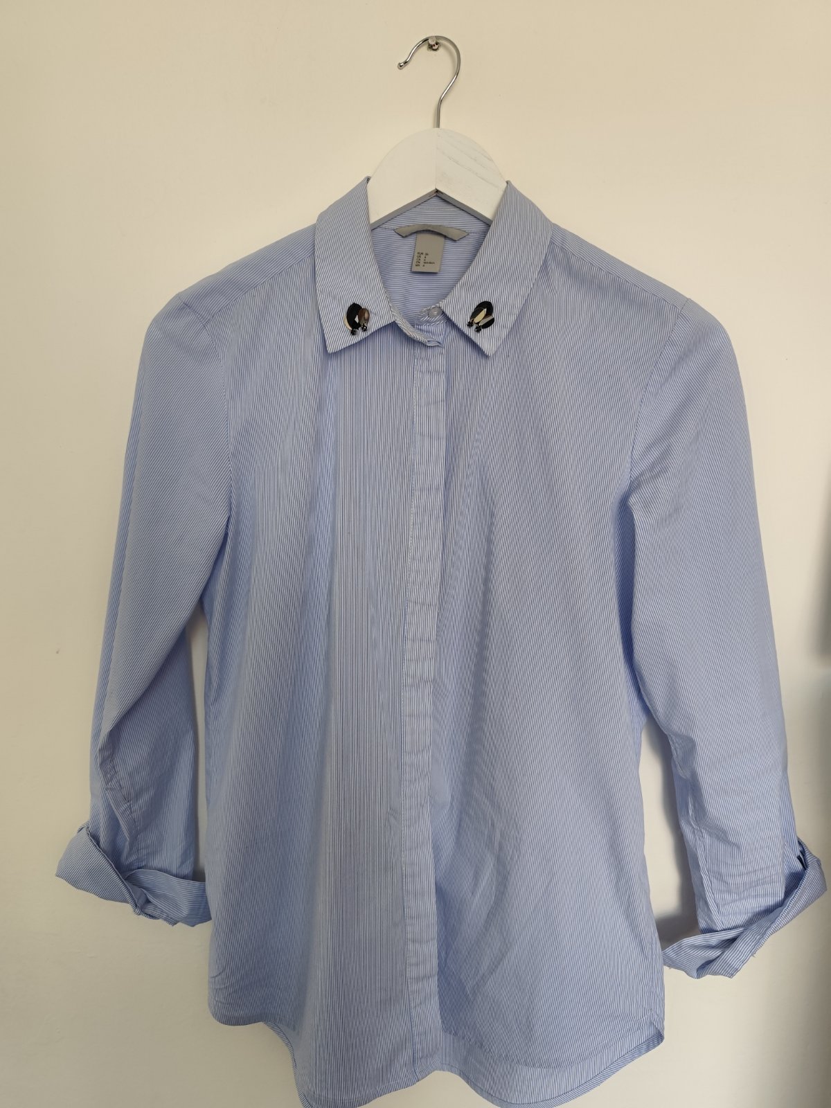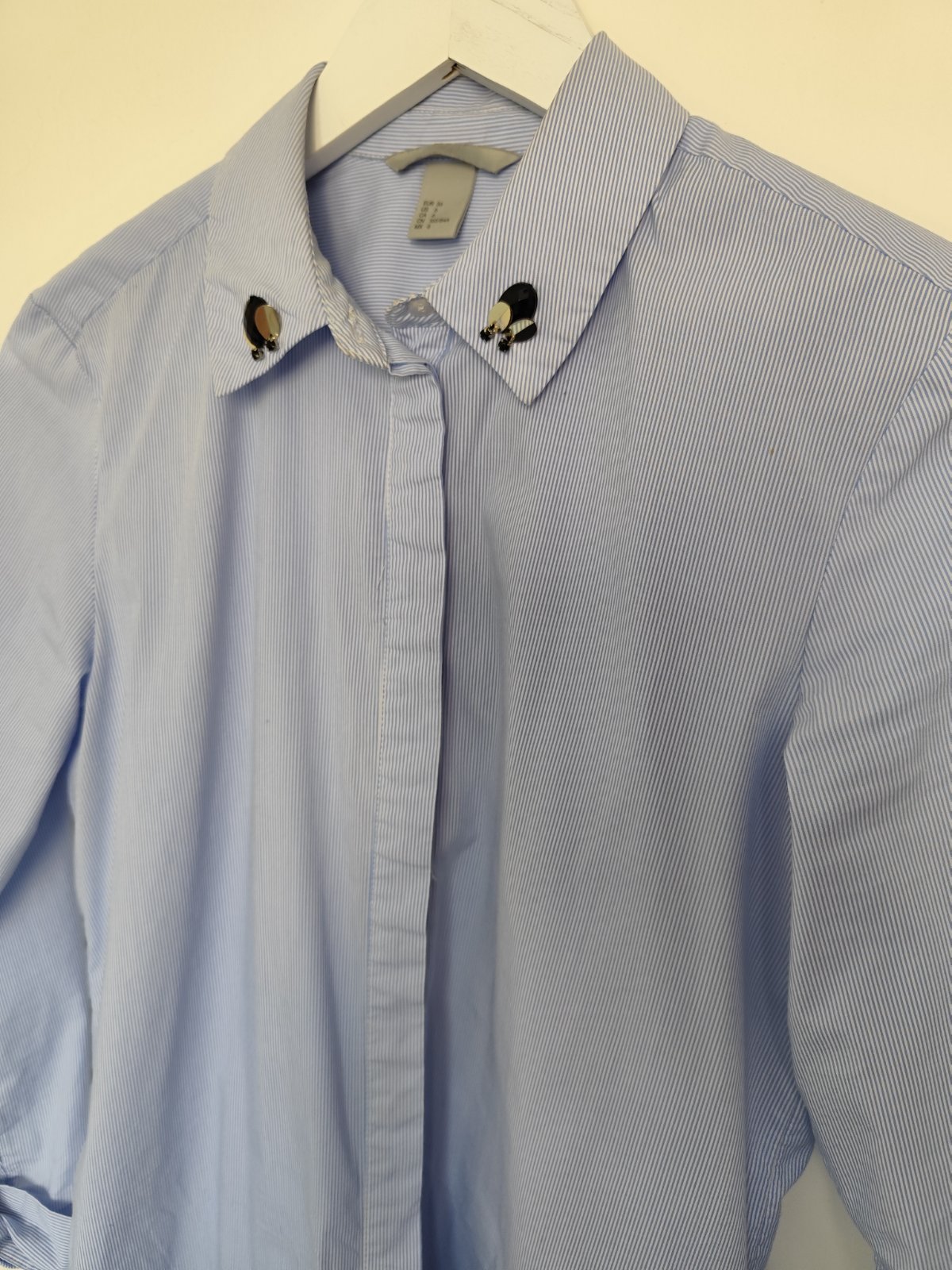 Predám svetlomodrú blúzku z mäkkej tkaniny s úzkym golierom, zapínaním na skryté gombíky a sedlom so zámikom na chrbte. Voľný rovný strih, dlhé rukávy s gombíkmi na manžetách a zaoblený spodný lem....