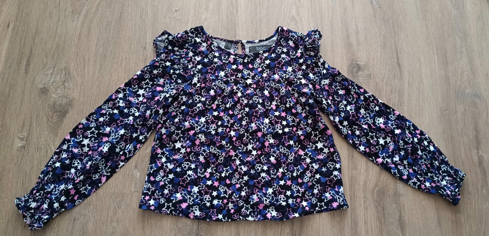 Blúzka top stav, oblečená 1x, dĺžka od ramena 49 cm, rukáv od krku 55 cm. Zdarma doložím legínky Kids, sametkové, rebrované, veľ 128, výborný stav, oblečené asi 2x, dĺžka 77 cm, fotené pred opratí...