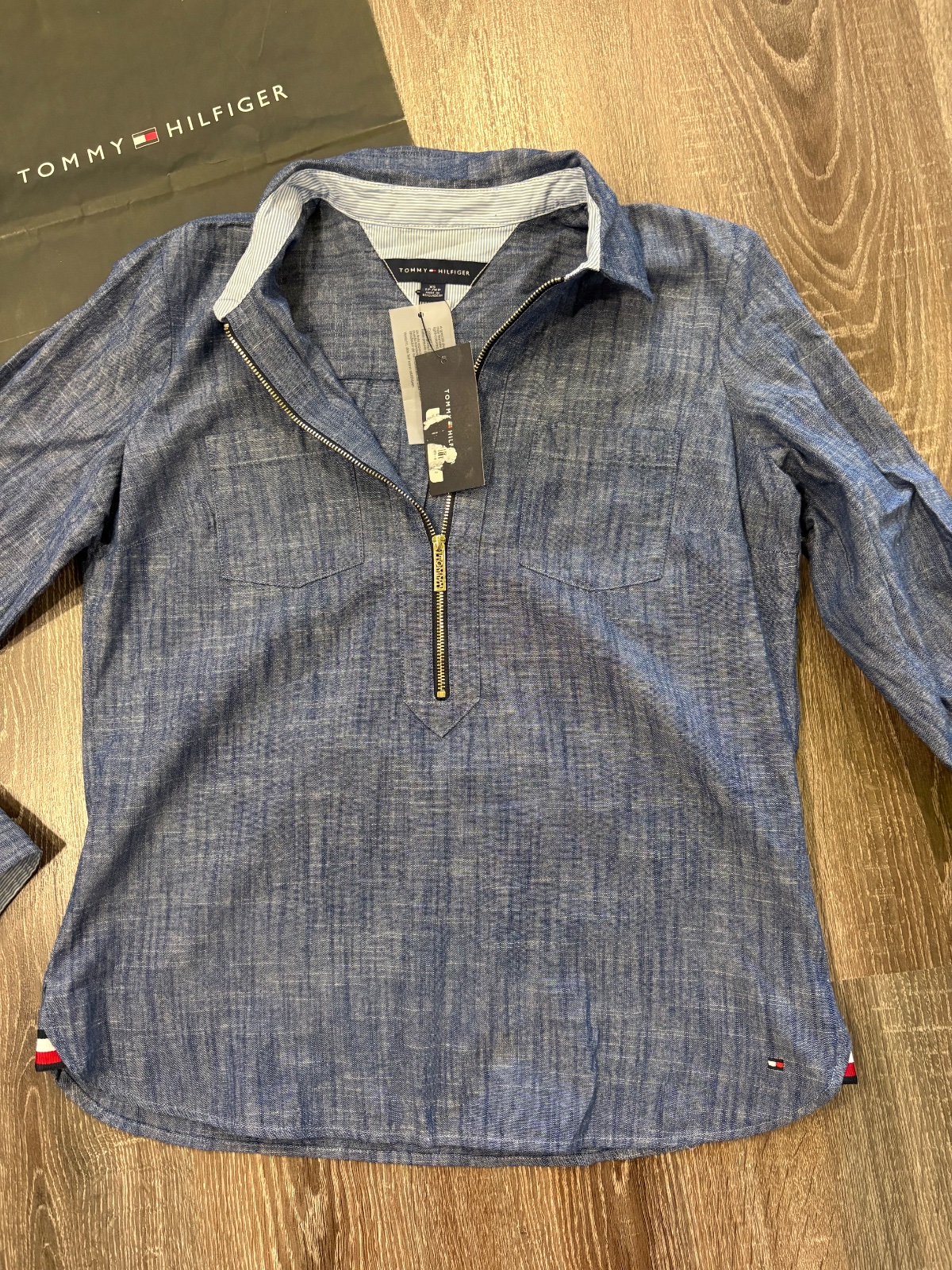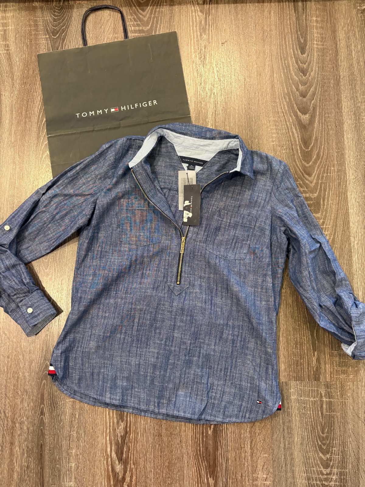 111.Tommy Hilfiger damska kosela z makkej rifloviny vo velkosti XS-S,rukav si viete vyhrnut a zapnut gombikom.Dlzka je 62cm,dlzka rukava od krku je 72cm,sirka v podpazusi je 50x2cm