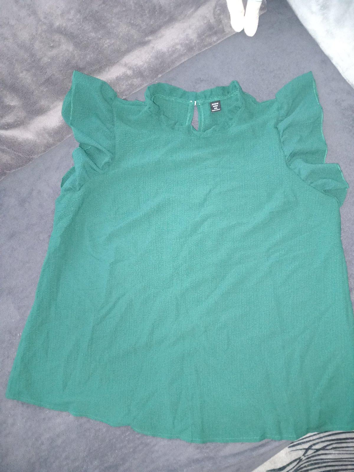 Skvelá na leto,je to trochu väčšia 44,na rukávoch sú viazačky, v skutočnosti je prekrásna tyrkysová farba, ktorá sa nedá nafotiť, najviac je podobná 1.fotke.Prsia 58 x2, dlžka 71 vpredu, vzadu 73 c...