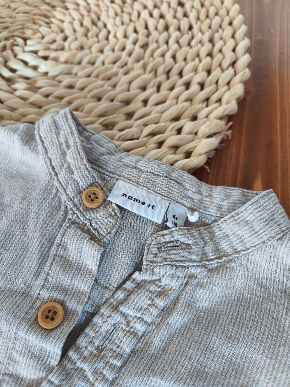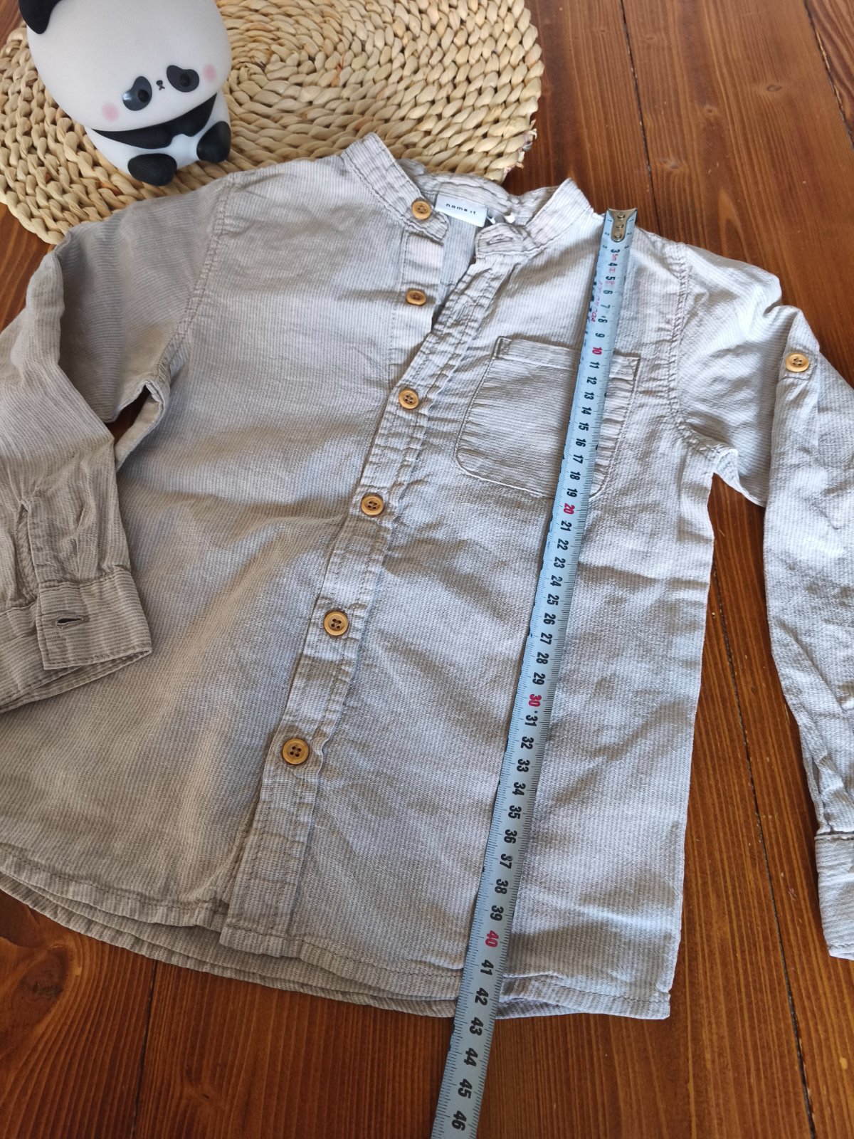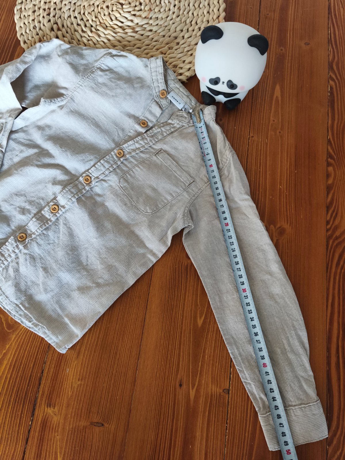 Pásikavá lanová košiela vo veľmi zachovalom stave. Rukáv sa dá vyhrnúť. Veľkosť je síce uvedené 116, no nositeľná je už od 110. Rozmery uvedené na foto.