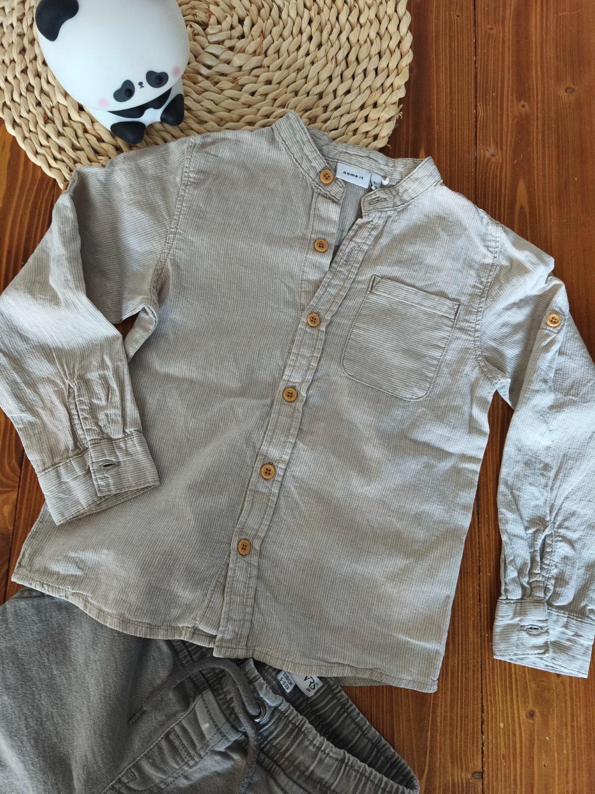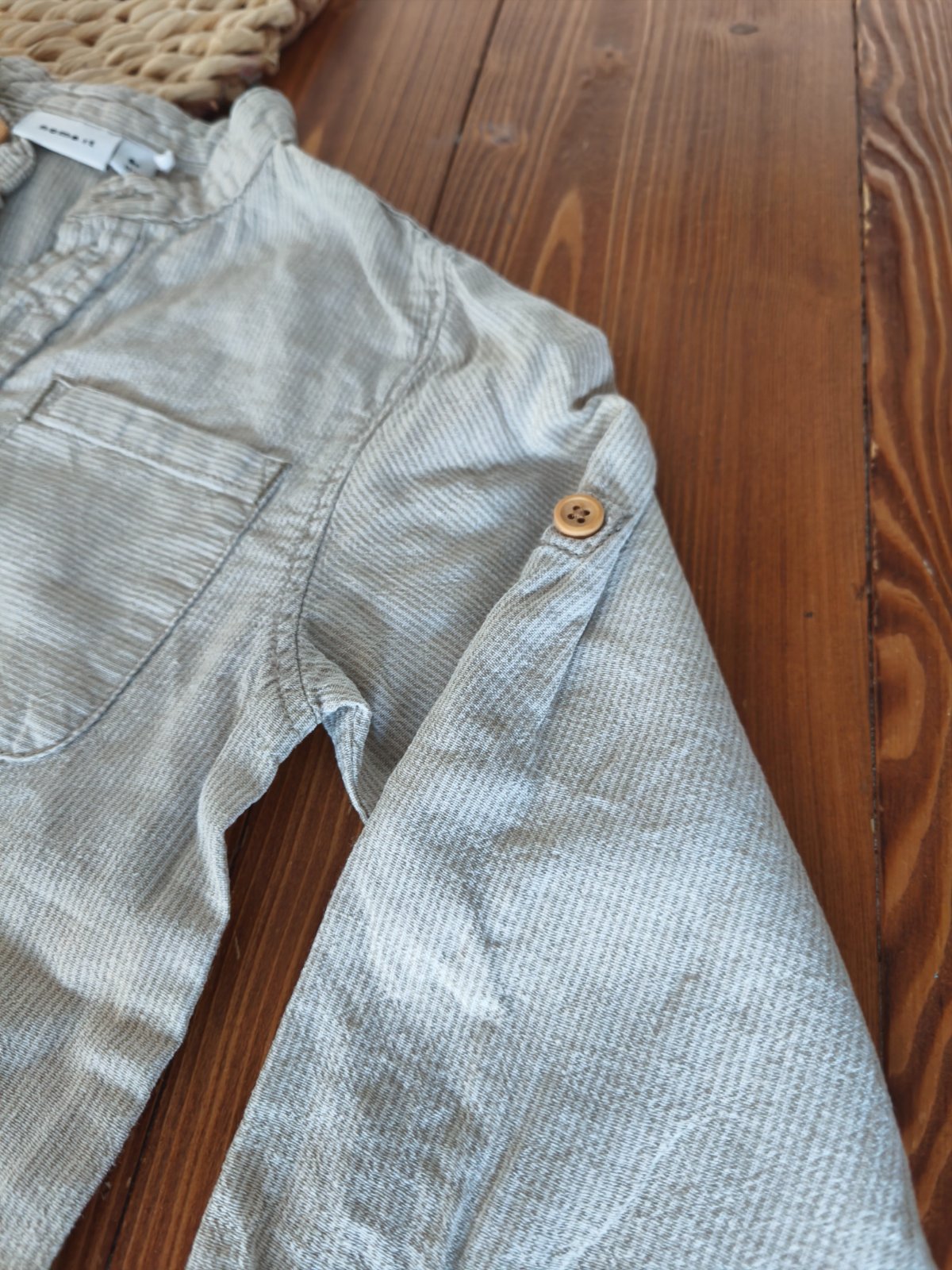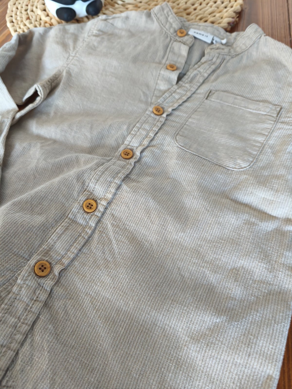 Pásikavá lanová košiela vo veľmi zachovalom stave. Rukáv sa dá vyhrnúť. Veľkosť je síce uvedené 116, no nositeľná je už od 110. Rozmery uvedené na foto.