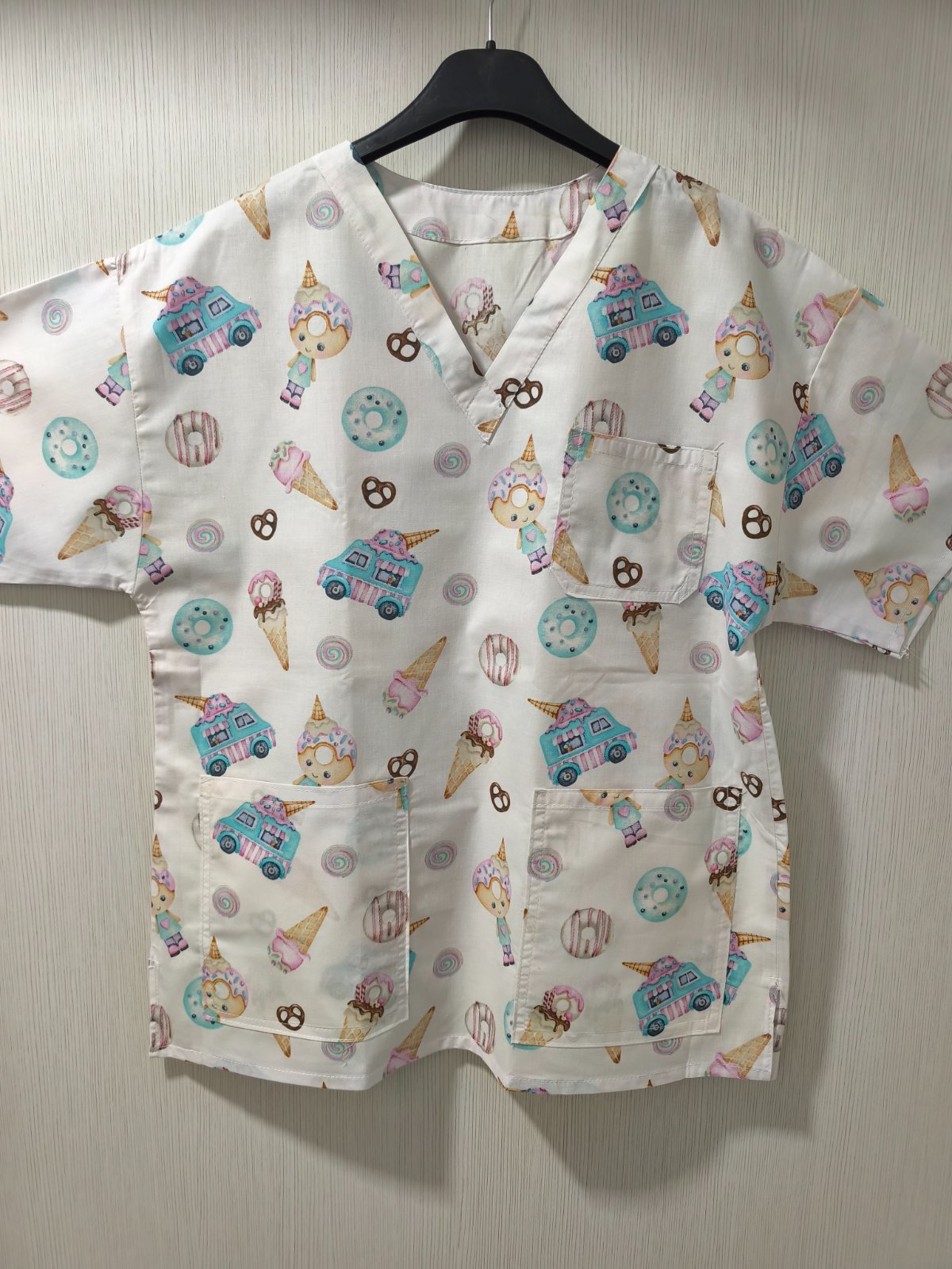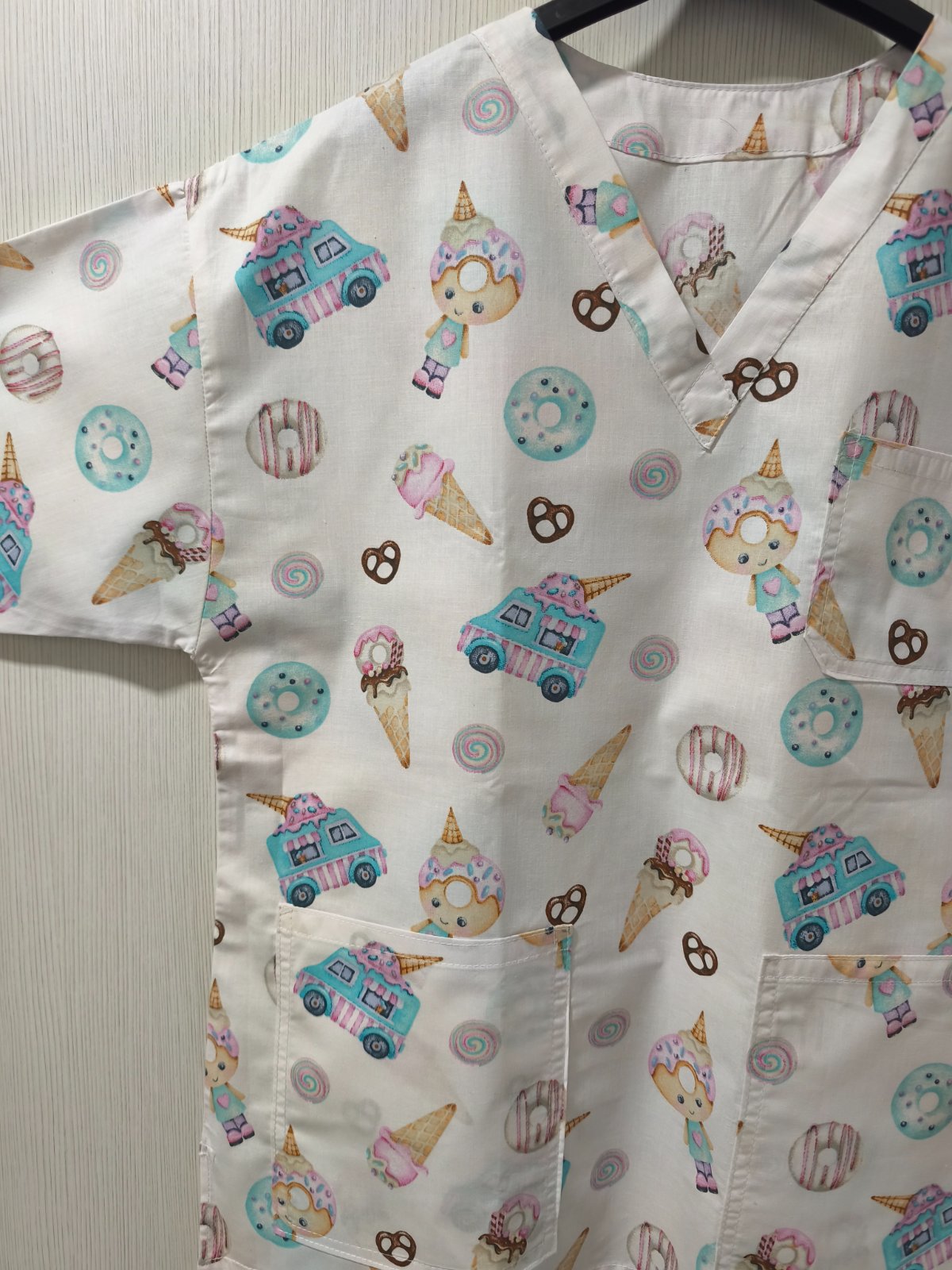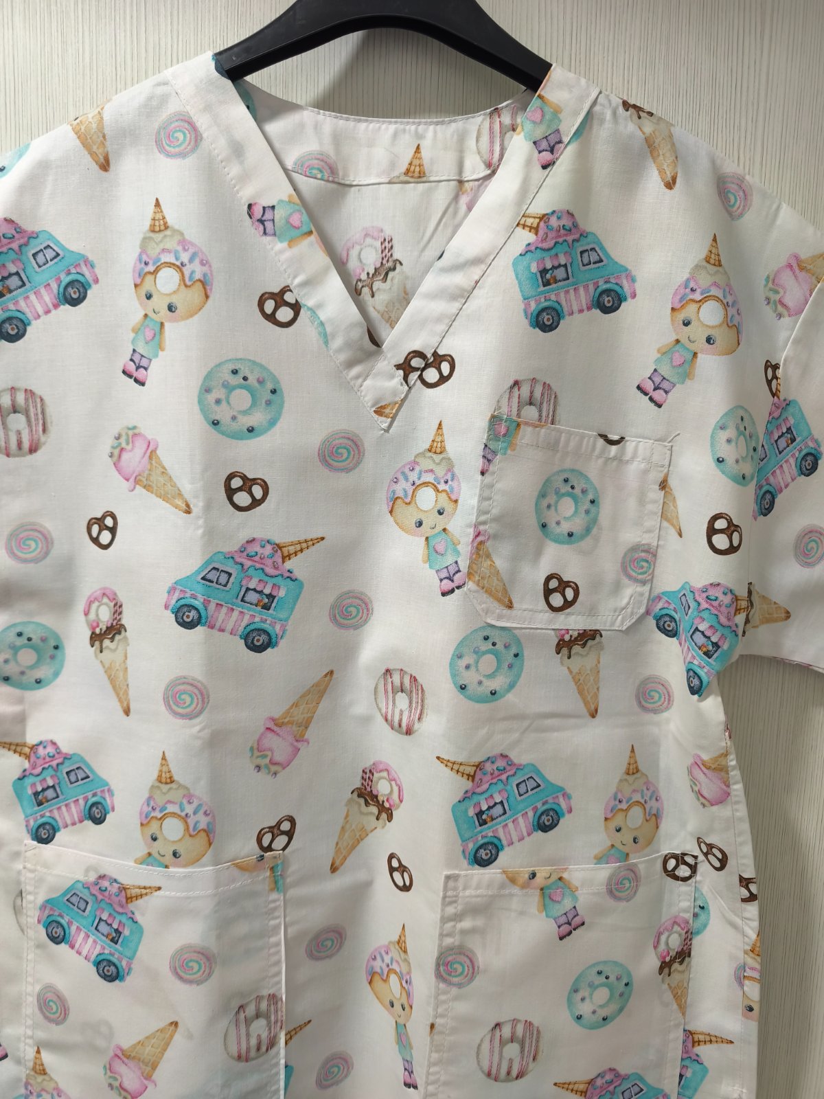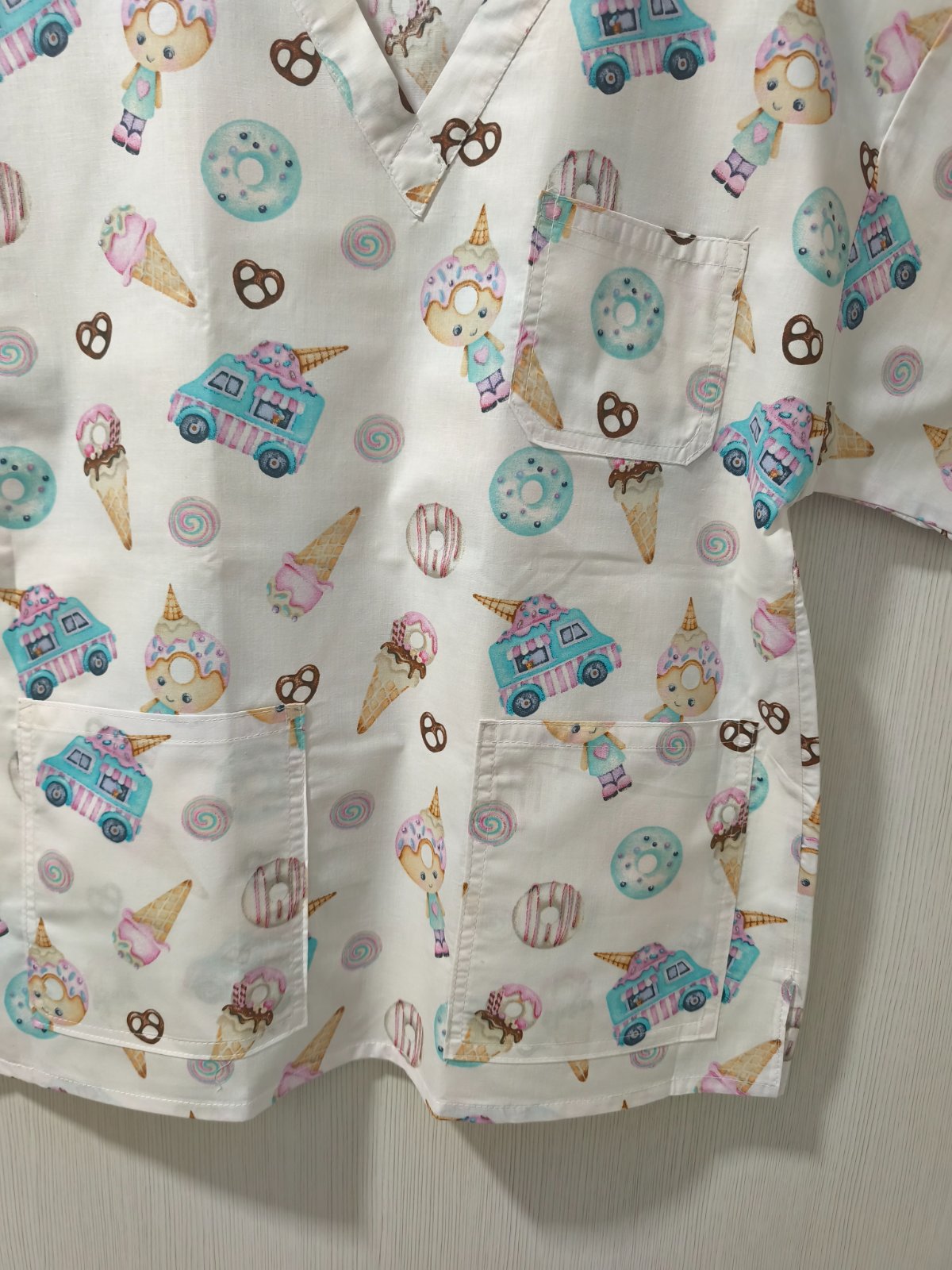 Zdravotnícka blúza bielej farby so vzorom cukráreň nádherný pestrý vzor .