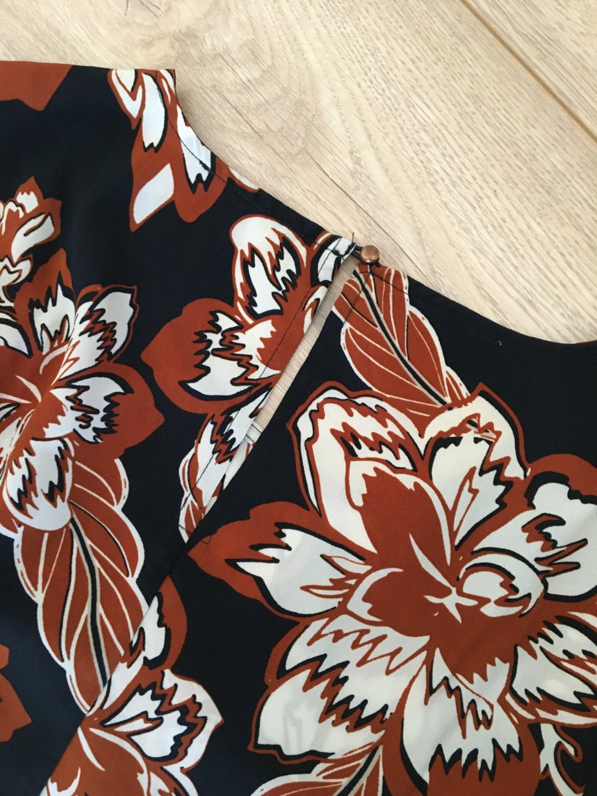 Predám dámsku kvetinovú blúzku. Blúzka má čierny podklad a na povrchu sú výrazné bielo-hnedé kvetiny. V spodnej časti je jemné nariasená do tvaru A, čo jej pridáva elegantný vzhľad. Blúzka je vhodná k nohaviciam a leginam, ale tiež ku sukni.